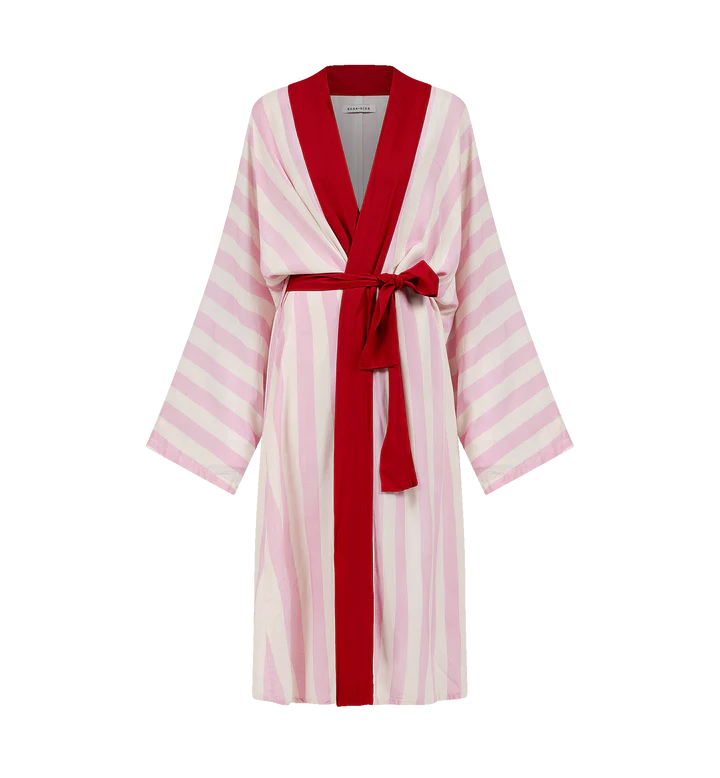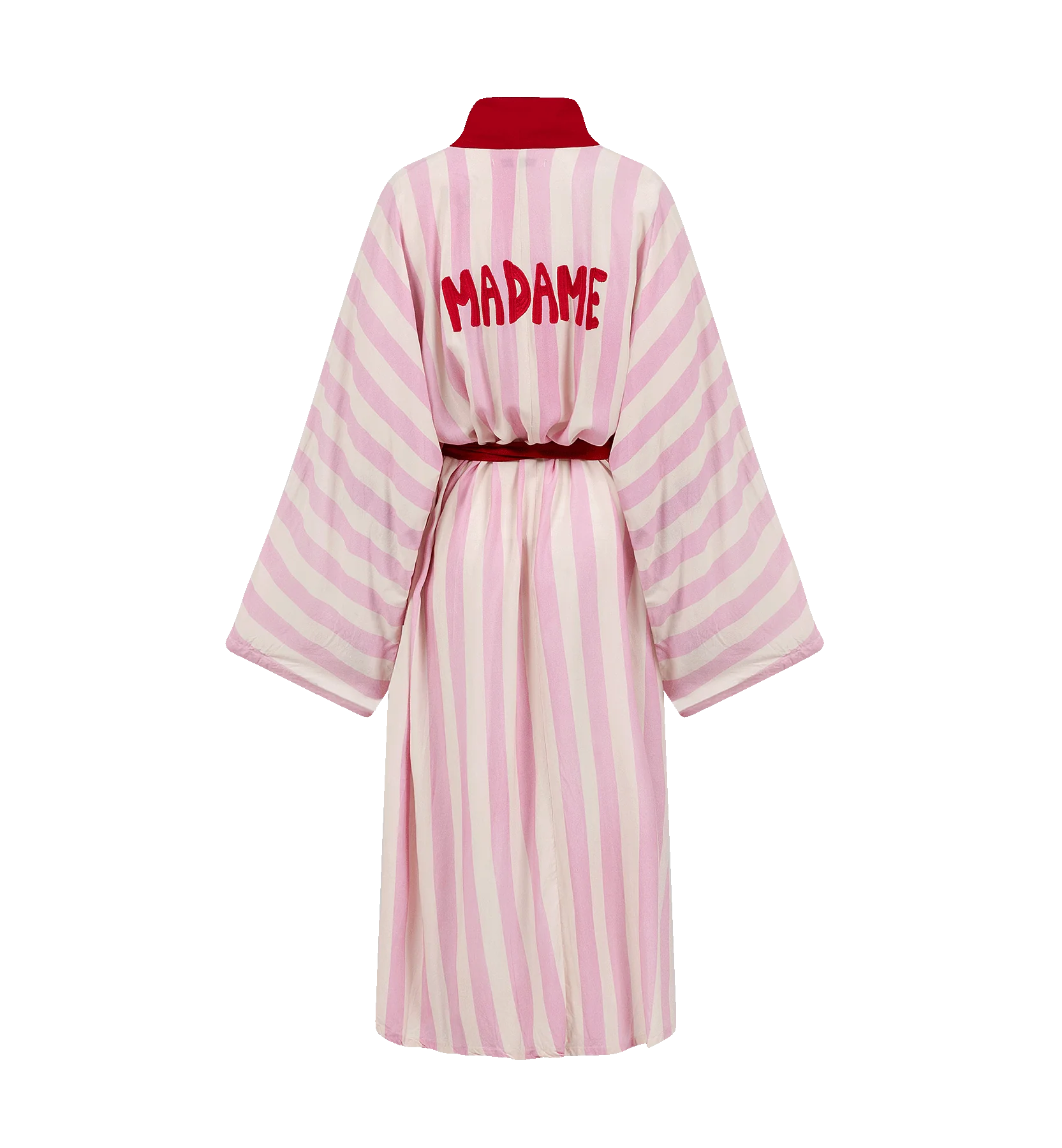 Madame Long Kimono er ditt sommer-must-have! Denne kimonoen er allsidig nok til å kombineres med et kveldsklær eller brukes uformelt på stranden som et cover-up; mulighetene er uendelige! Kimonoen er laget av 100% rayon med broderte bokstaver på ryggen.