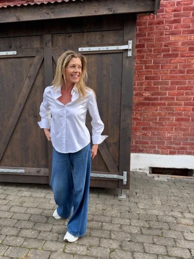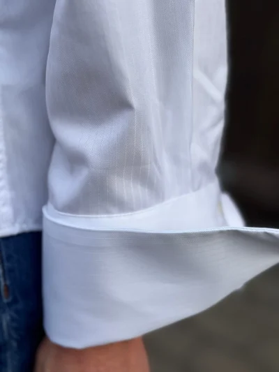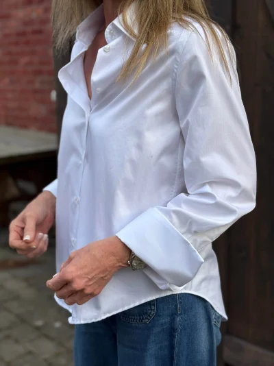 Maya Stripe Shirt fra Hazel – hvit skjorte med fine, diskrete striper og brede mansjetter, laget i myk 100% bomull.