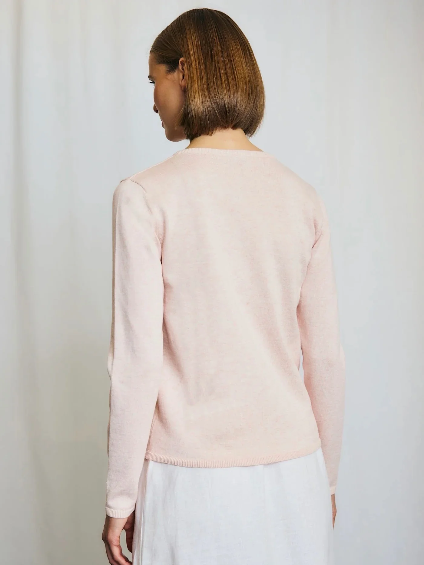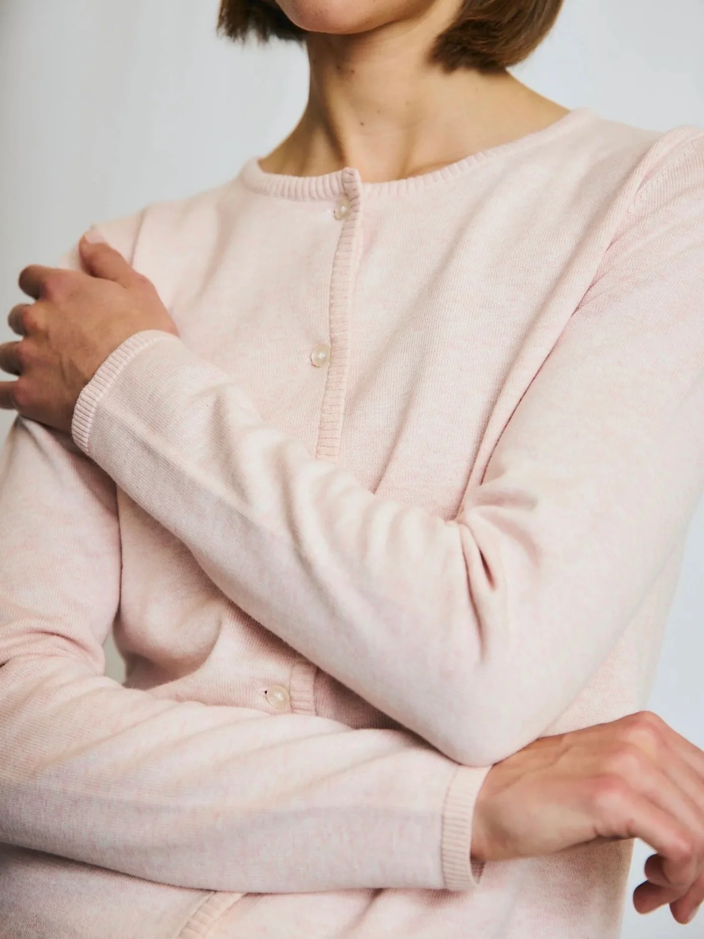 Klassisk cardigan laget i en myk blanding av bomull og kasjmir. Den har ribbestrikkede detaljer på kragen, knappestolpen og ermene, samt perlemorsknapper.
