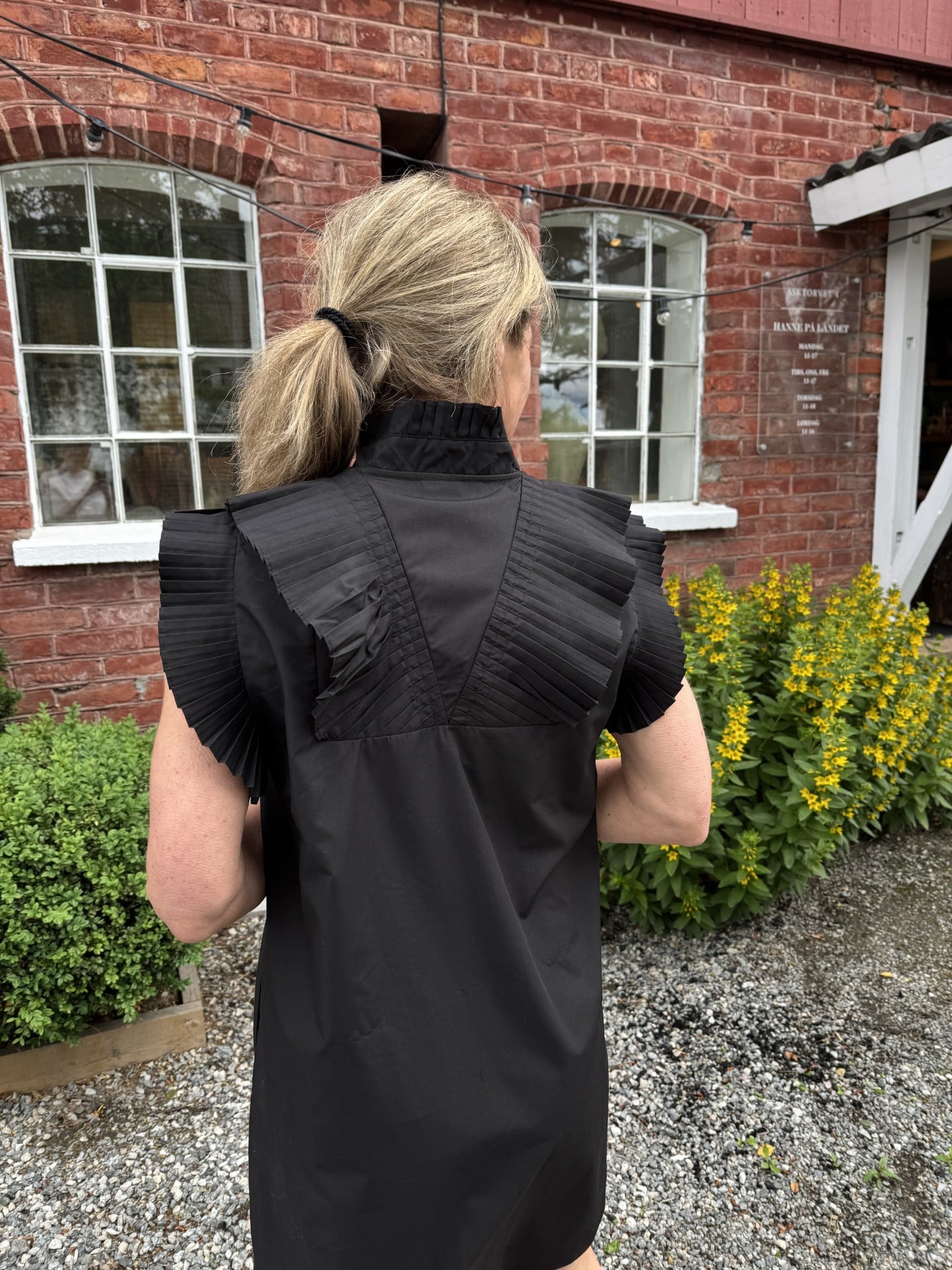 Svart kjole fra Gossia med plisserte detaljer langs kragen og ermene. Snittet er klassisk, men de delikate foldene gir kjolen et lett og elegant preg. Sidelommer gjør den både praktisk og behagelig å bruke.