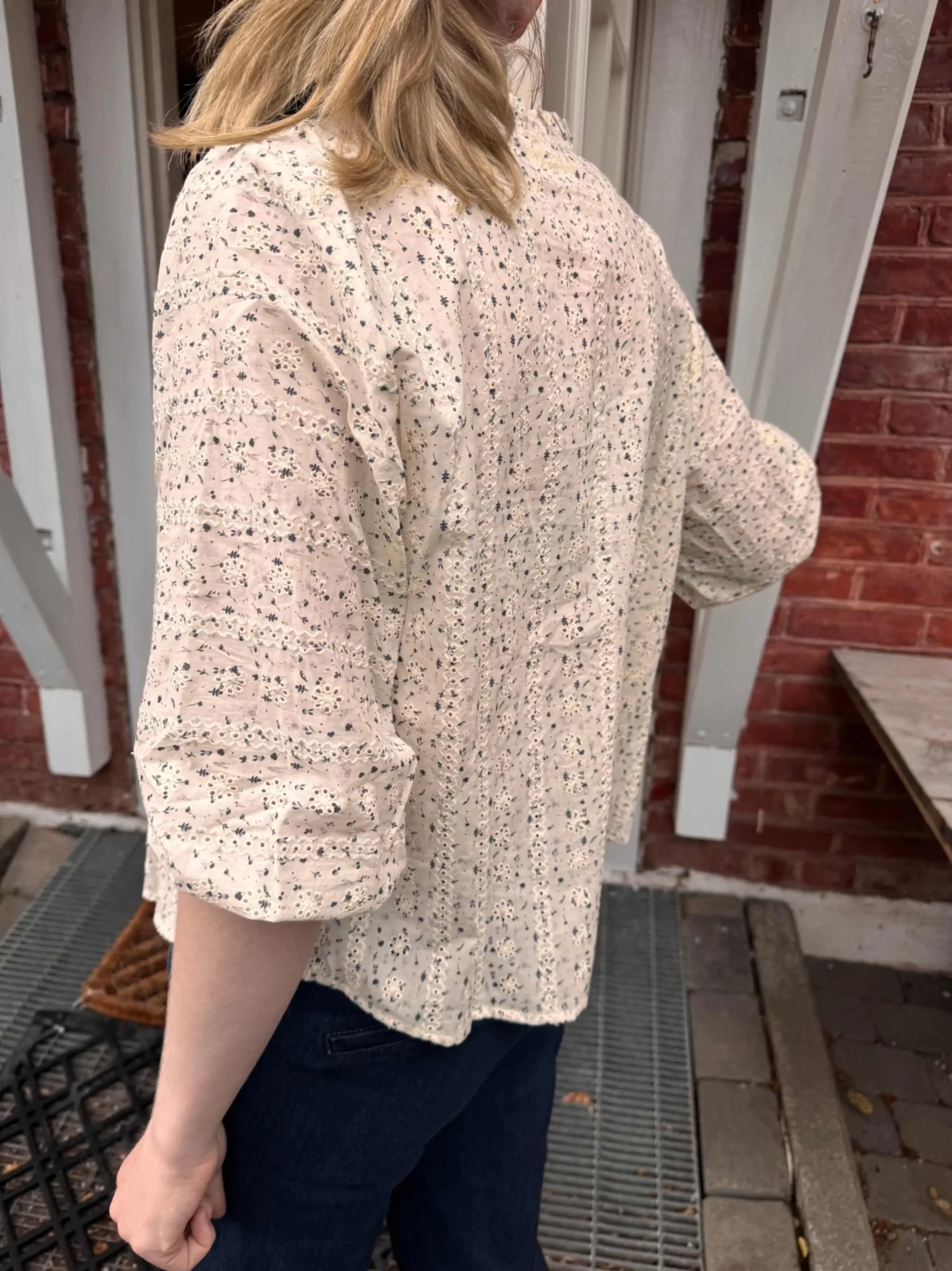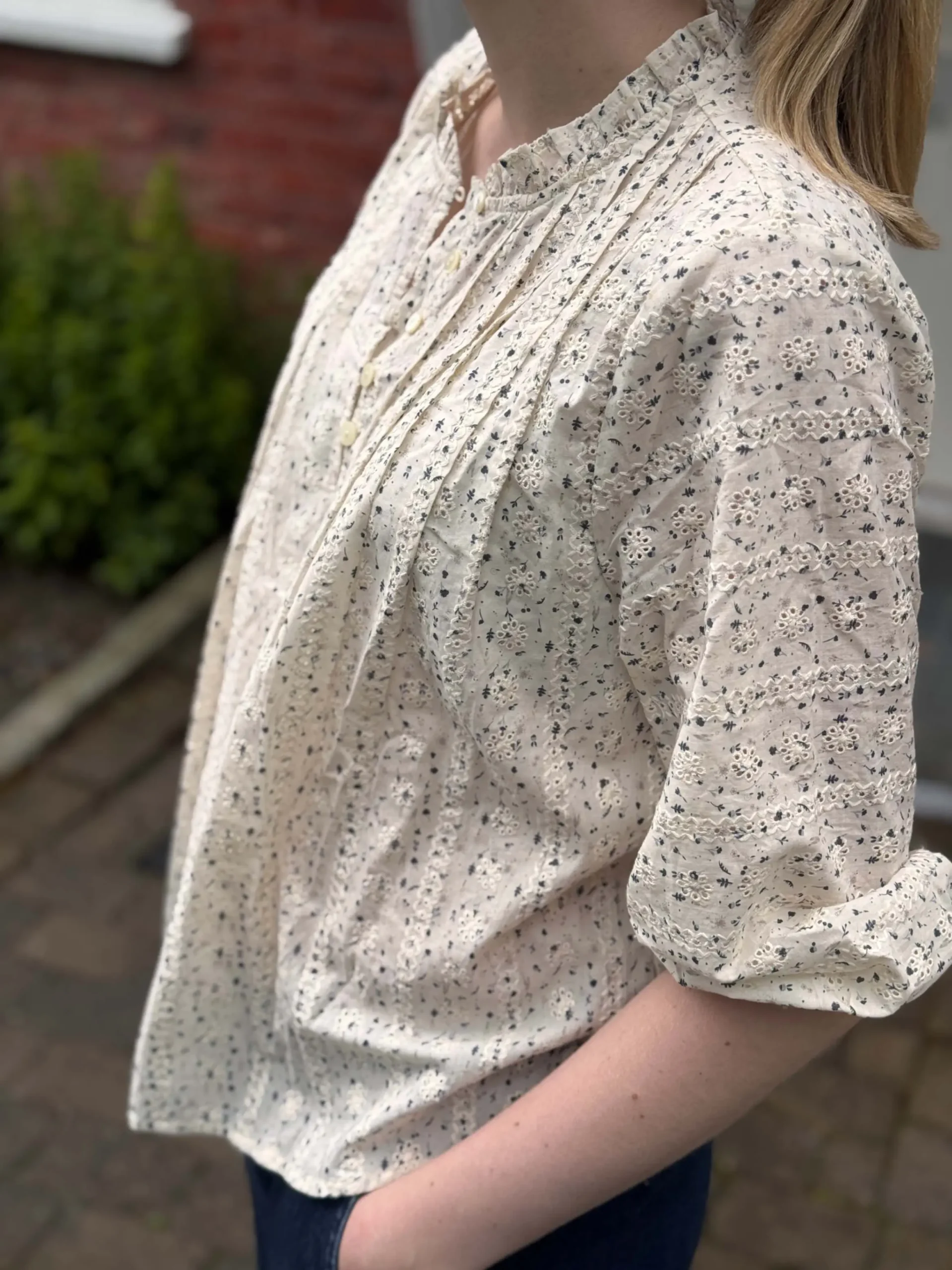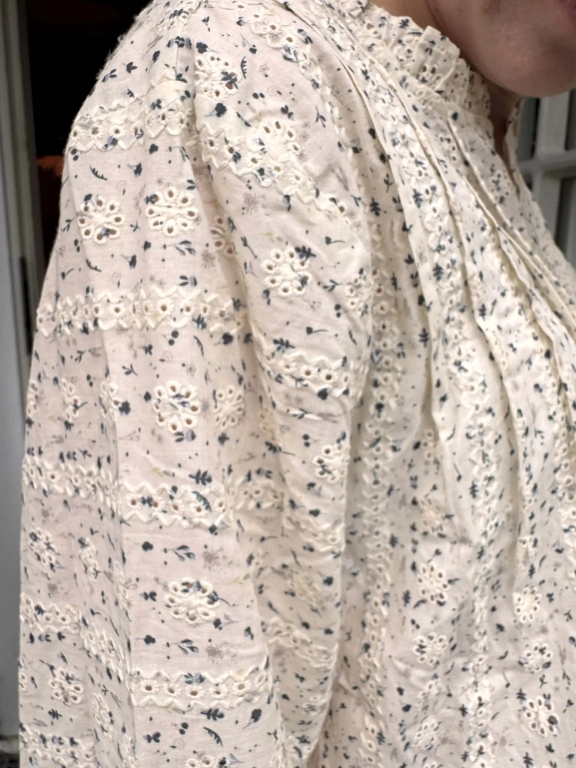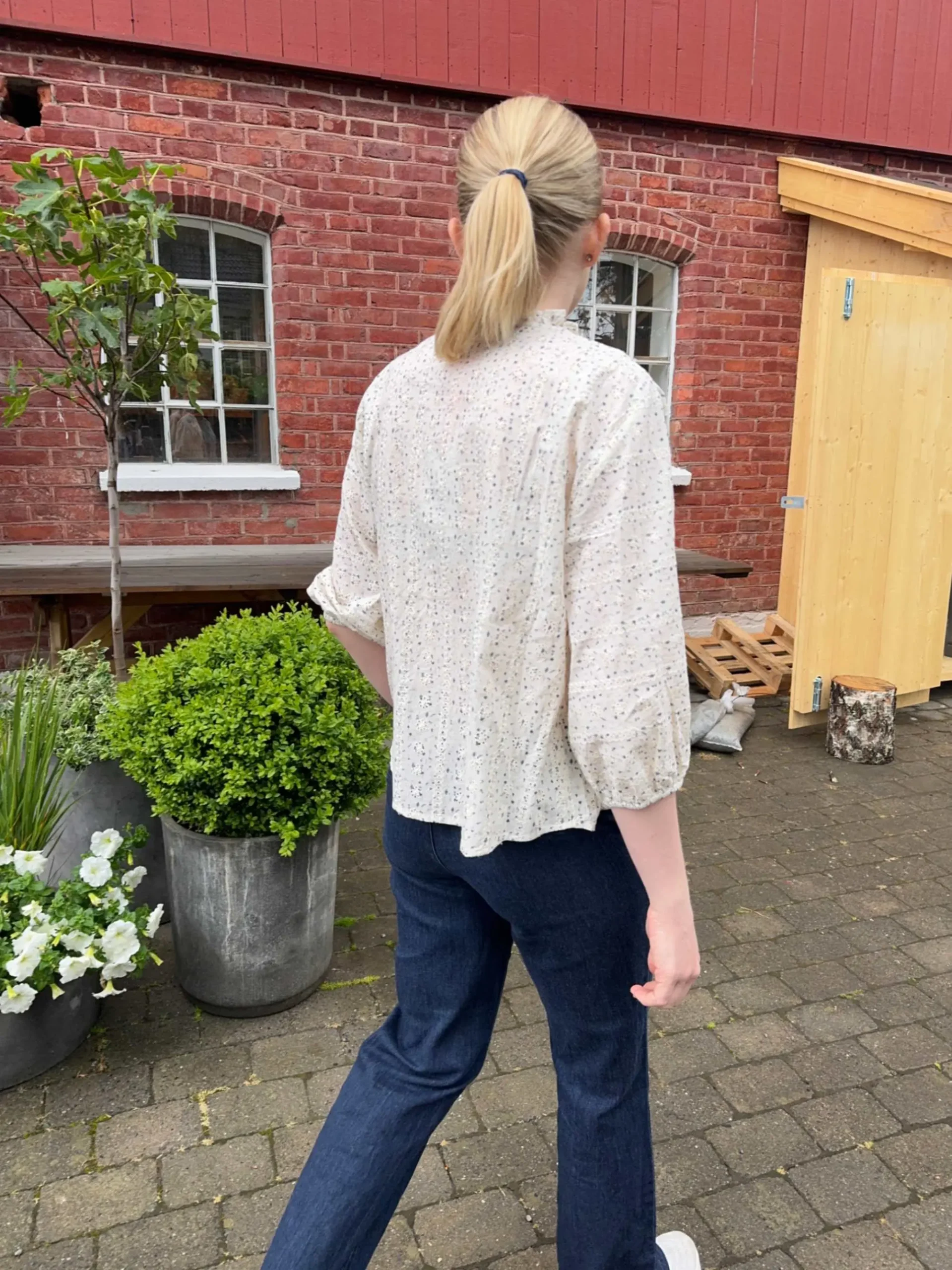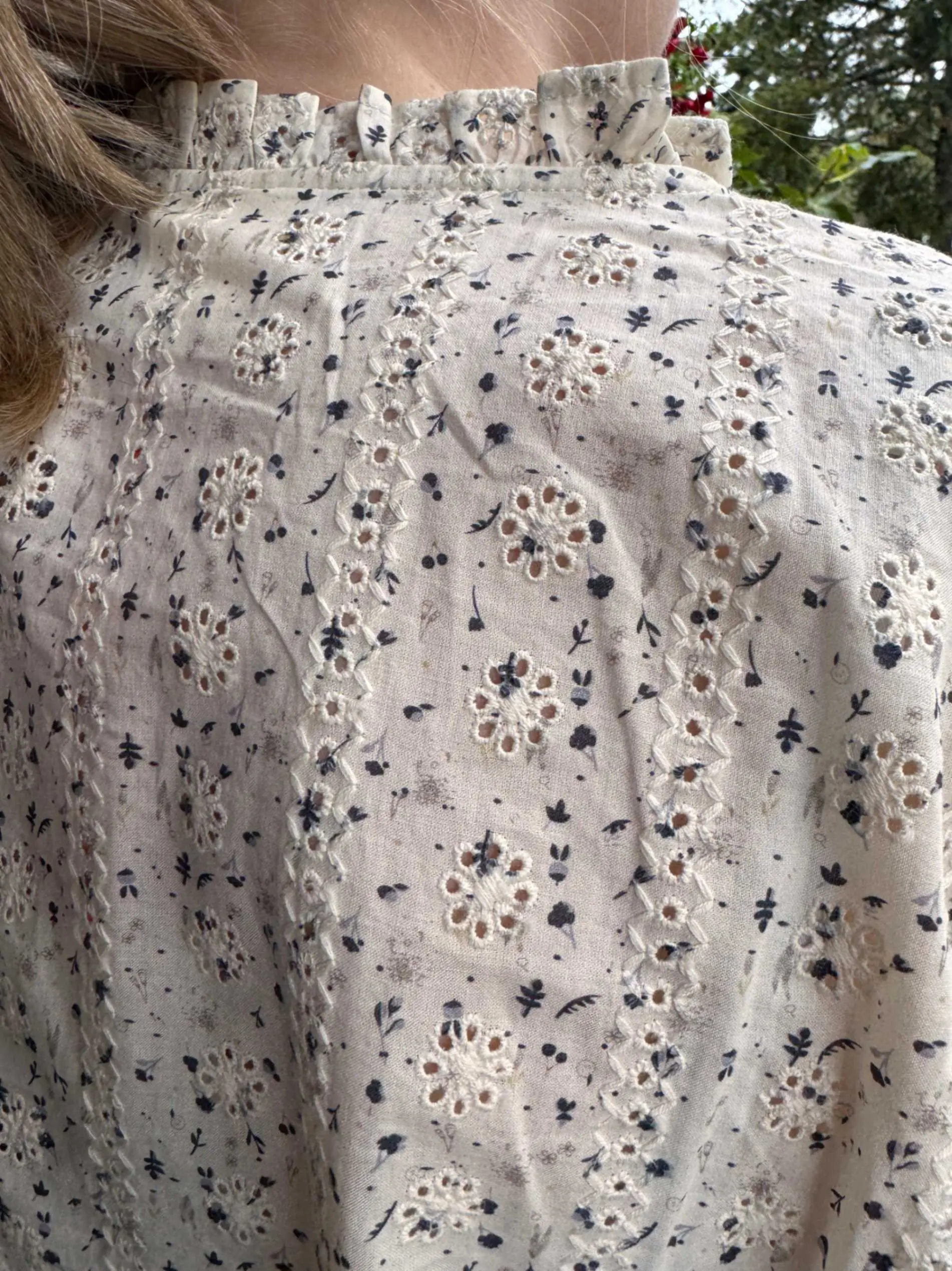 MirjaGO Bluse – Elegant og full av vakre detaljer. En nydelig bomullsbluse med et søtt trykk, heldekkende broderier og fine volangdetaljer ved kragen. De elegante leggene foran gir en feminin silhuett og en flatterende passform, noe som gjør blusen perfekt både til hverdags og fest.