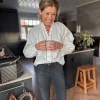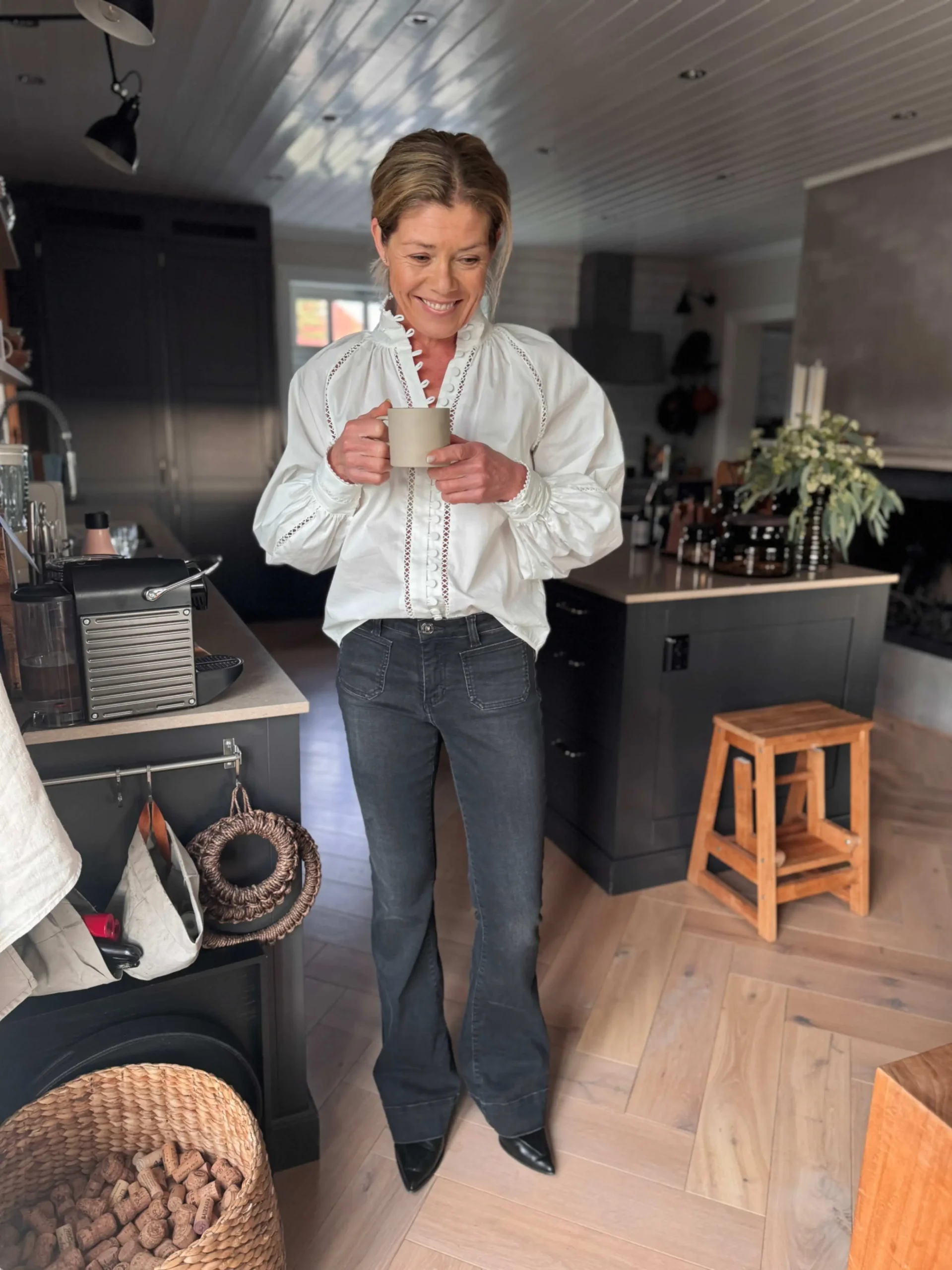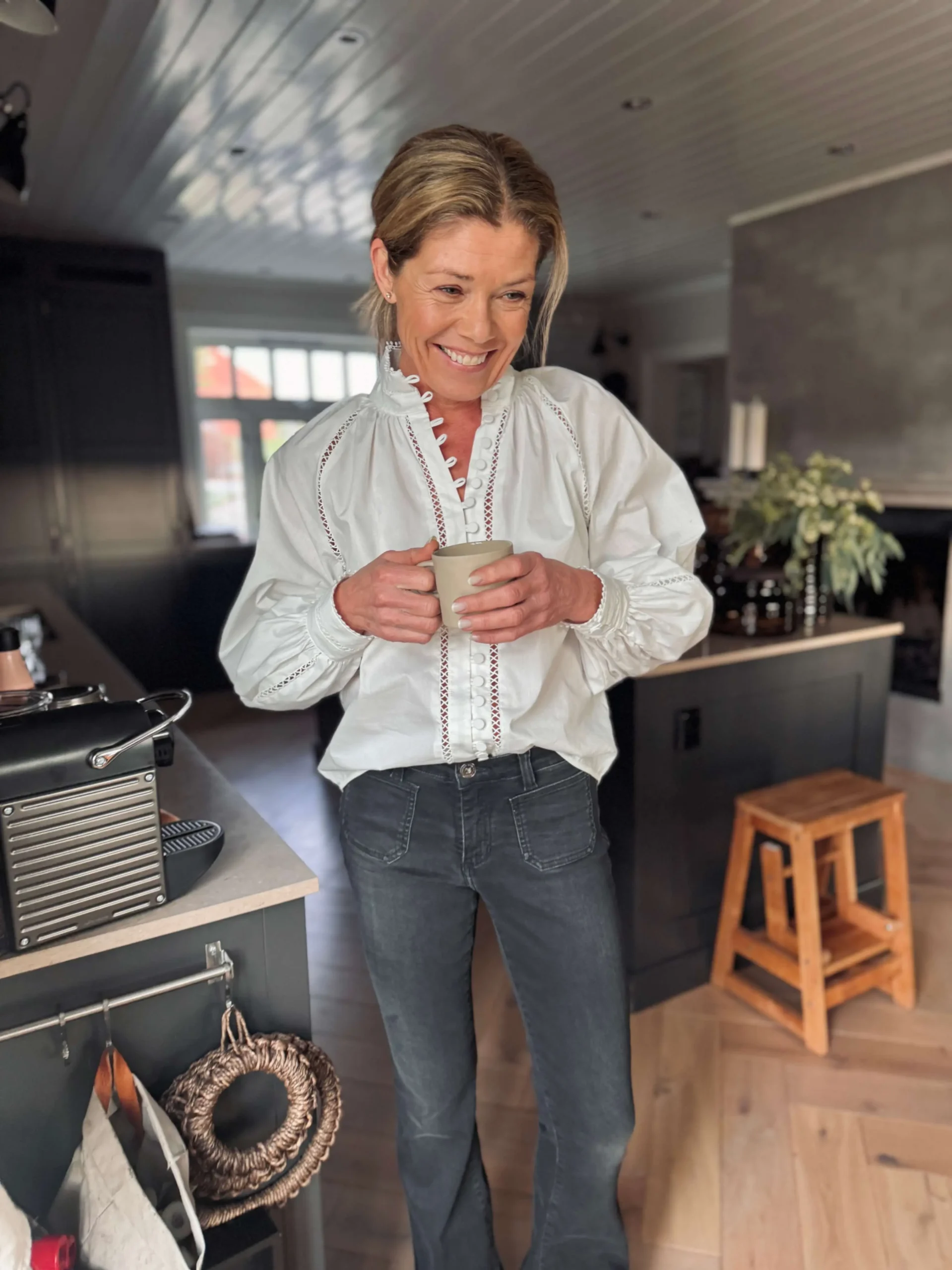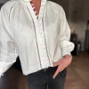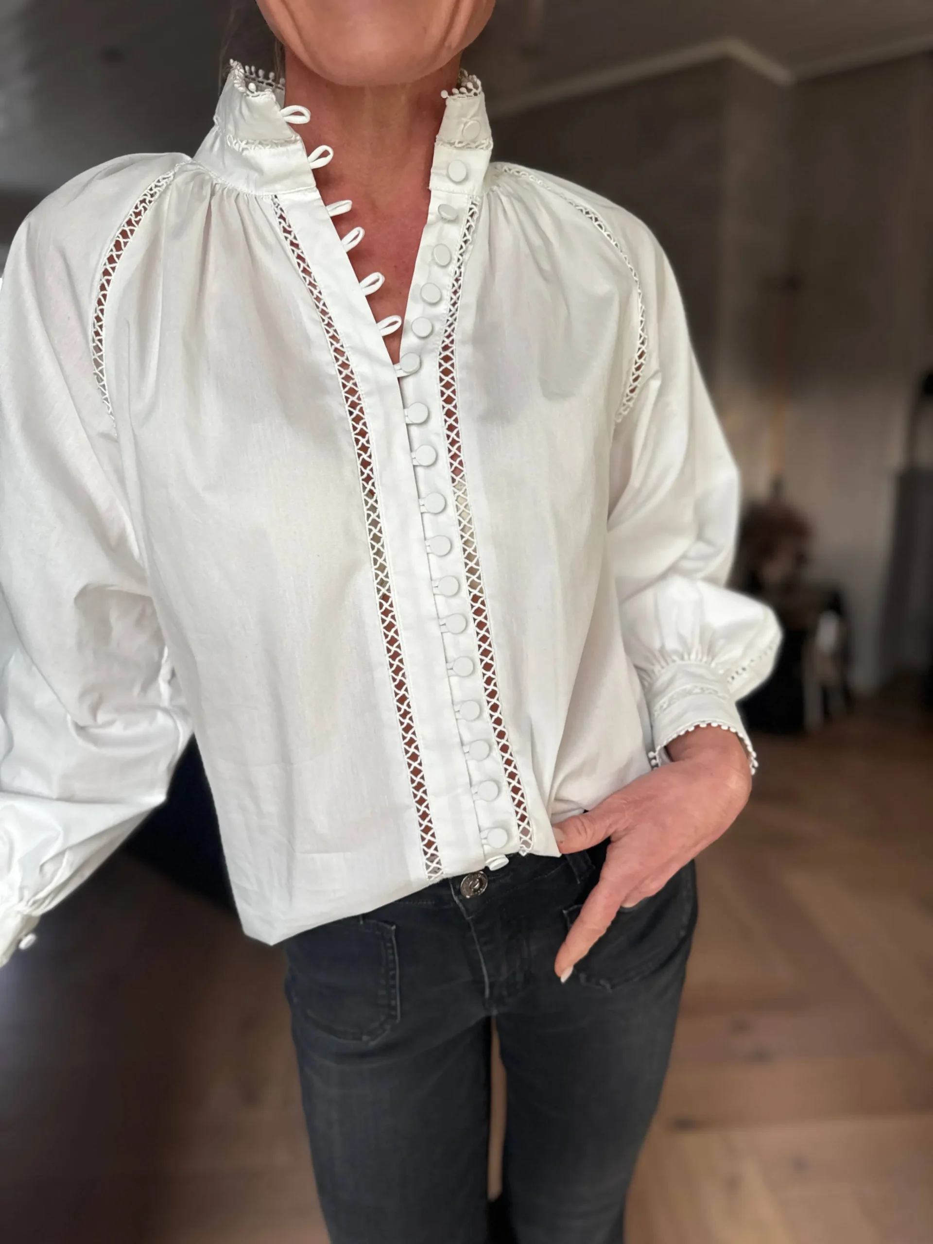 Feminin, hvit bluse med delikat blondetrim på krage, mansjetter, front og skuldersømmer. Laget i myk chambray-bomullsblanding som gir et rent og stilfullt uttrykk.