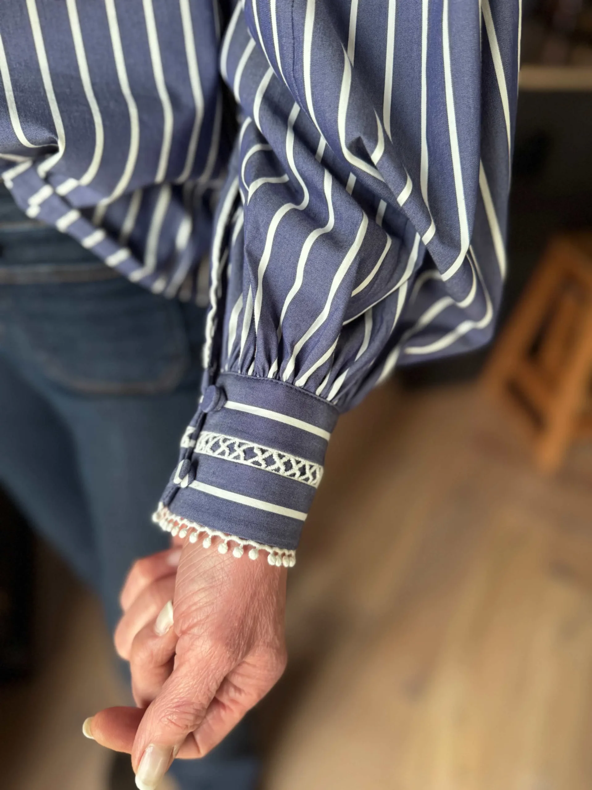 Feminin bluse med delikat blondetrim på krage, mansjetter, front og skuldersømmer. Laget i myk chambray-bomullsblanding med markante striper som gir et stilfullt uttrykk.