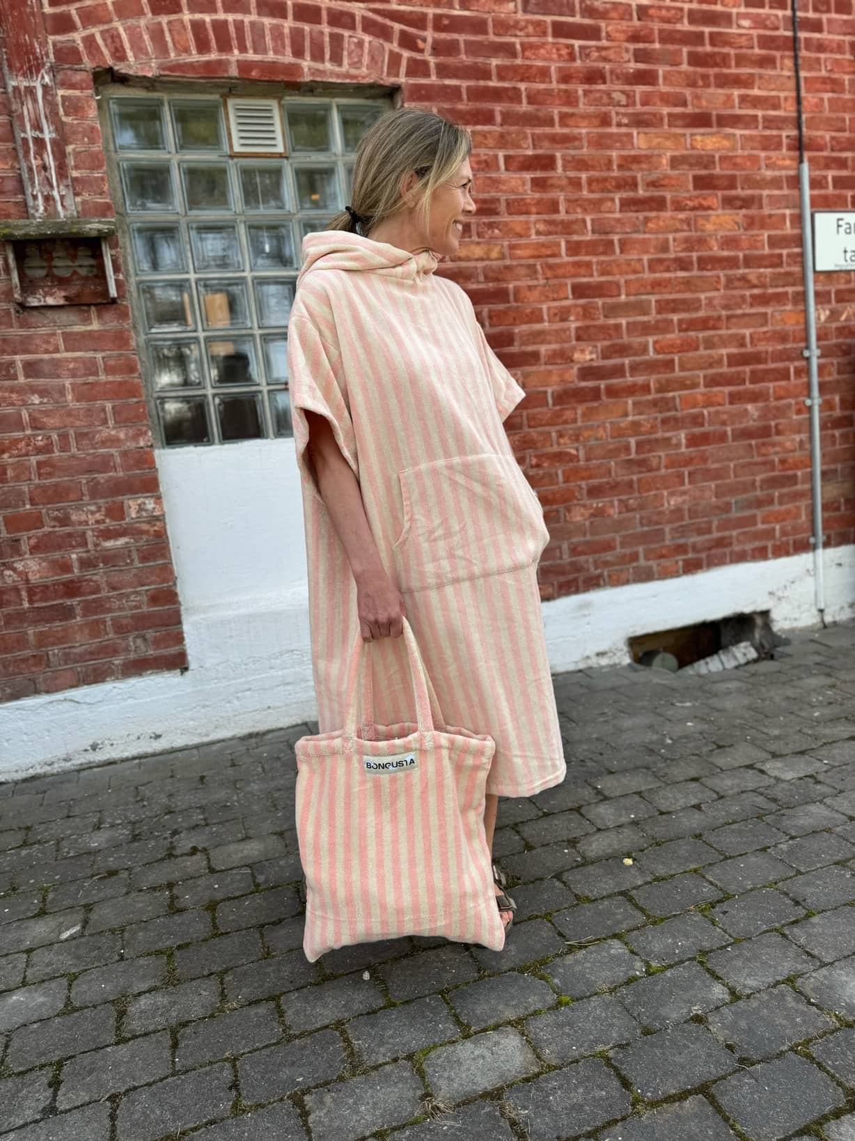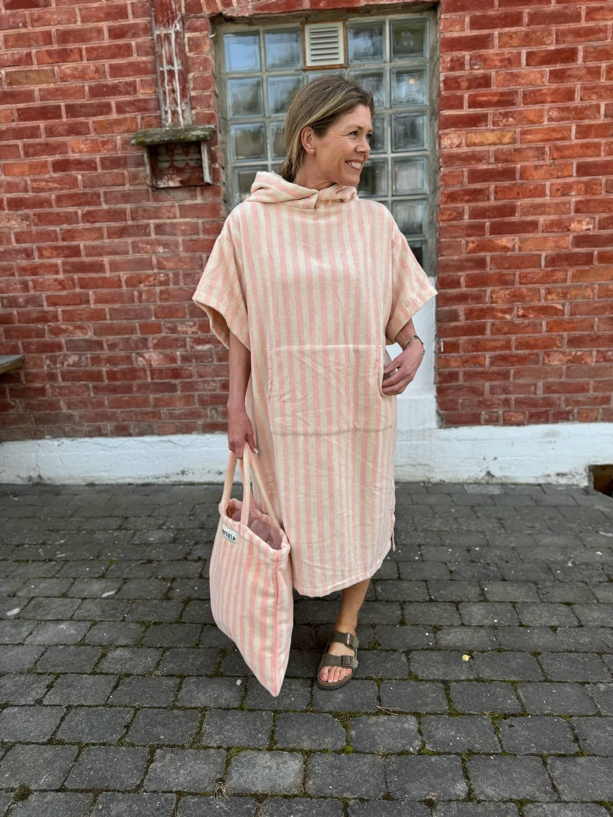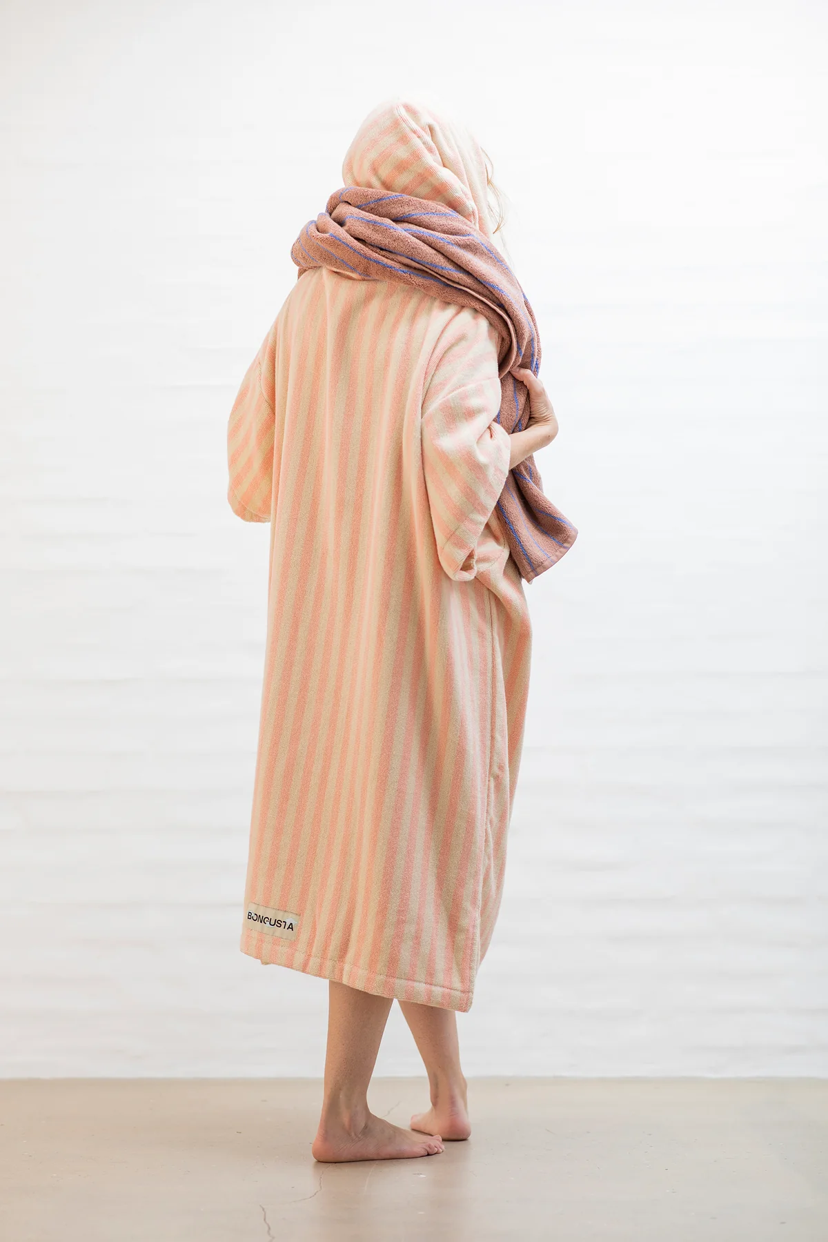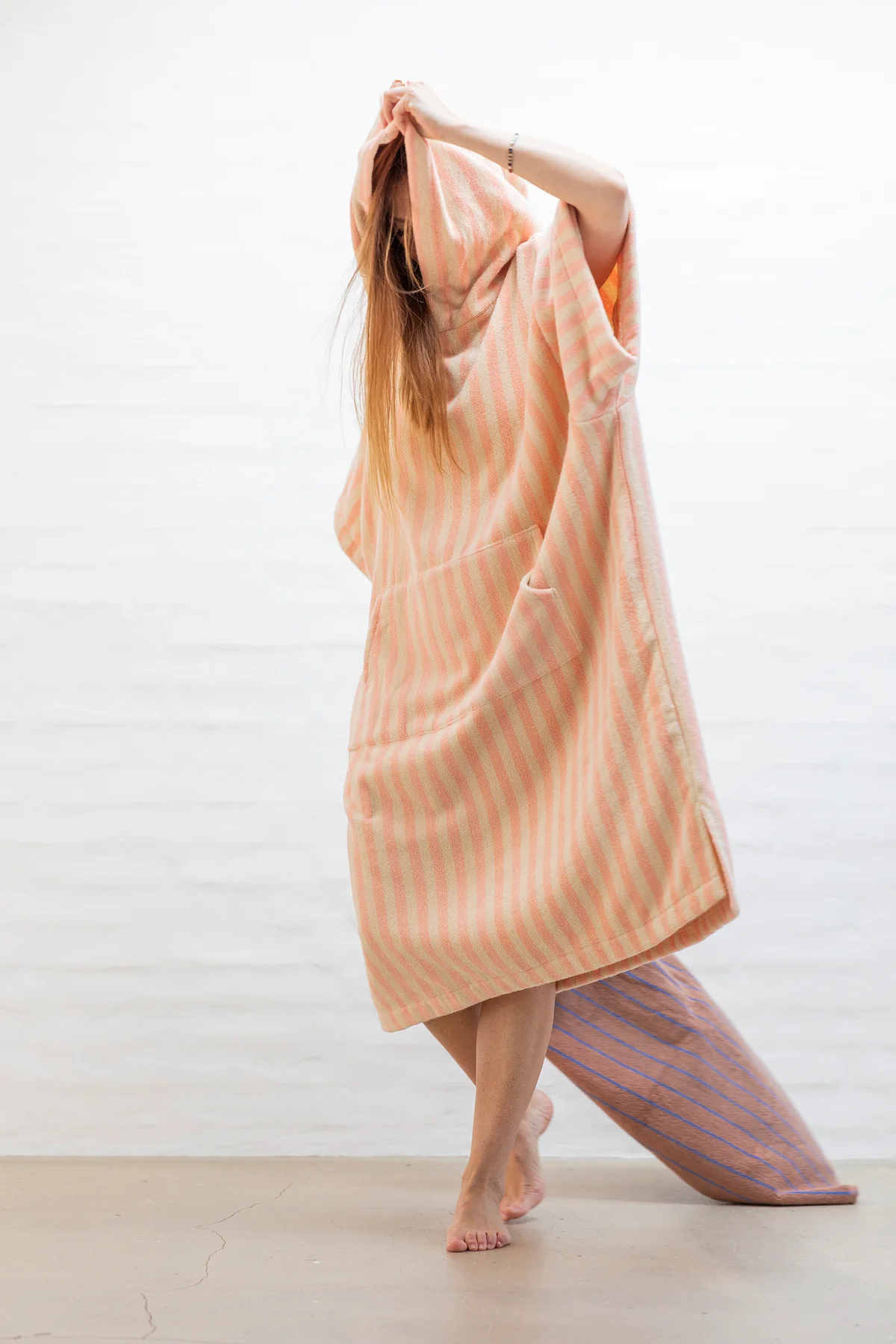 Inspirert av surfeverdenens avslappede stemninger, er Naram Poncho laget av 100 % kammet bomull og dobbeltvevd i en myk 385-gsm kvalitet. Dette gir høy absorberingsevne og en avslappende opplevelse hver gang du tar den på.