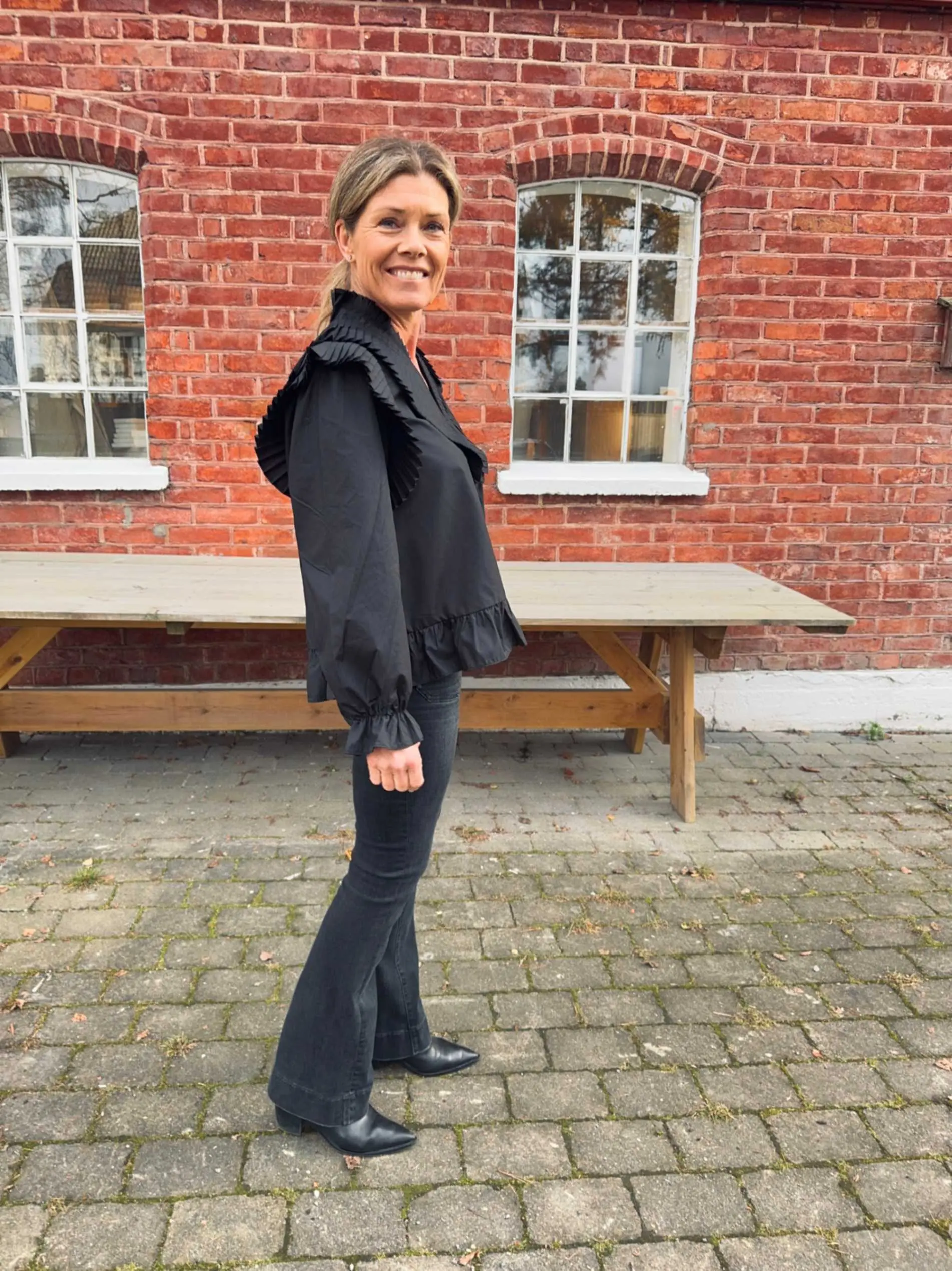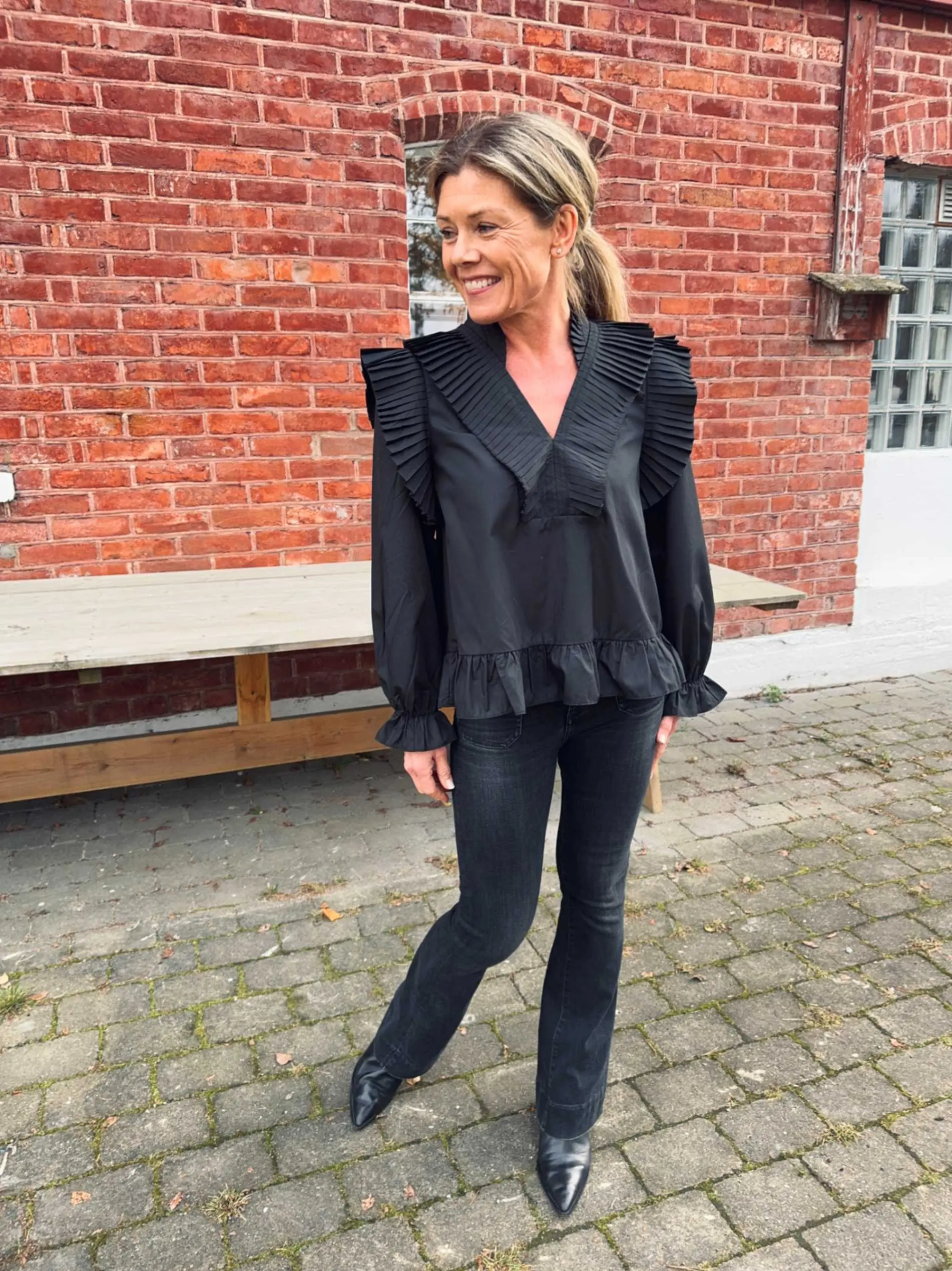 Denne blusen fra Gossia har flotte detaljer, med en krage og front pyntet med brede plisserte rynker som strekker seg over skuldrene. Ermene avsluttes med smal strikk og volang for en feminin touch. Perfekt for både hverdag og fest!