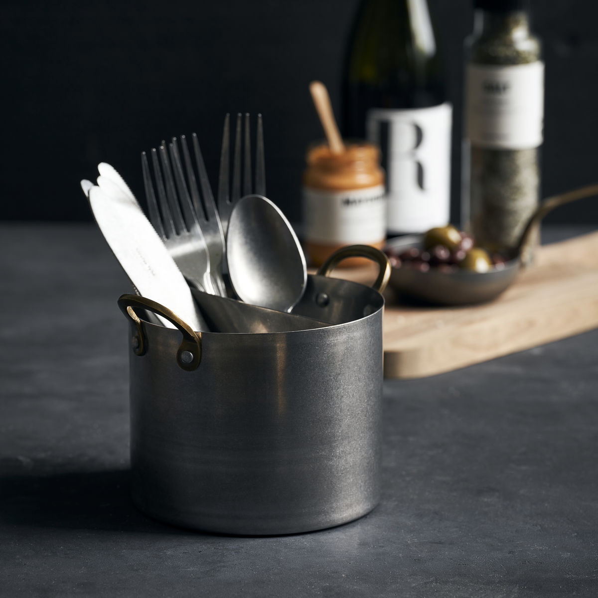 Server maten din i en uformell bistroatmosfære med bestikkholder fra Nicolas Vahé. Bruk de to rommene til tinge som alltid skal være på bordet – bestikk, servietter og salt- og peppersett. Hanken i rustfritt stål og messing gir en uformell og allikevel stilig look. La bestikket stå fremme på bordet, lag deilig mat og nyt.