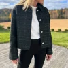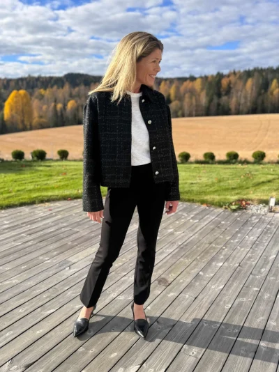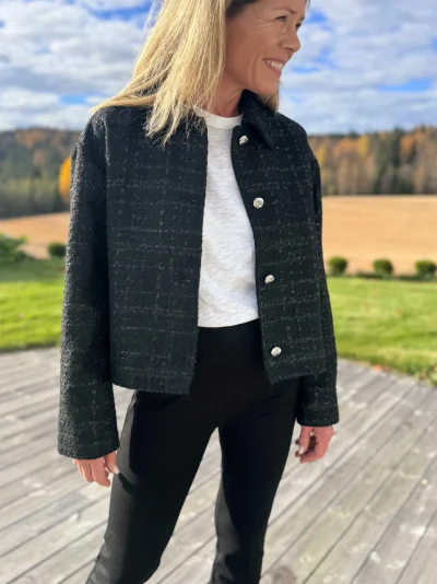 Stilfull kort jakke med elegante detaljer som gjør den perfekt til både hverdag og fest. Jakken har sølvknapper, praktiske sidelommer og et subtilt rutemønster med sort glitter som gir et sofistikert uttrykk.