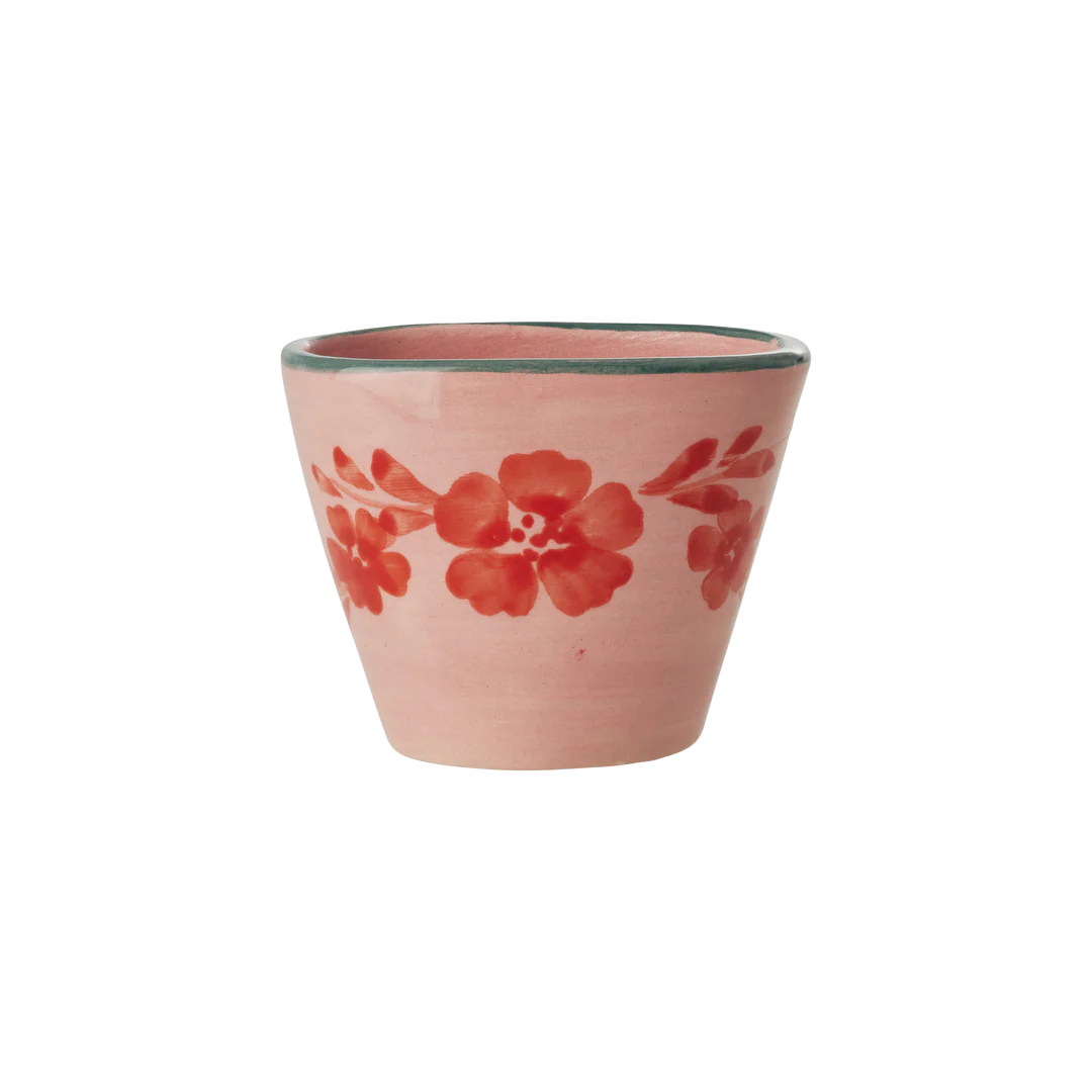 Søt, oval espresso-kopp i keramikk med et håndmalt motiv av sjarmerende blomster. Denne skjønnheten er perfekt for å starte dagen, enten med kaffe eller en oppfriskende ingefærshot. Koppen er håndmalt av et fantastisk team av portugisiske kvinner, noe som gjør hver kopp helt unik. Vi synes den er utrolig sjarmerende!
