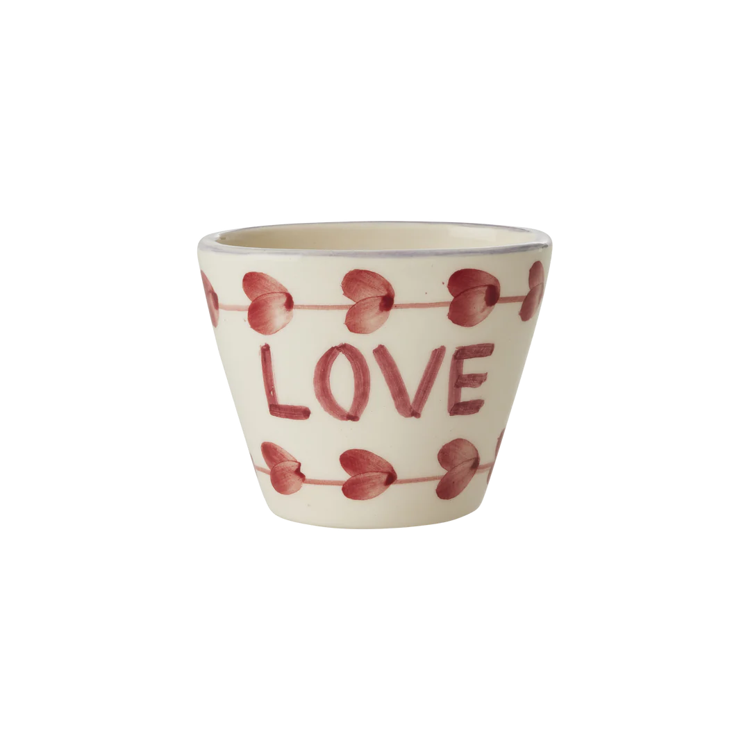 Oval espresso-kopp i keramikk med et håndmalt motiv av LOVE. Denne skjønnheten er perfekt for å starte dagen, enten med kaffe eller en oppfriskende ingefærshot. Koppen er håndmalt, noe som gjør hver kopp helt unik. Vi elsker den!