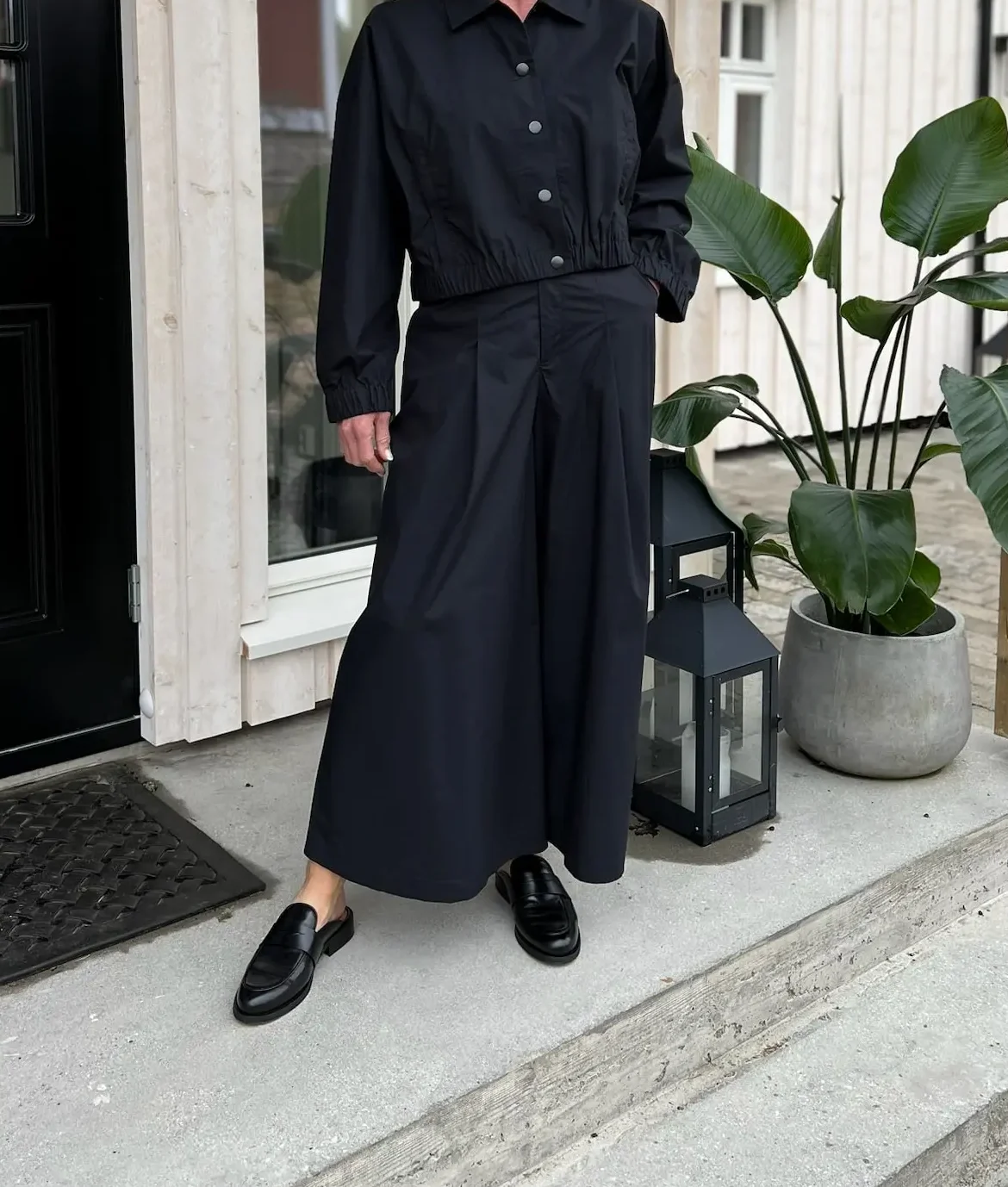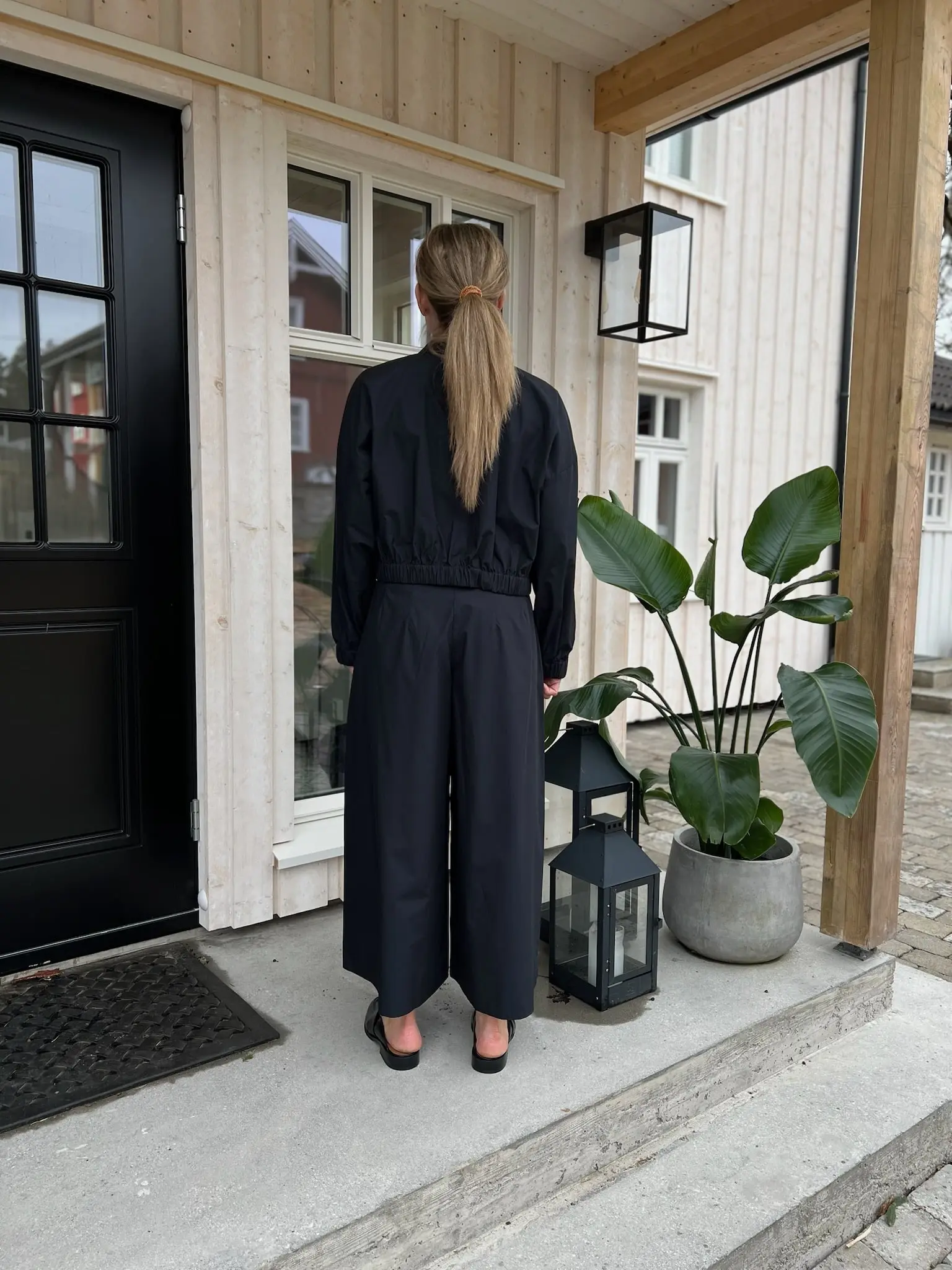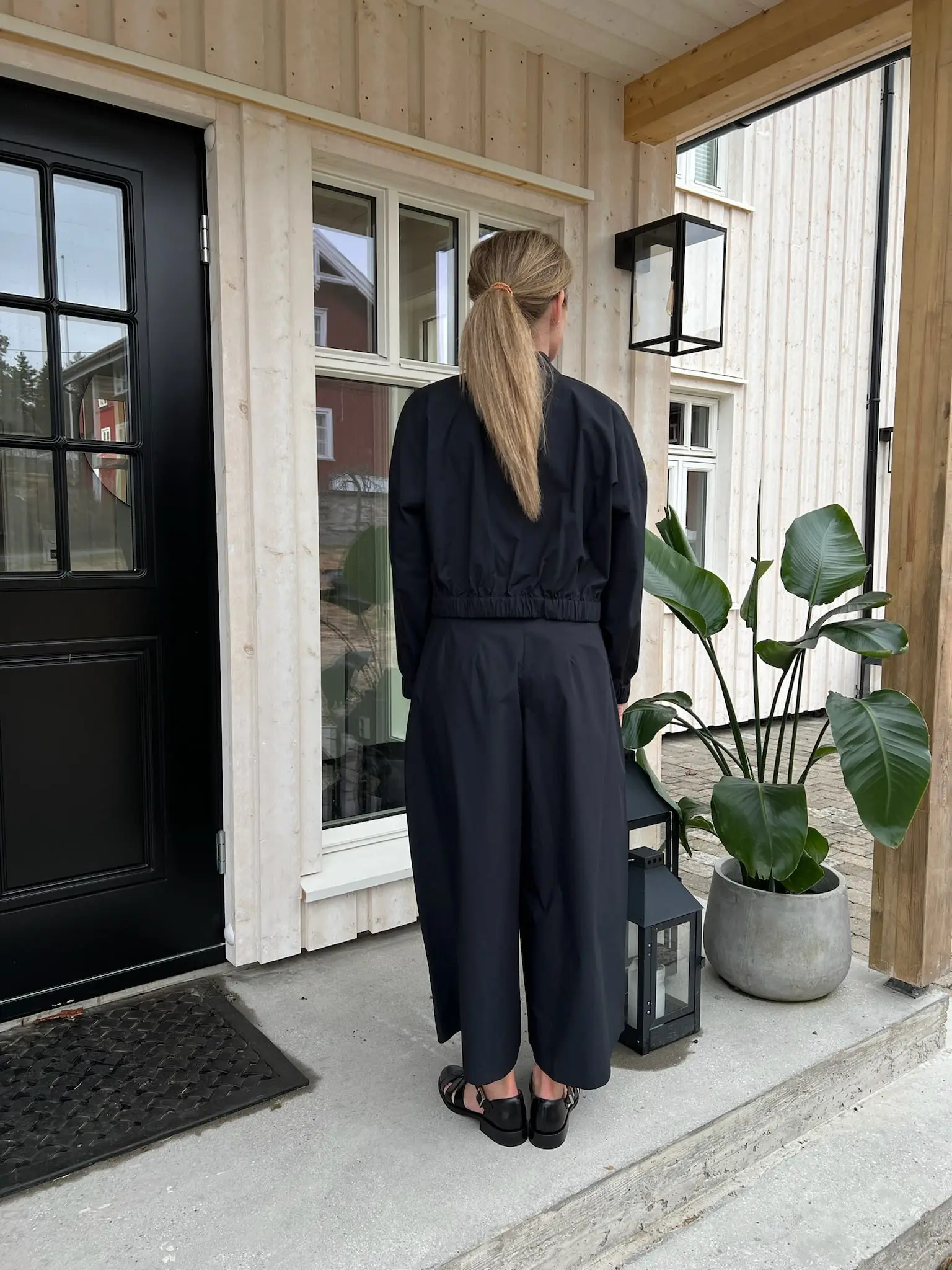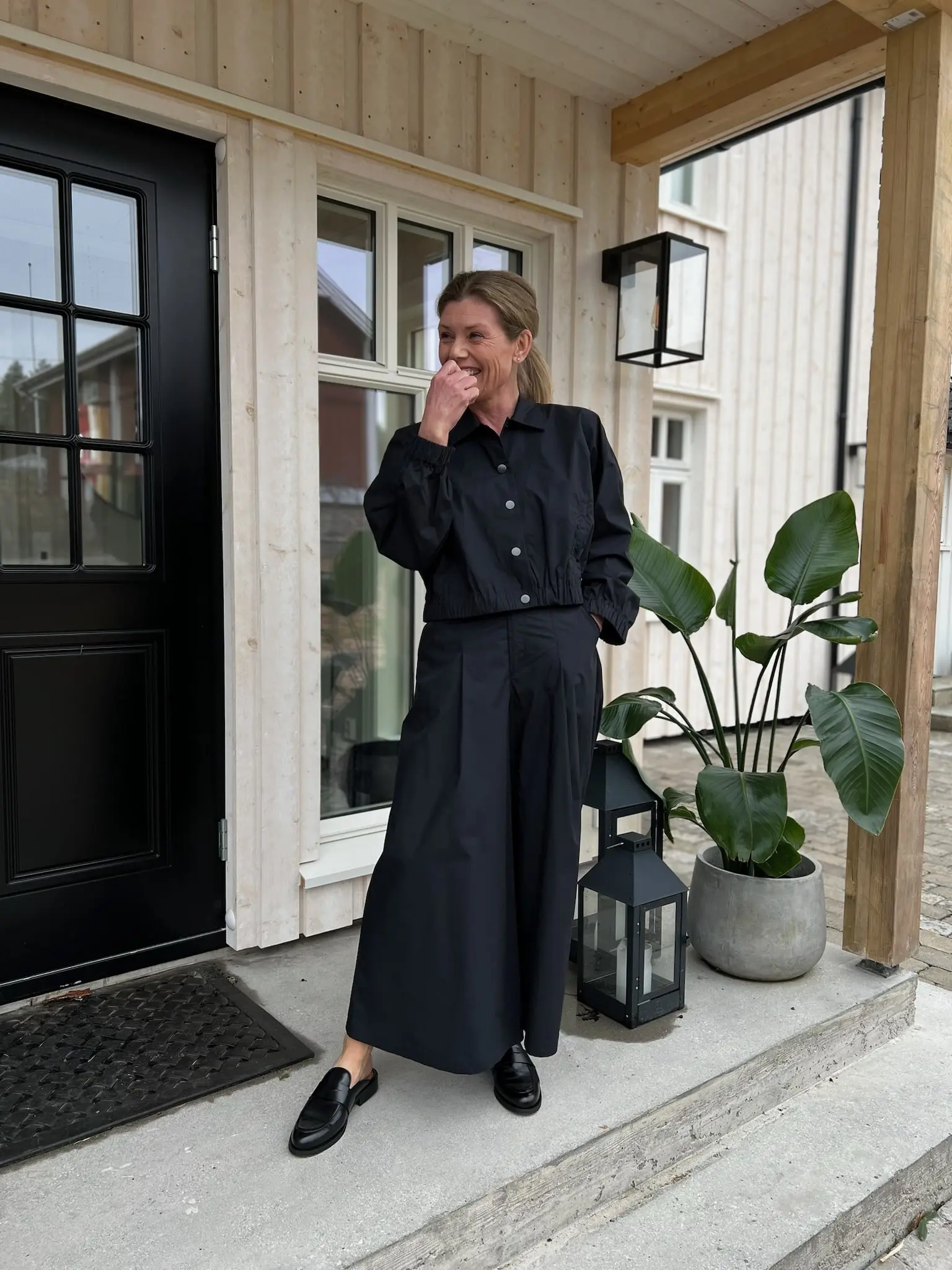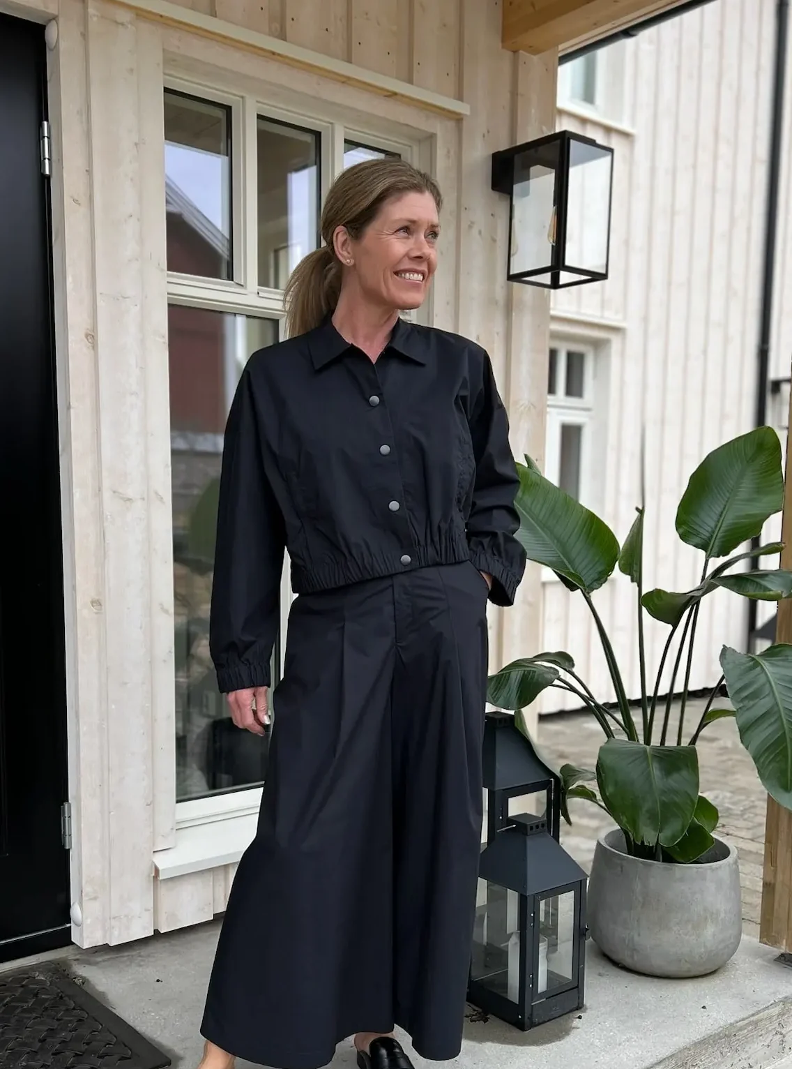 Lekker kort jakke med trykknapper og strikk i midjen, som gir en feminin silhuett. Bruk jakken som et friskt alternativ til en blazer.