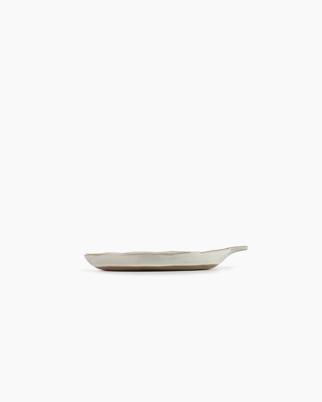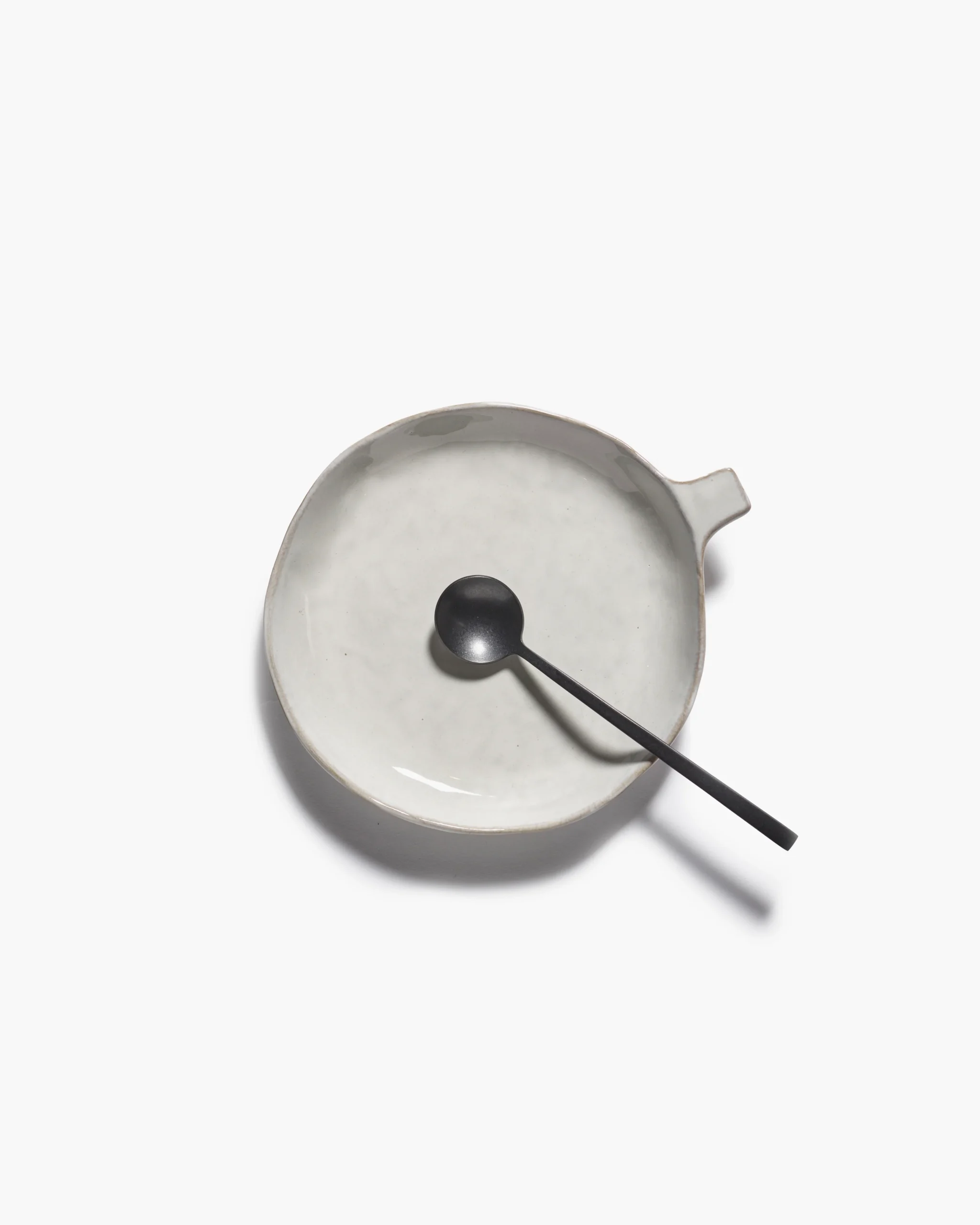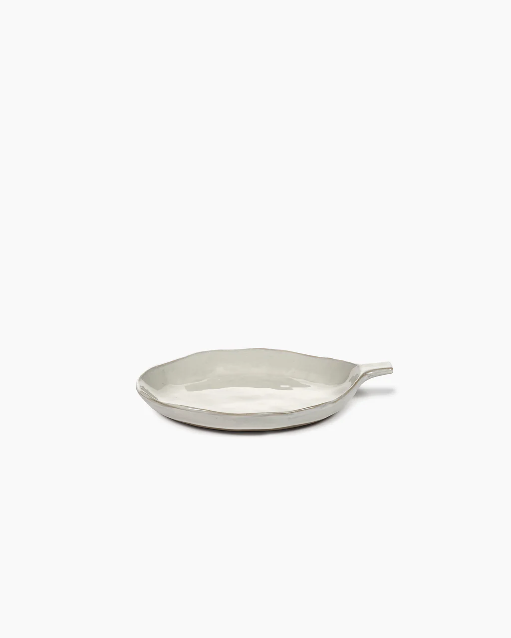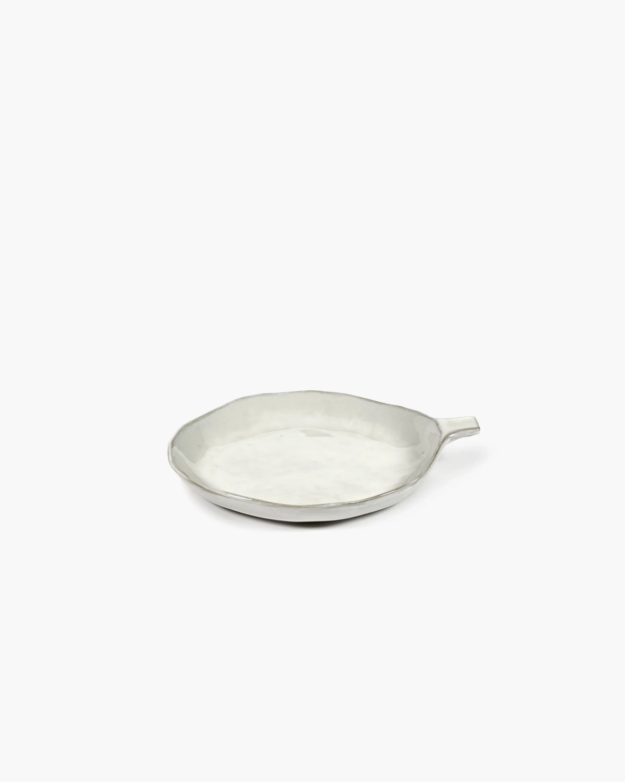Keramiske tallerkenen med et håndtak fra Serax. De små ufullkommenhetene i formen, den litt avfargede hvite glasuren og den naturlige formen gir en nostalgisk, men samtidig ny følelse.