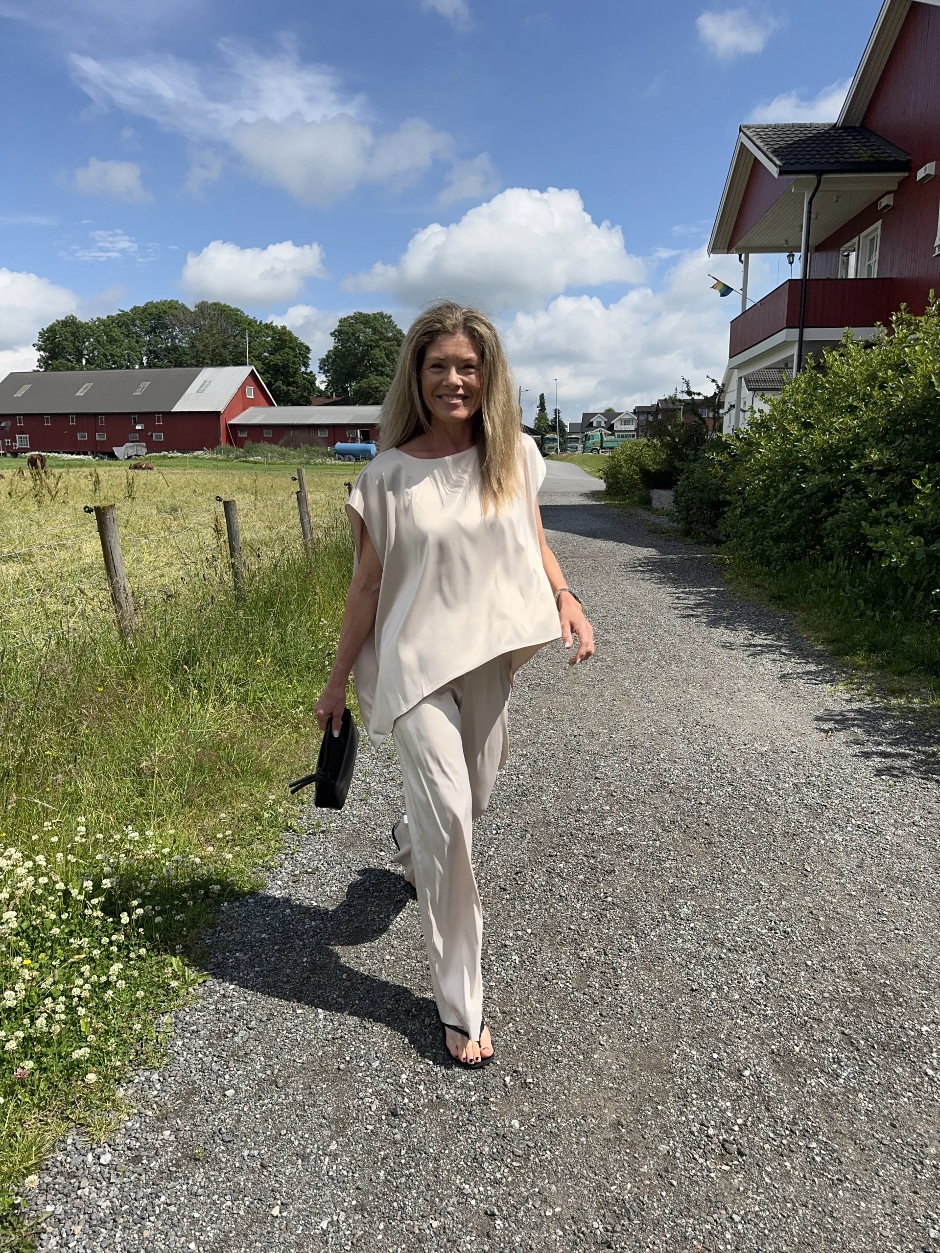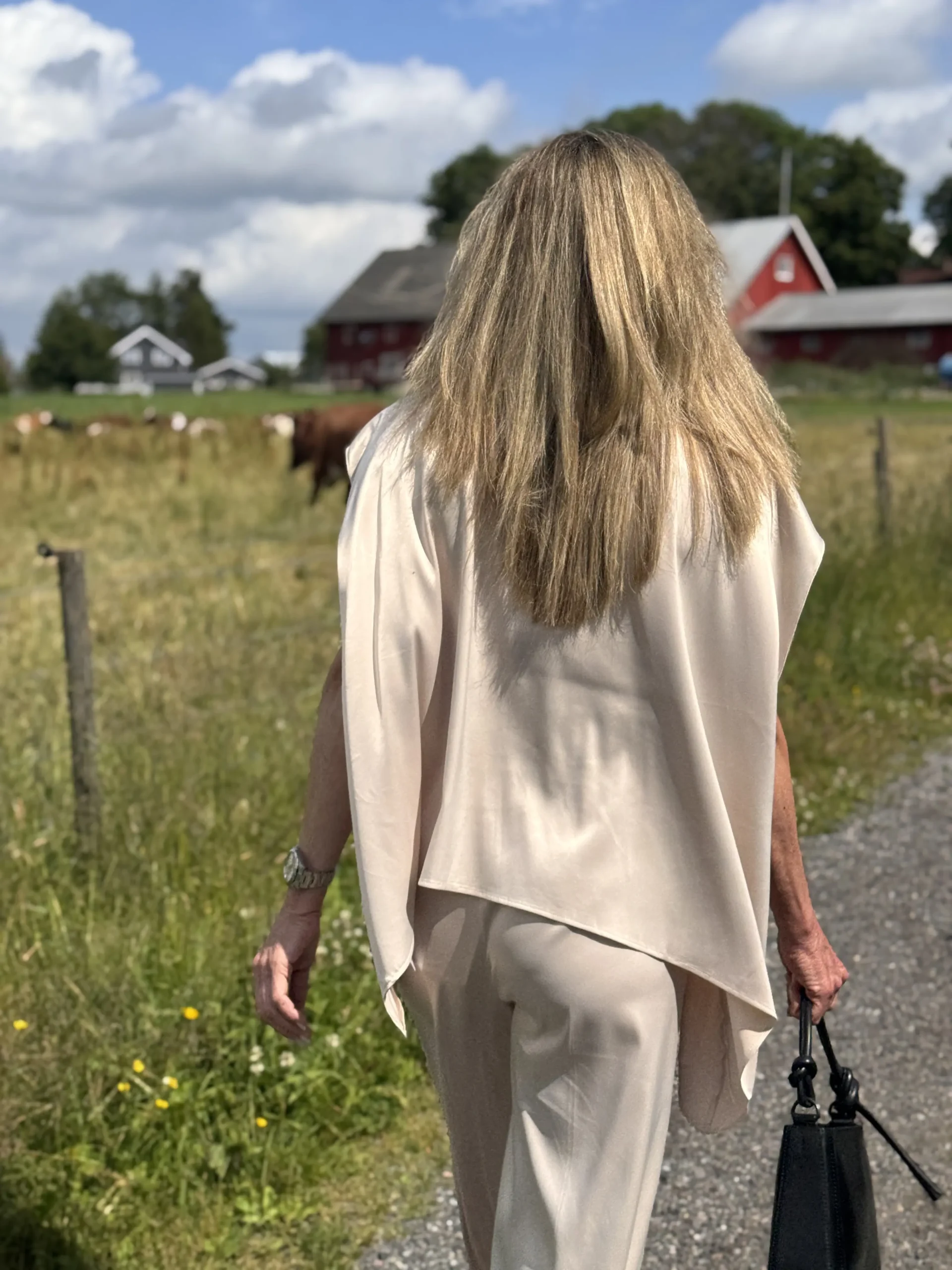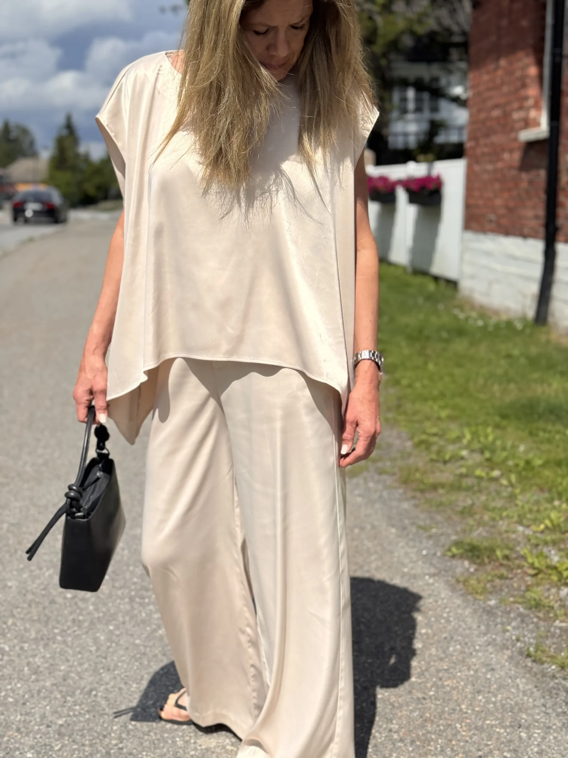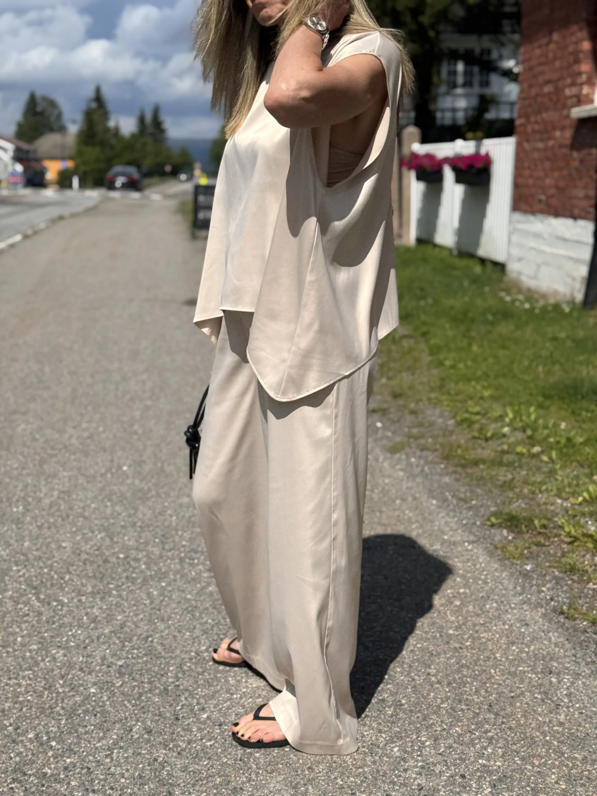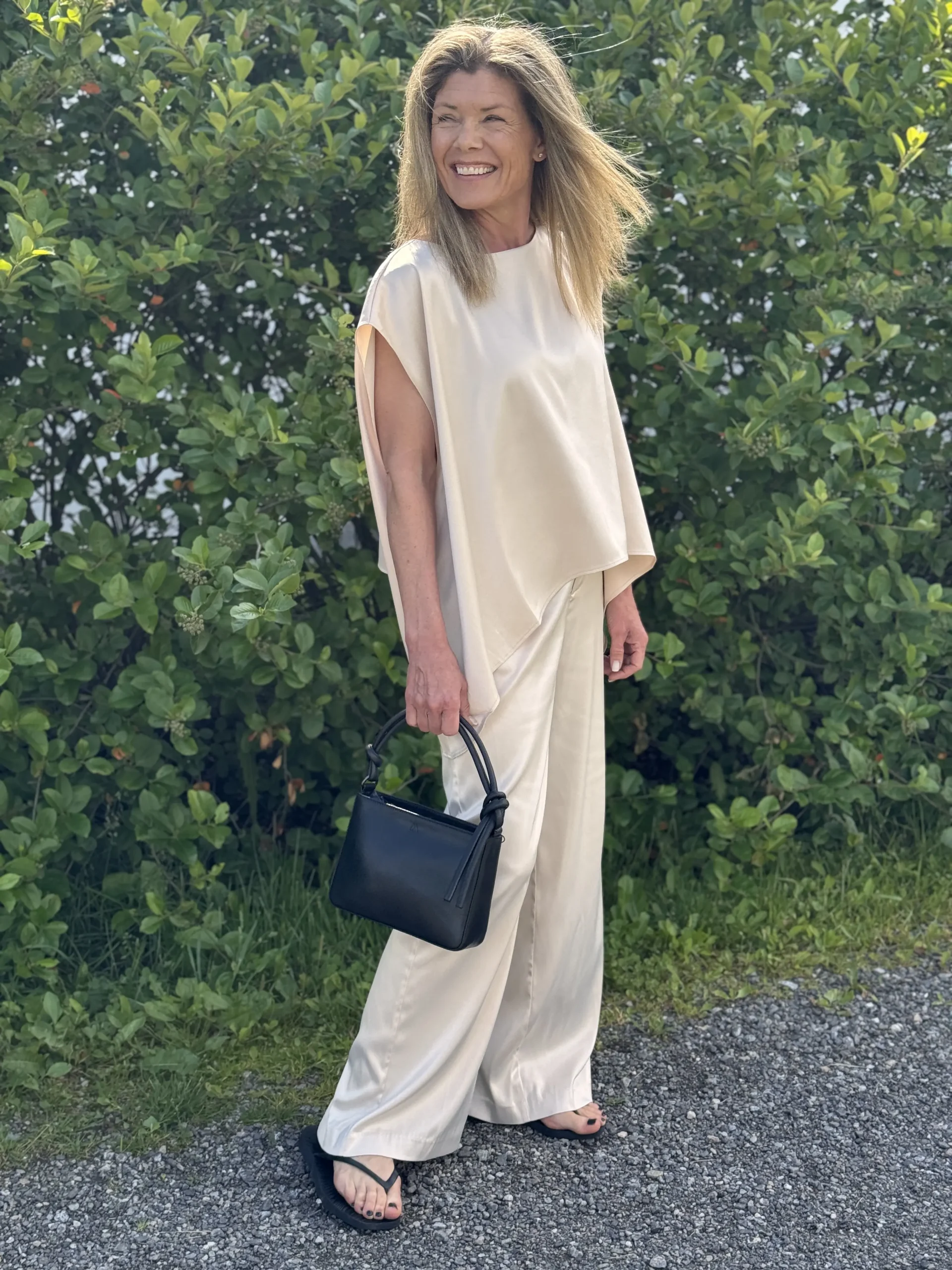Poise Satin Cape Top er den perfekte elegante toppen i cape-stil. Den er laget av ultramykt satengstoff som faller vakkert og gir antrekket et naturlig, flytende preg. Den avslappede passformen gjør det enkelt å velge en størrelse opp eller ned, avhengig av din stil. Kombiner den med Reign Satin Tailored Pants for et komplett uttrykk.