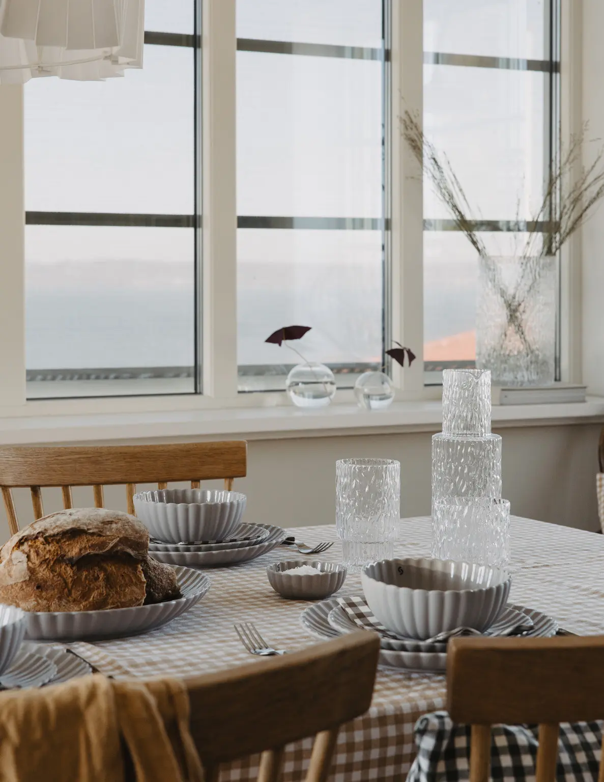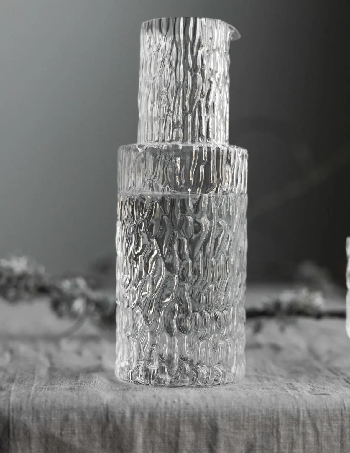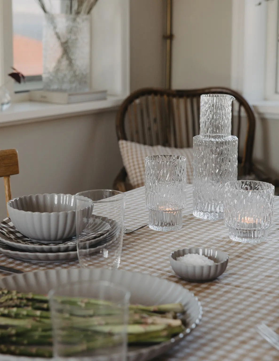 Karaffel i tidløst rillemønster. Praktisk for å servere drikke, eller bruk som vase til små blomsterbuketter når den ikke er i bruk. Tåler oppvaskmaskin.