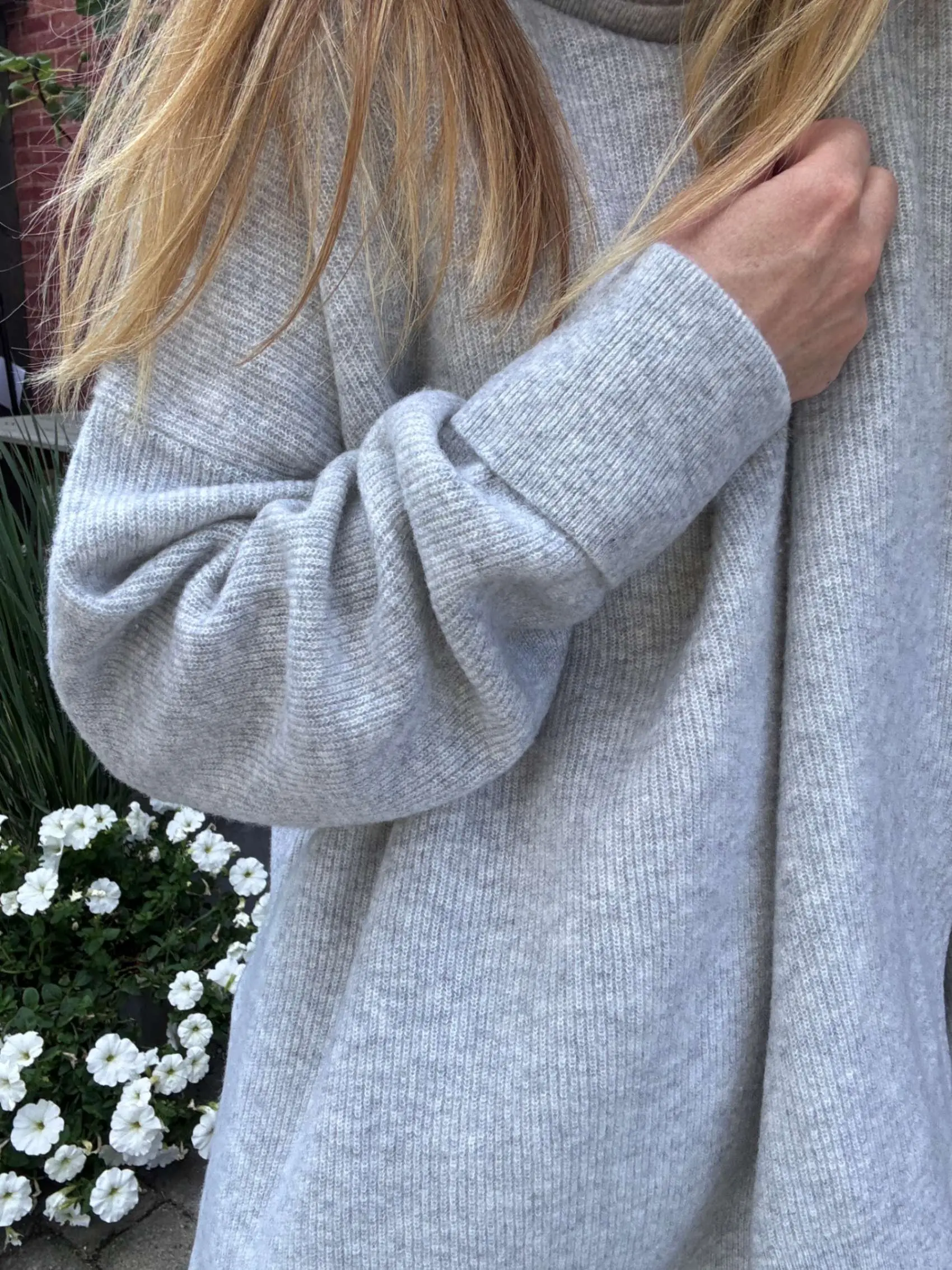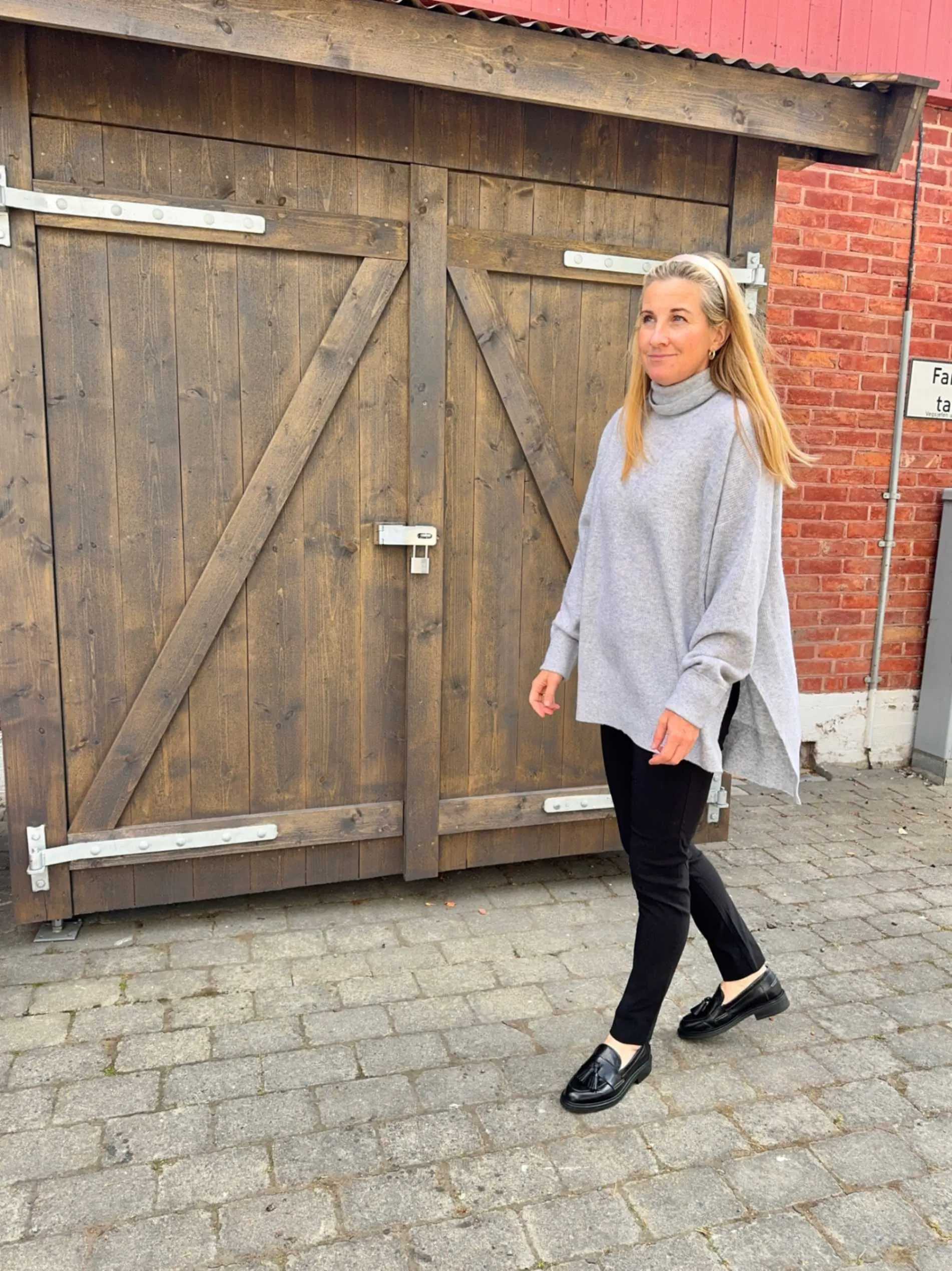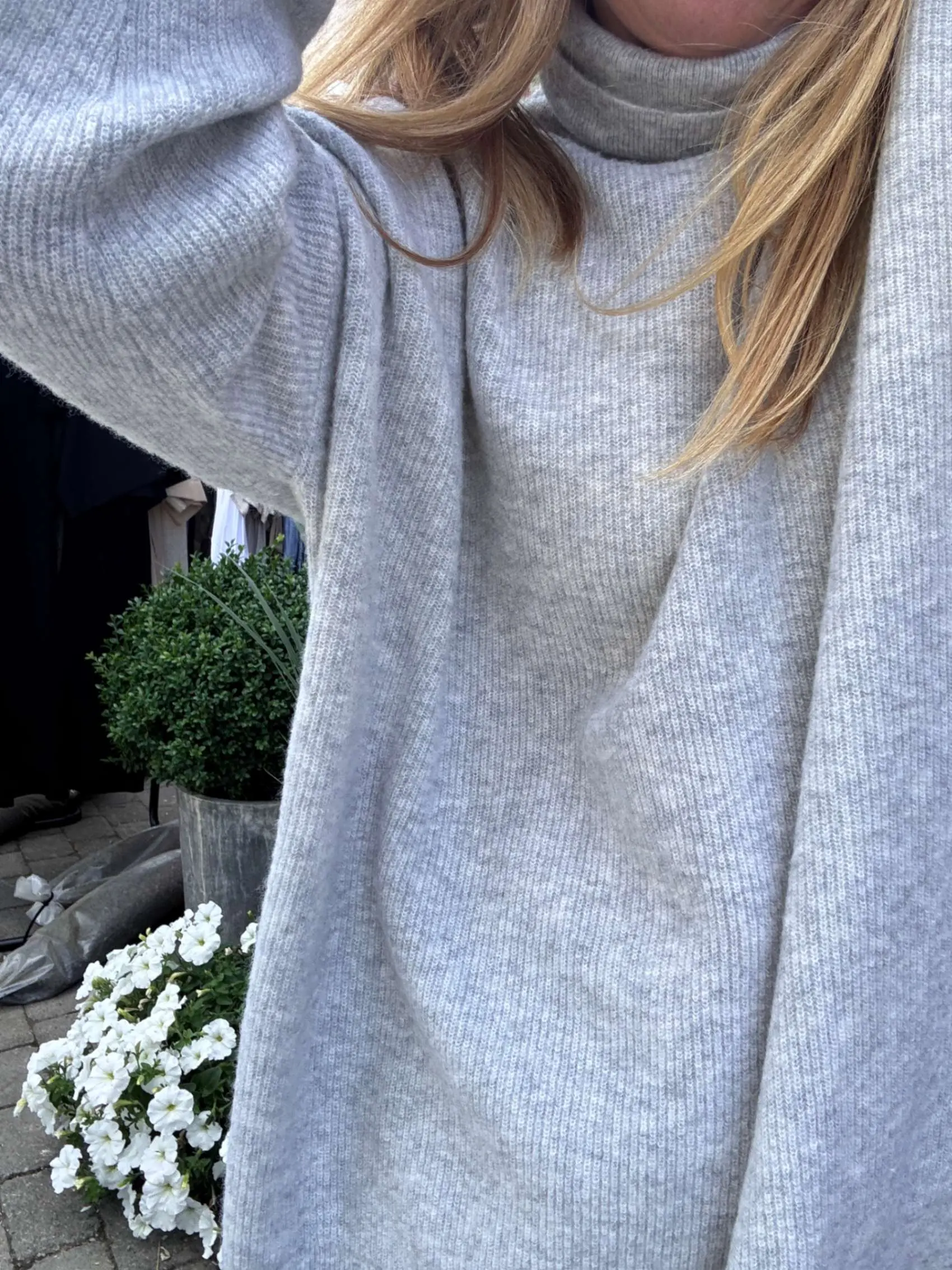 En myk, gråmelert oversized genser – perfekt for høsten. Lun, avslappet og tidløs, like fin til vide jeans som til samle bukser. Deilig på jobb eller rolige dager hjemme.