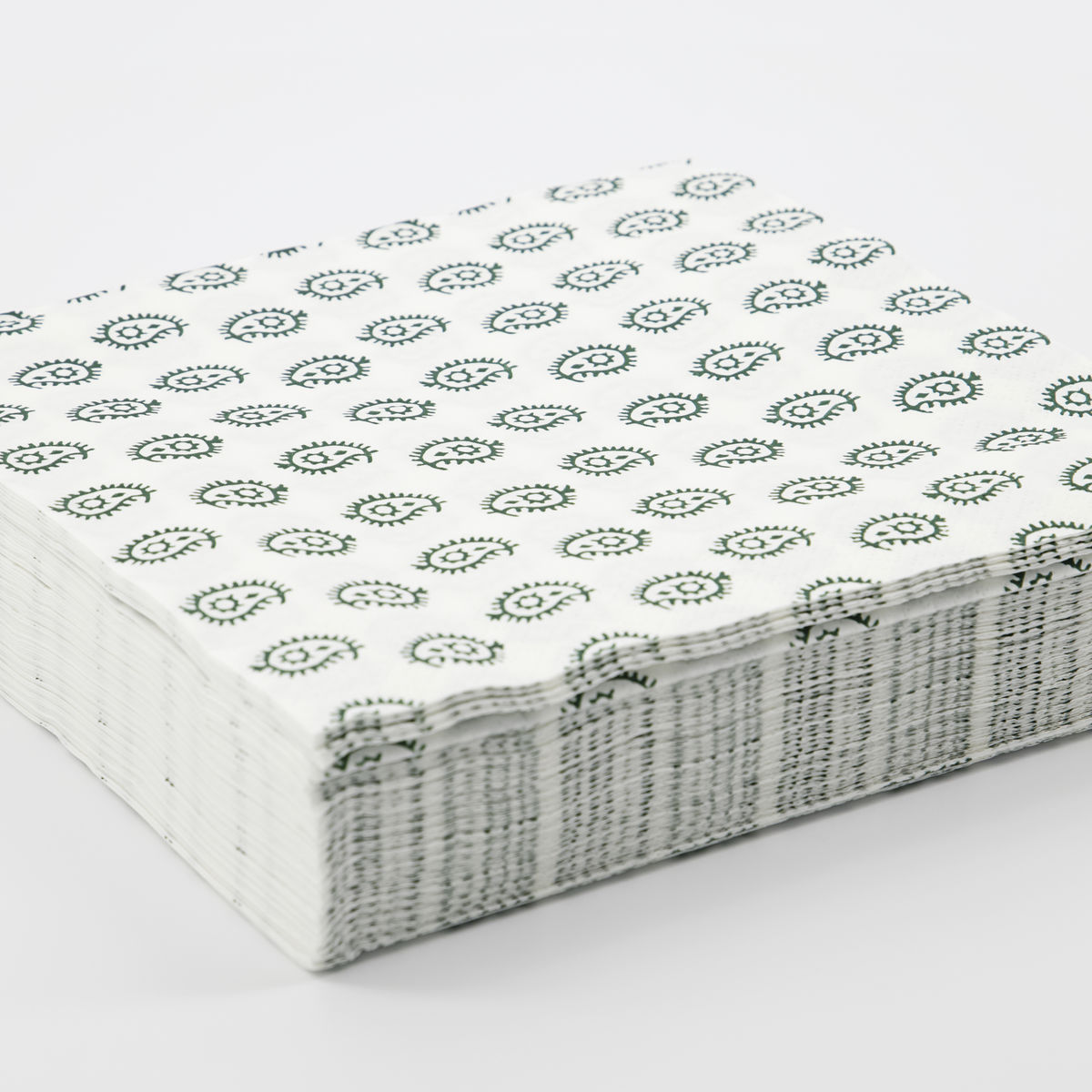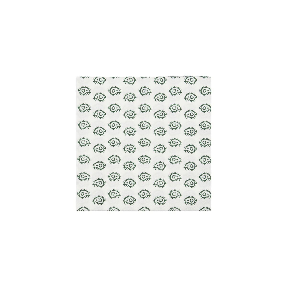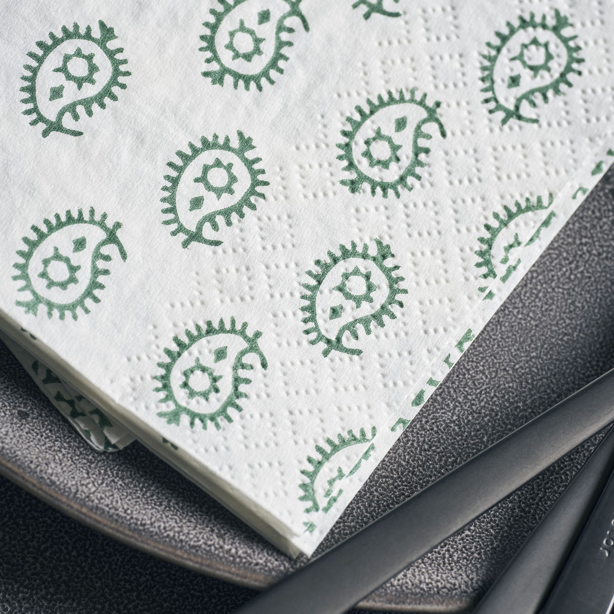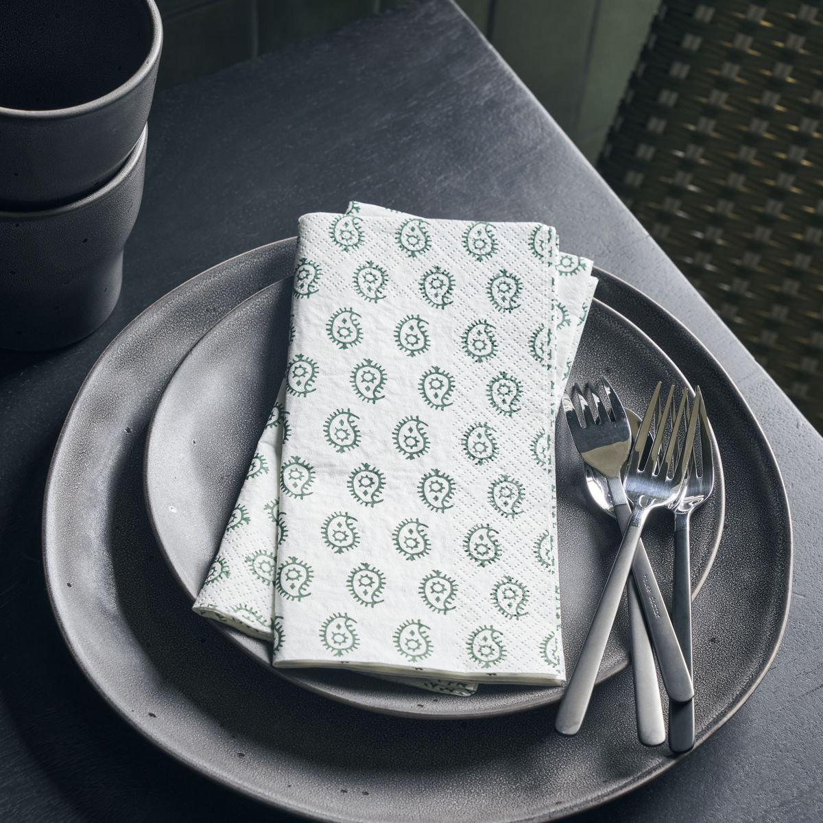 En pakke med 40 papirservietter med et nedtonet, grønt mønster til hverdagen og uformell borddekking.