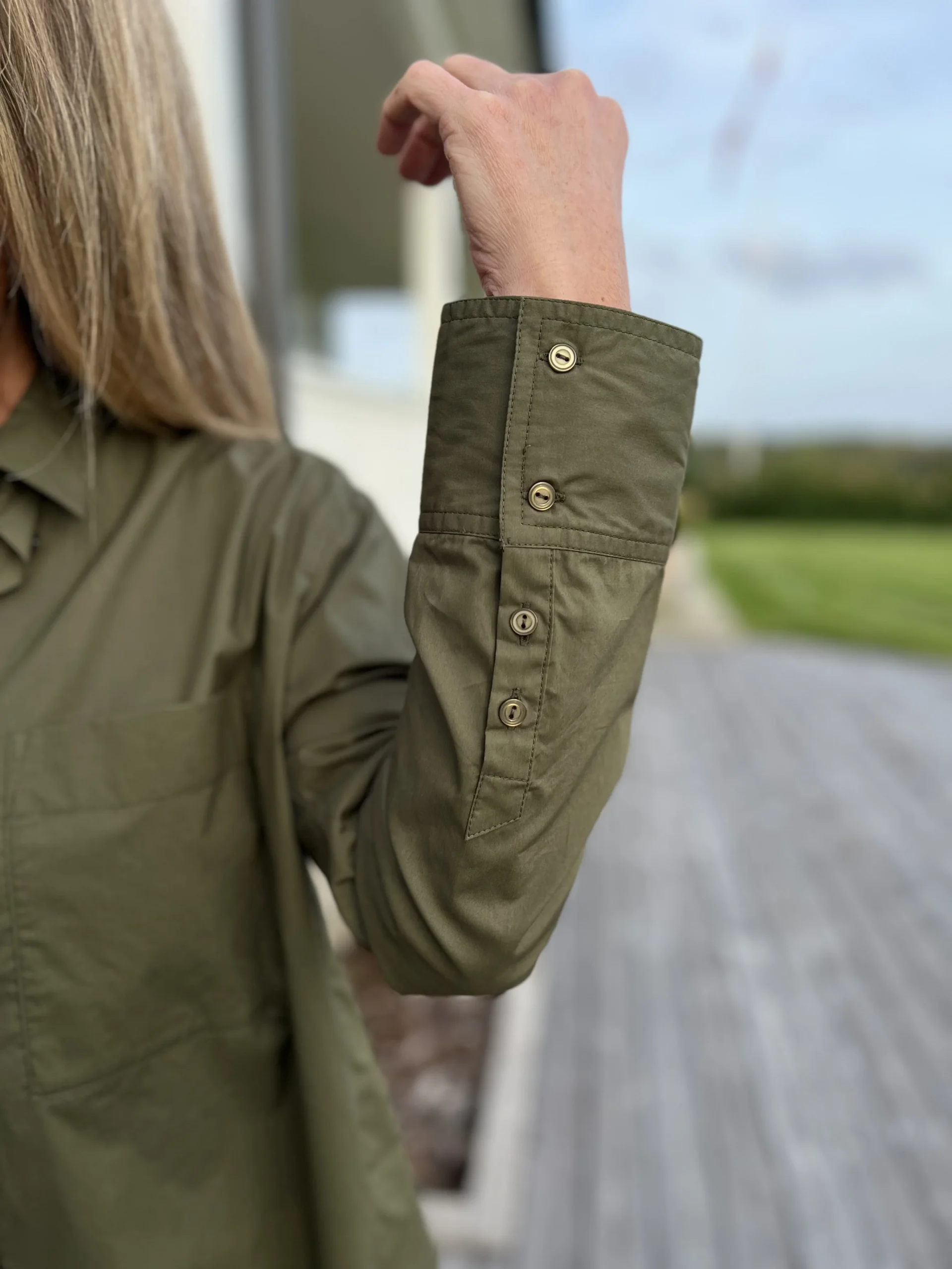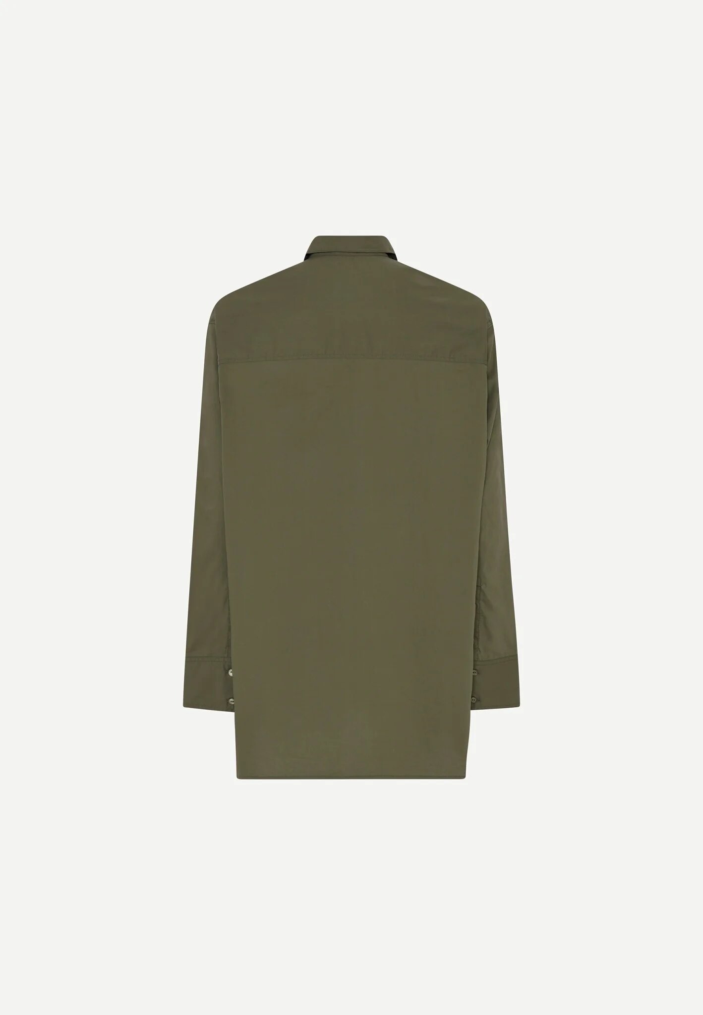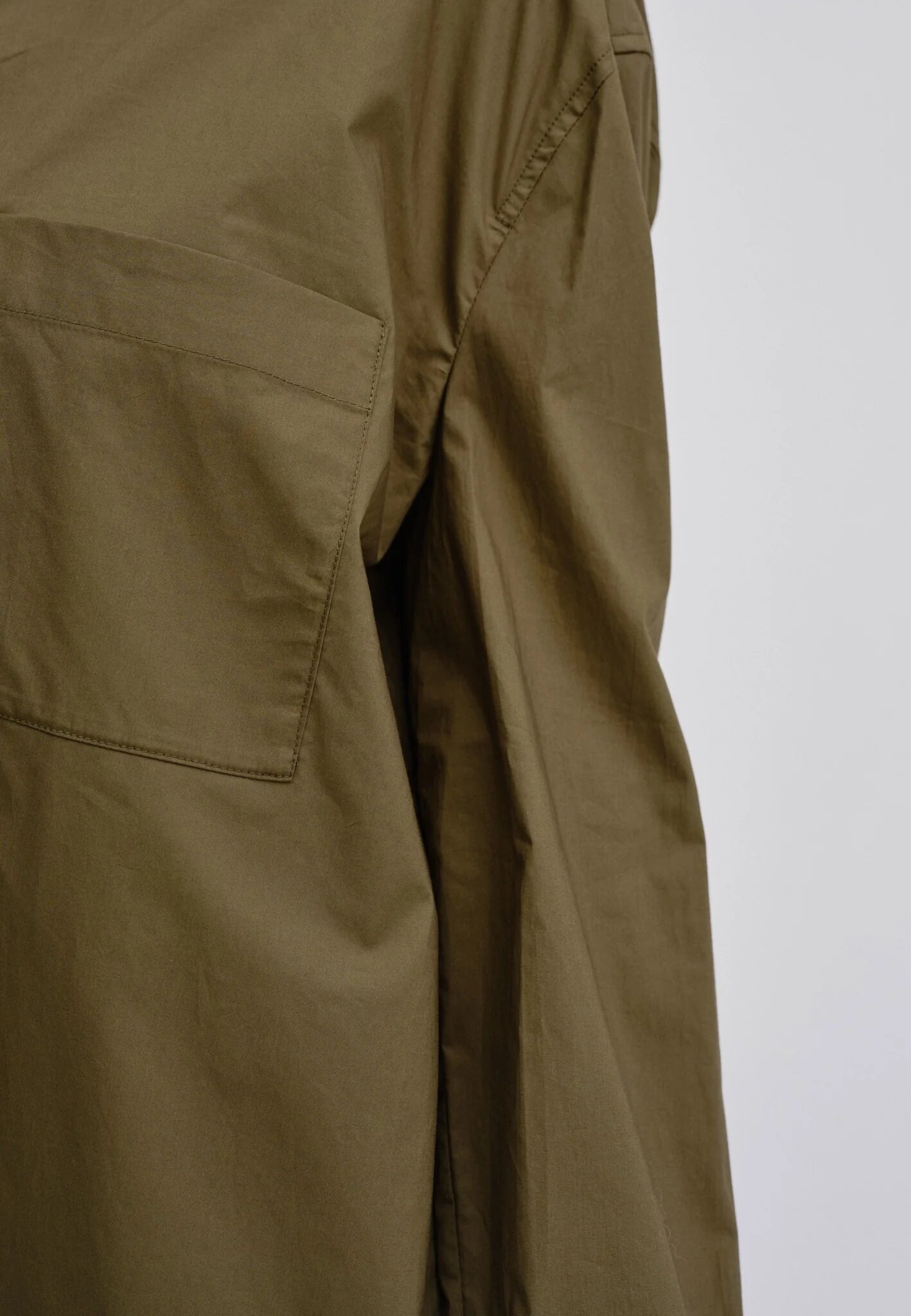 Løstsittende skjorte med senkede skuldre og to firkantede brystlommer. Den har knappelukking.