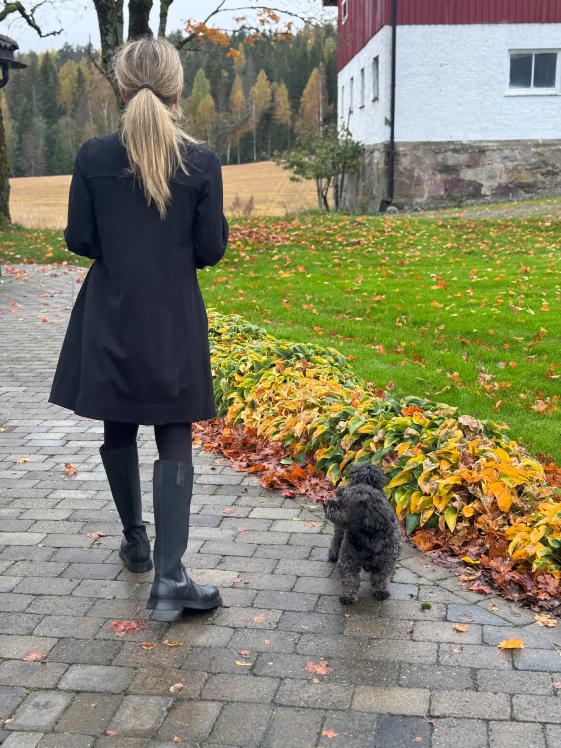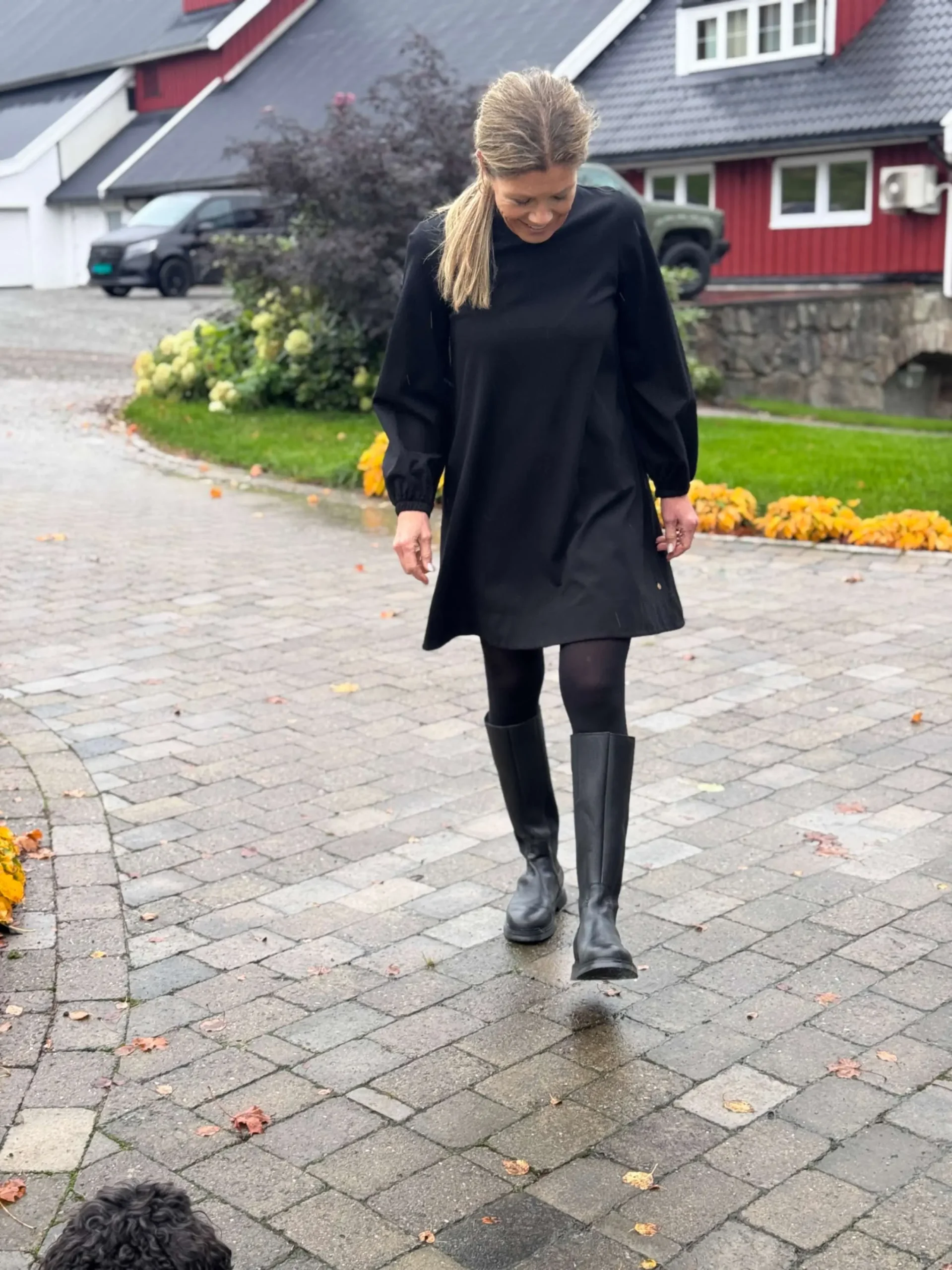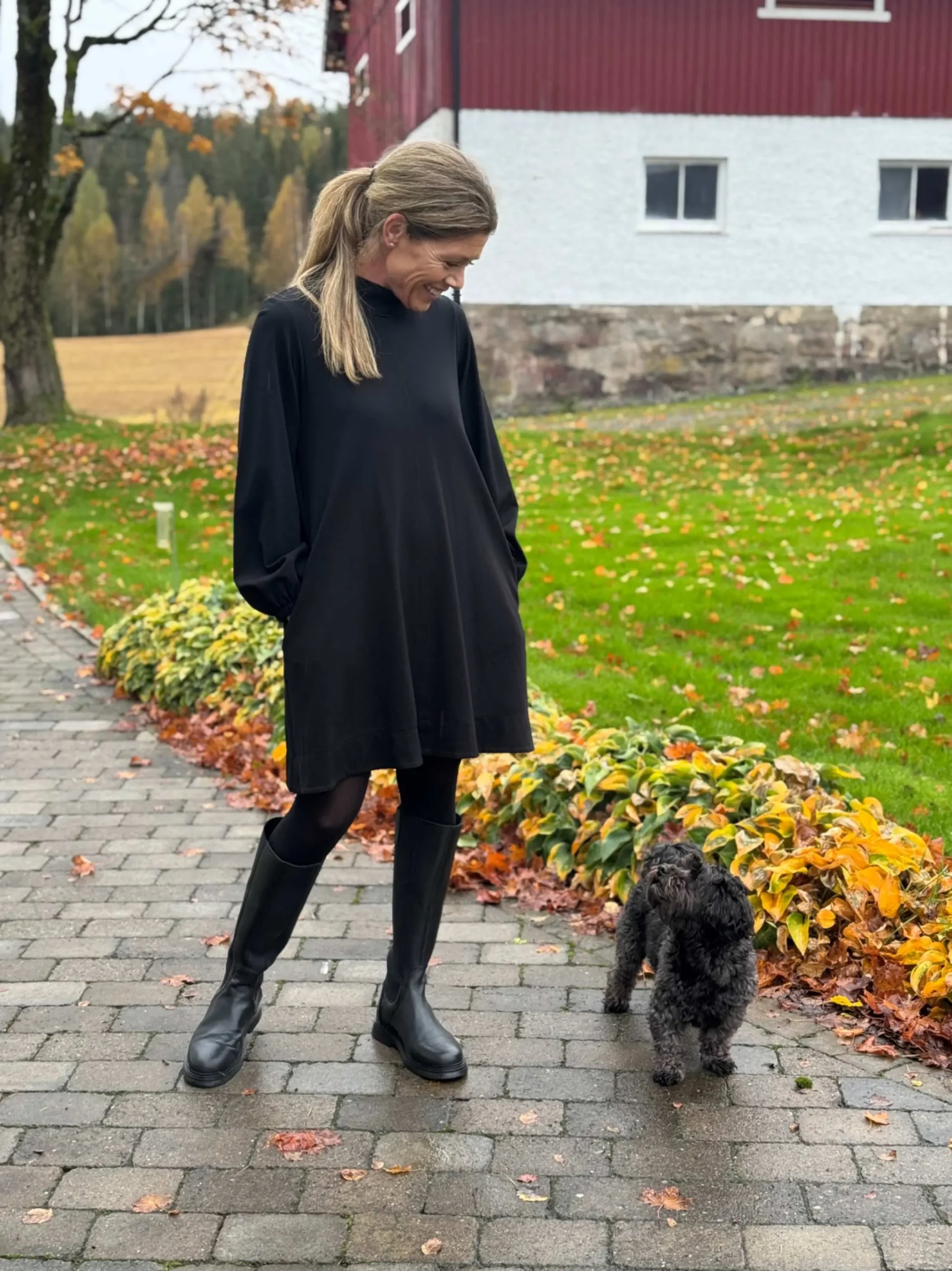 Kjolen har kort, flatterende lengde over kneet, lange ermer med strikk og en myk, høy hals. Perfekt å style både avslappet til hverdag og pyntet til fest.