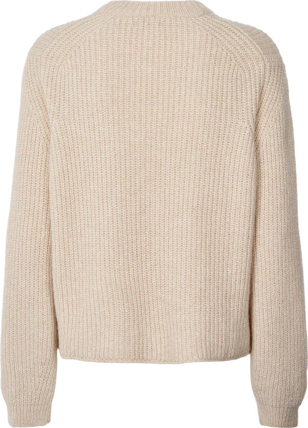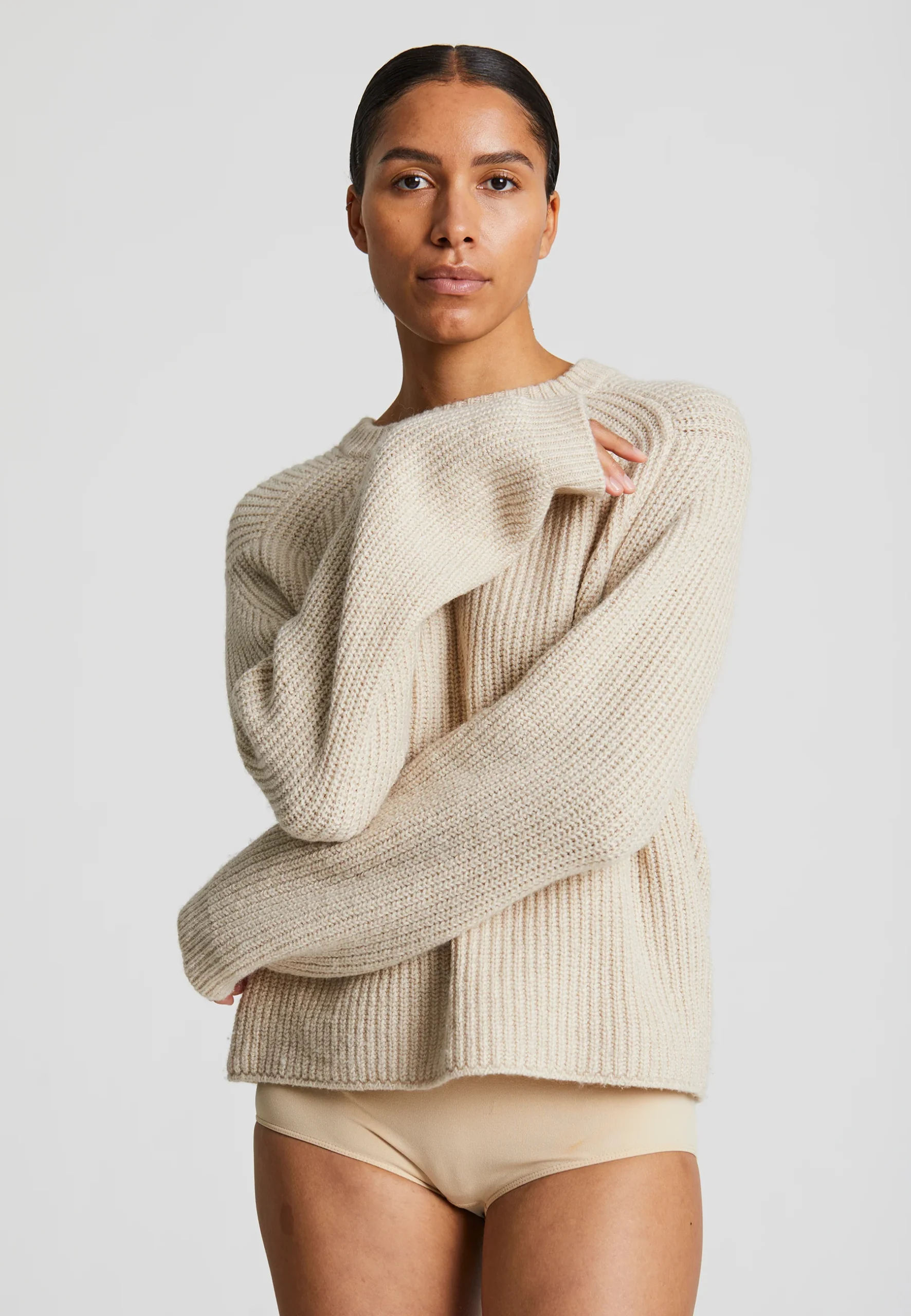 Signe er en deilig ribbestrikket genser fra Gai Lisva. Strikken har lange ermer, rund hals og senket skulder. Passformen er rett og avslappet.
