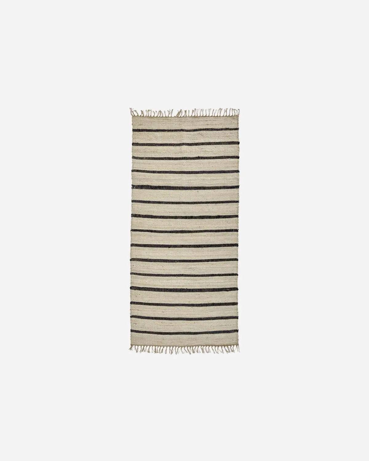 Myk opp hjemmet ditt med dette teppet. Teppet har størrelse som løper og er ideelt ved foten av sengen din, foran en hylleenhet eller i en lang gang. Teppet har nøytrale fargestriper og tykke frynser. Du kan ha teppet i mange år fremover takket være det slitesterke jutematerialet.