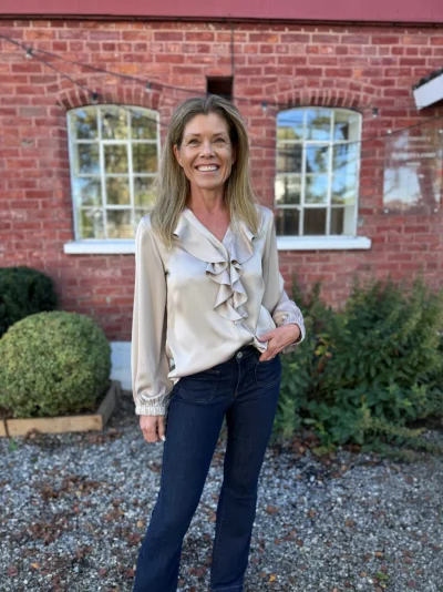 Nydelig bluse med rysjer, laget i det luksuriøse, semiglansede materialet Karmamia er kjent for. Faller tungt og elegant – passer til enhver anledning.