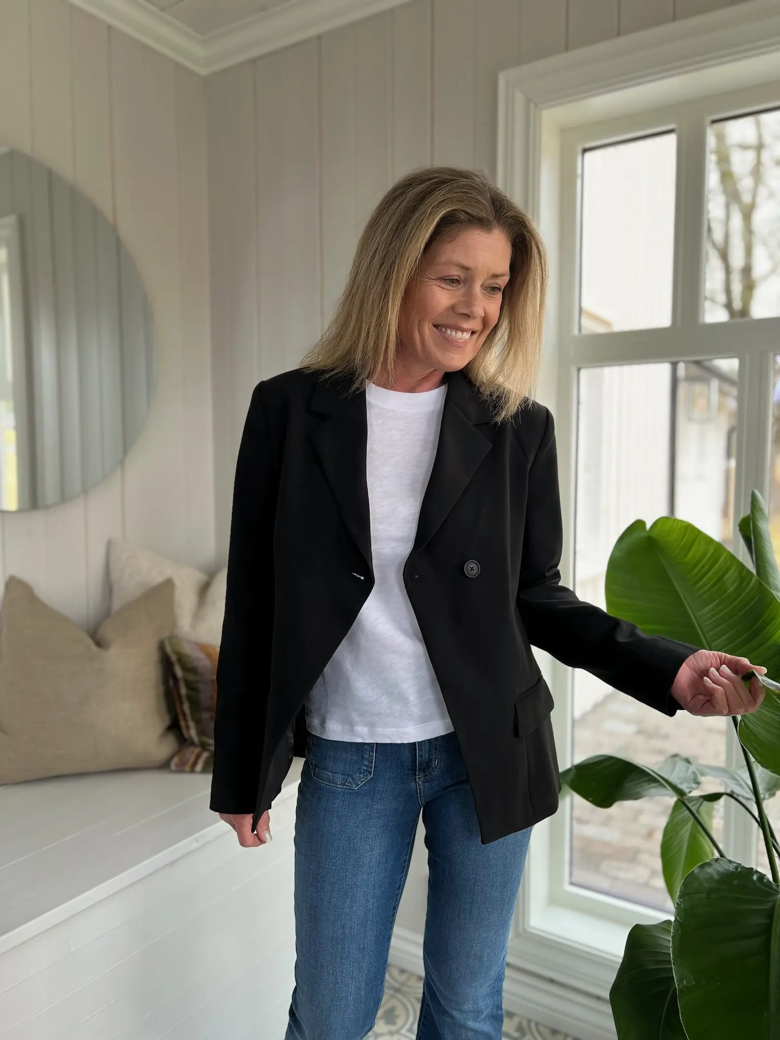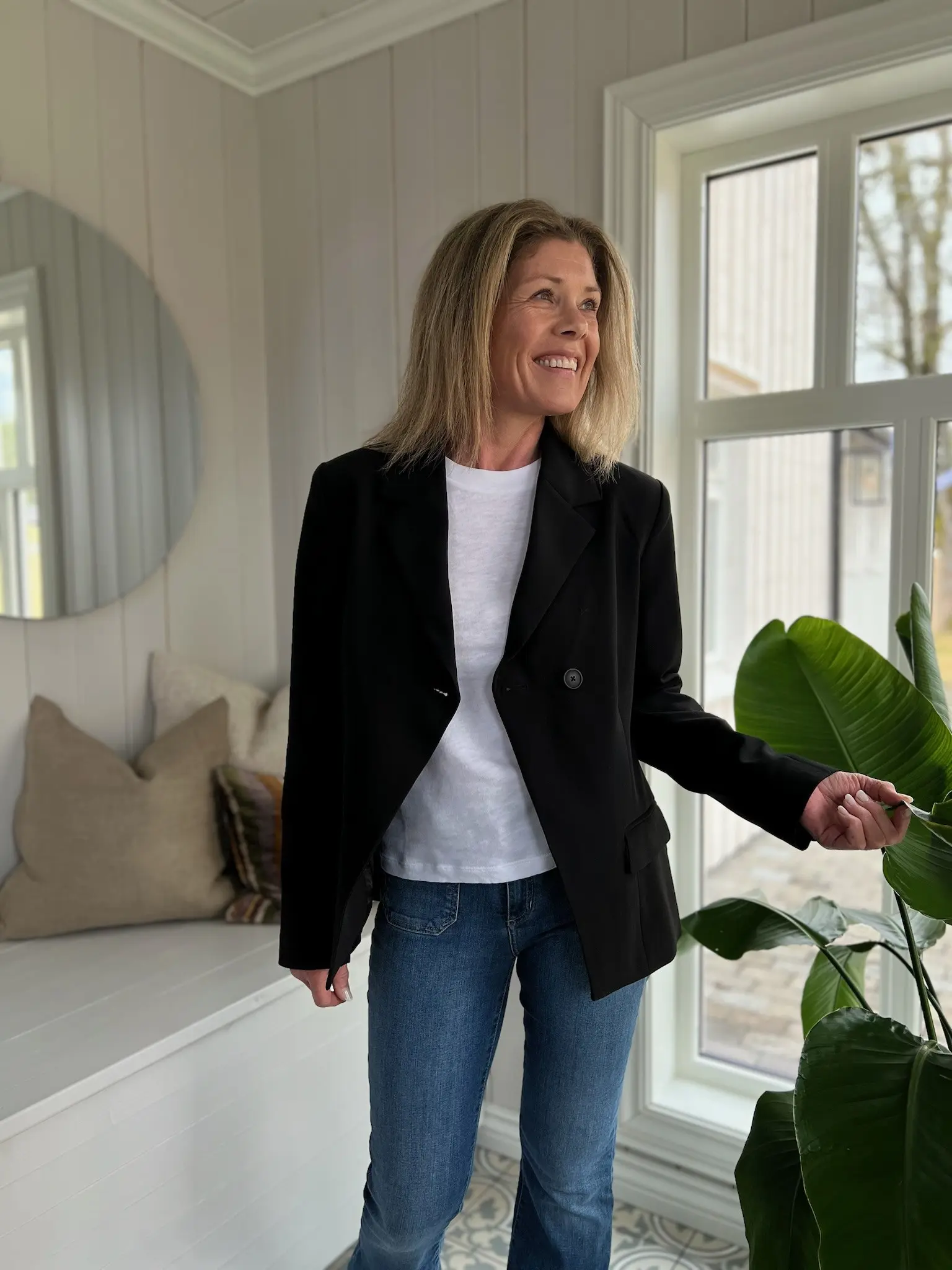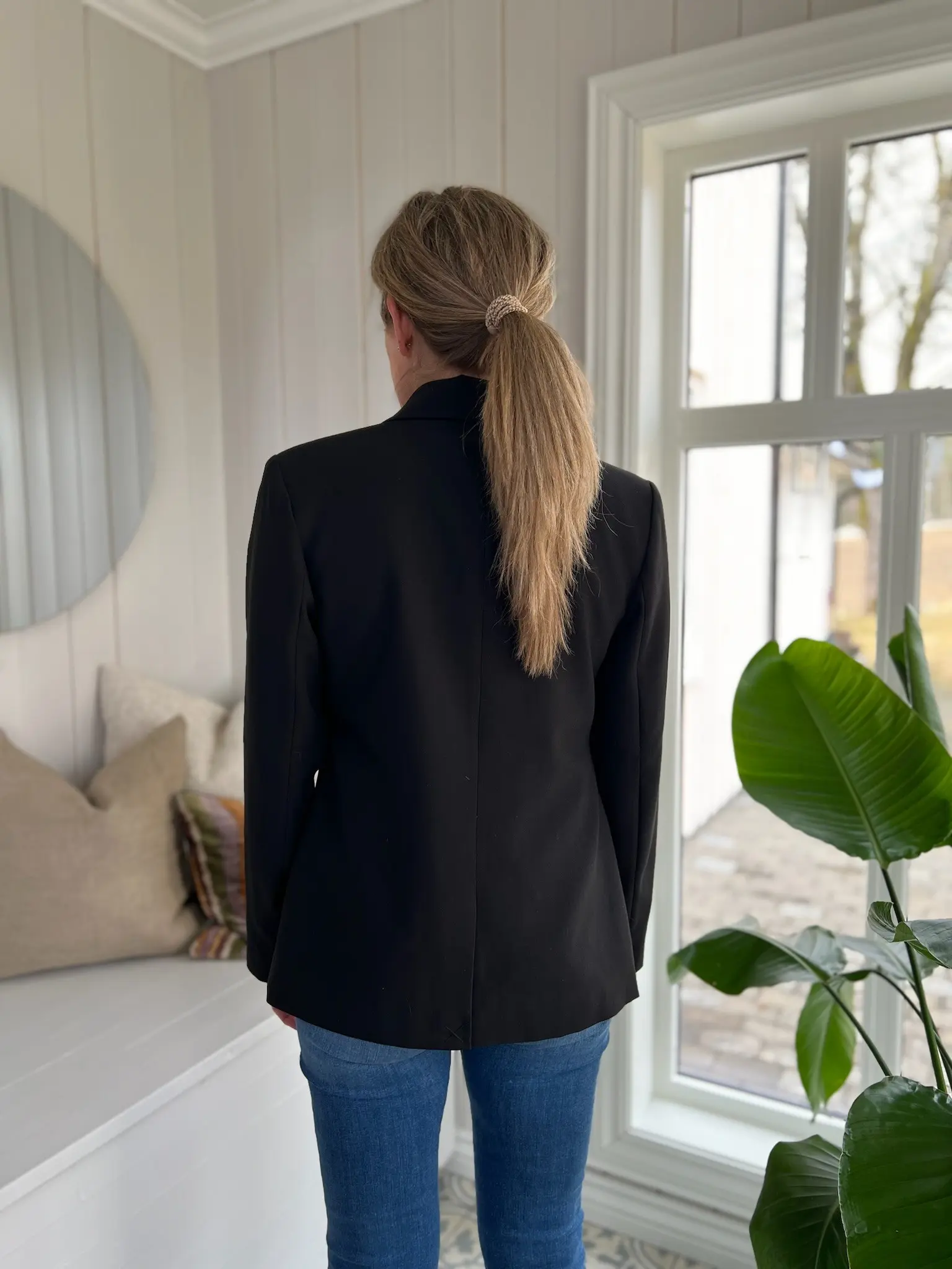 Tøff blazer med èn knapp som gir et tøft, skrått overlapp i front.
