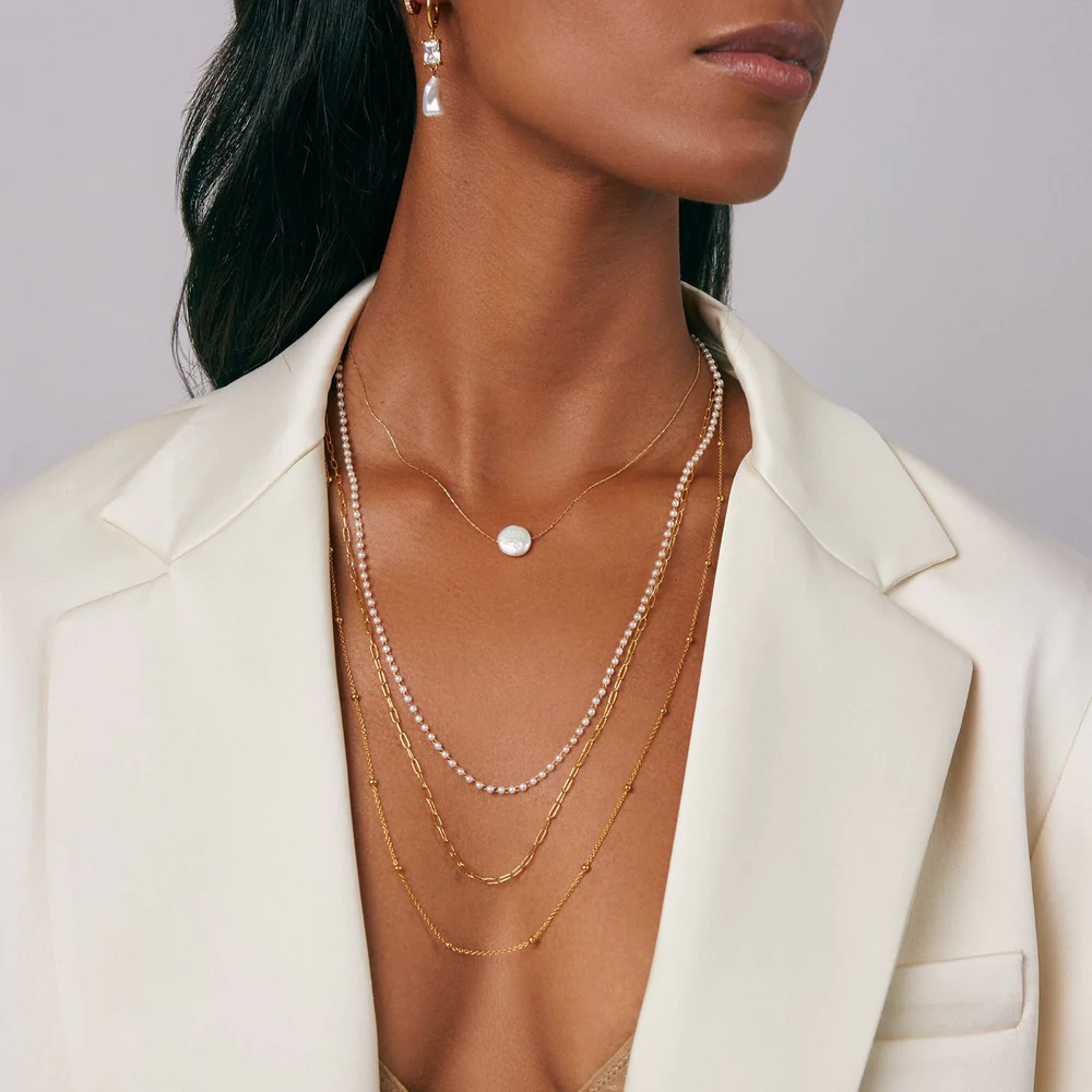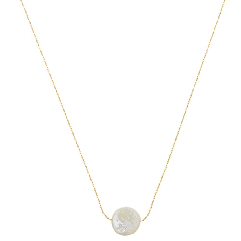 «Stationed Flat Pearl Collar Necklace» i gull fra Orelia. Smykket har et tynt, delikat gullkjede som bærer en flat ferskvannsperle i midten. Plassert på kragebenet er denne stilen flatterende og passer for alle.
