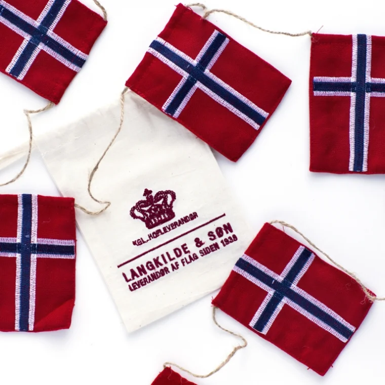 Stor flaggrekke laget av ekte flaggduk med 10 flagg, på en fin snor. Helt perfekt til 17. mai og fødselsdagen eller på juletreet.