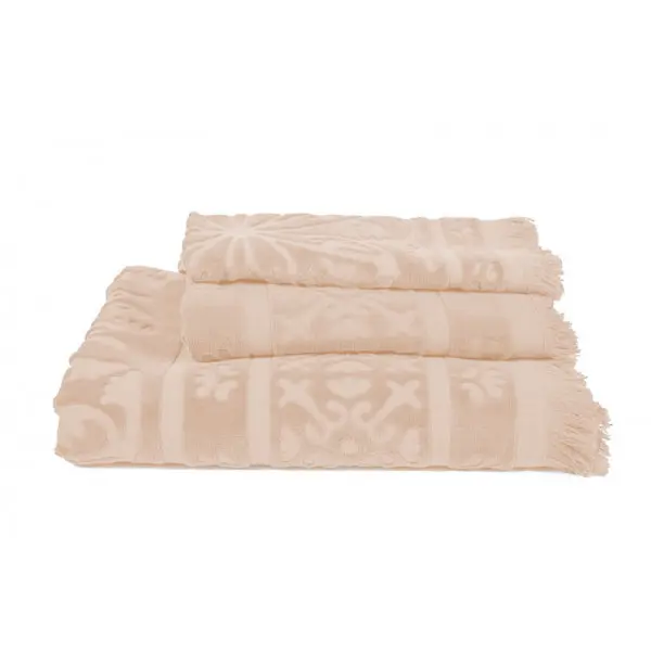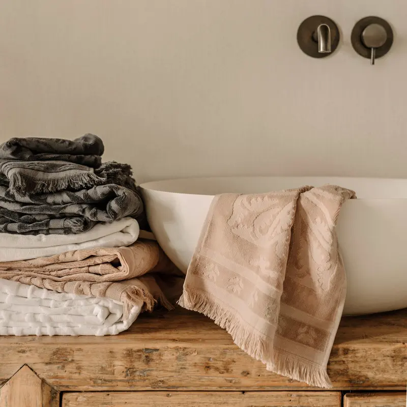 Fine håndklær med lekkert mønster pynter opp på badet.