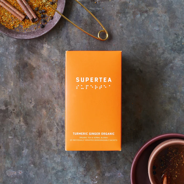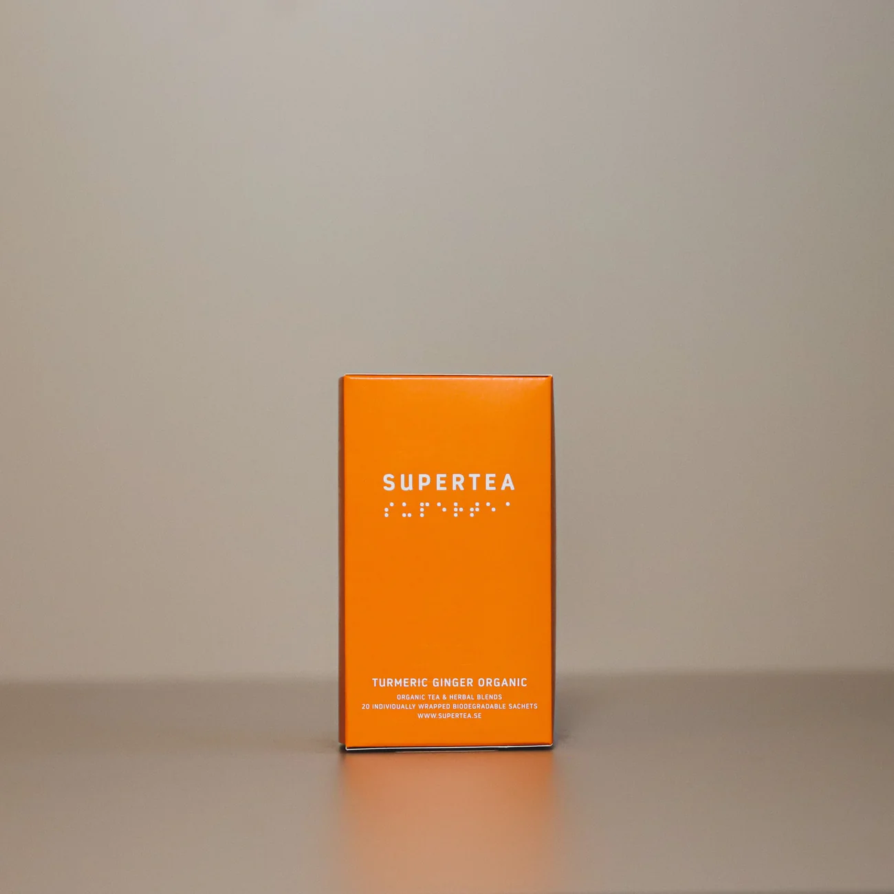 Turmeric Ginger er en smakfull te, laget av organiske ingredienser sammensatt av gurkemeie, ingefær, kanel og lakrisrot. Teen er naturlig koffeinfri, og gir alle velvære-fordelene til urtene uten noen sentralstimulerende midler. Nyt alle de antiinflammatoriske og antioksidanteffektene av gurkemeie, sammen med de beroligende effektene av ingefær og kanel, uten koffeinstøt.