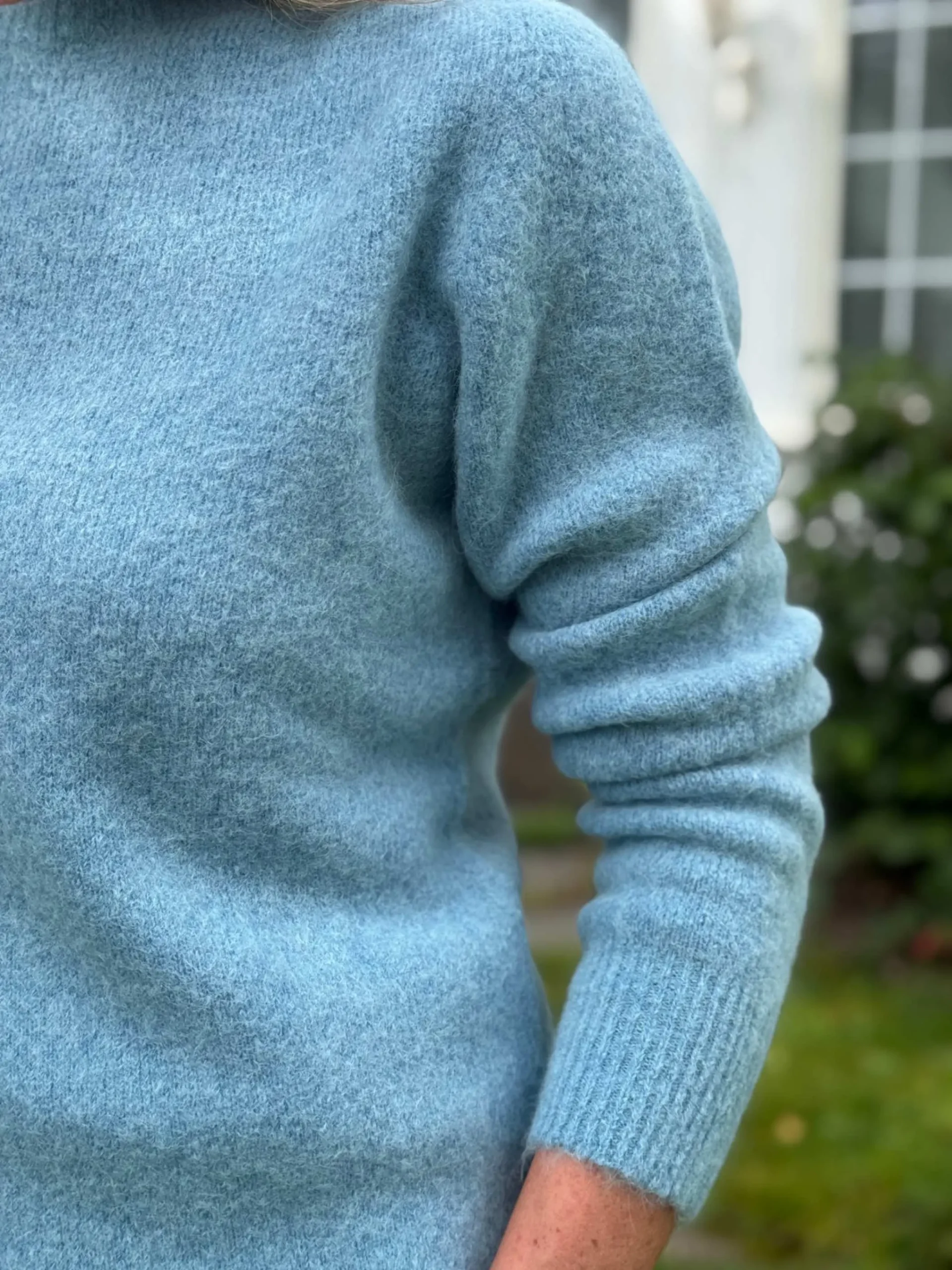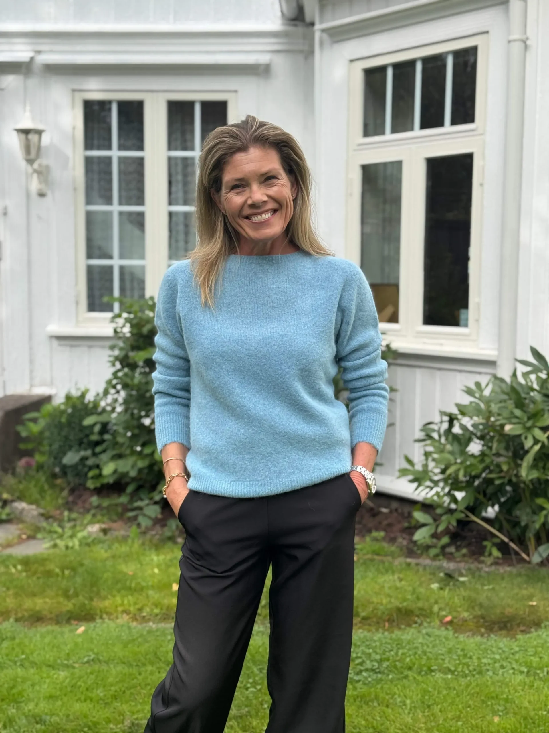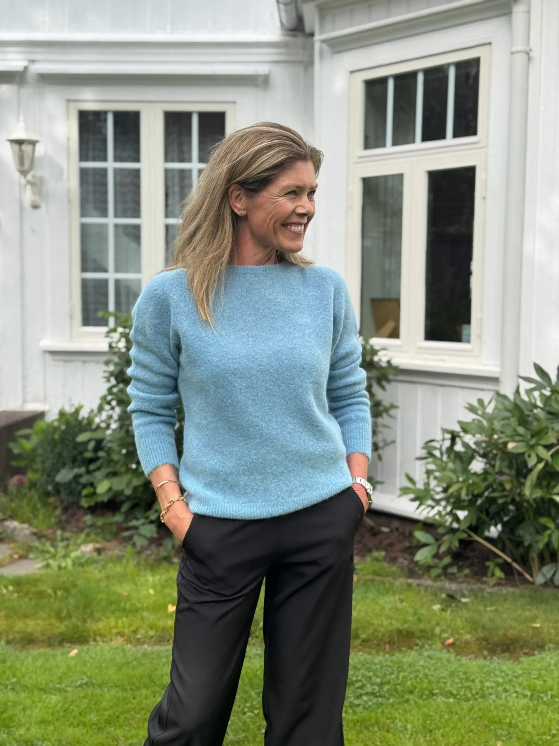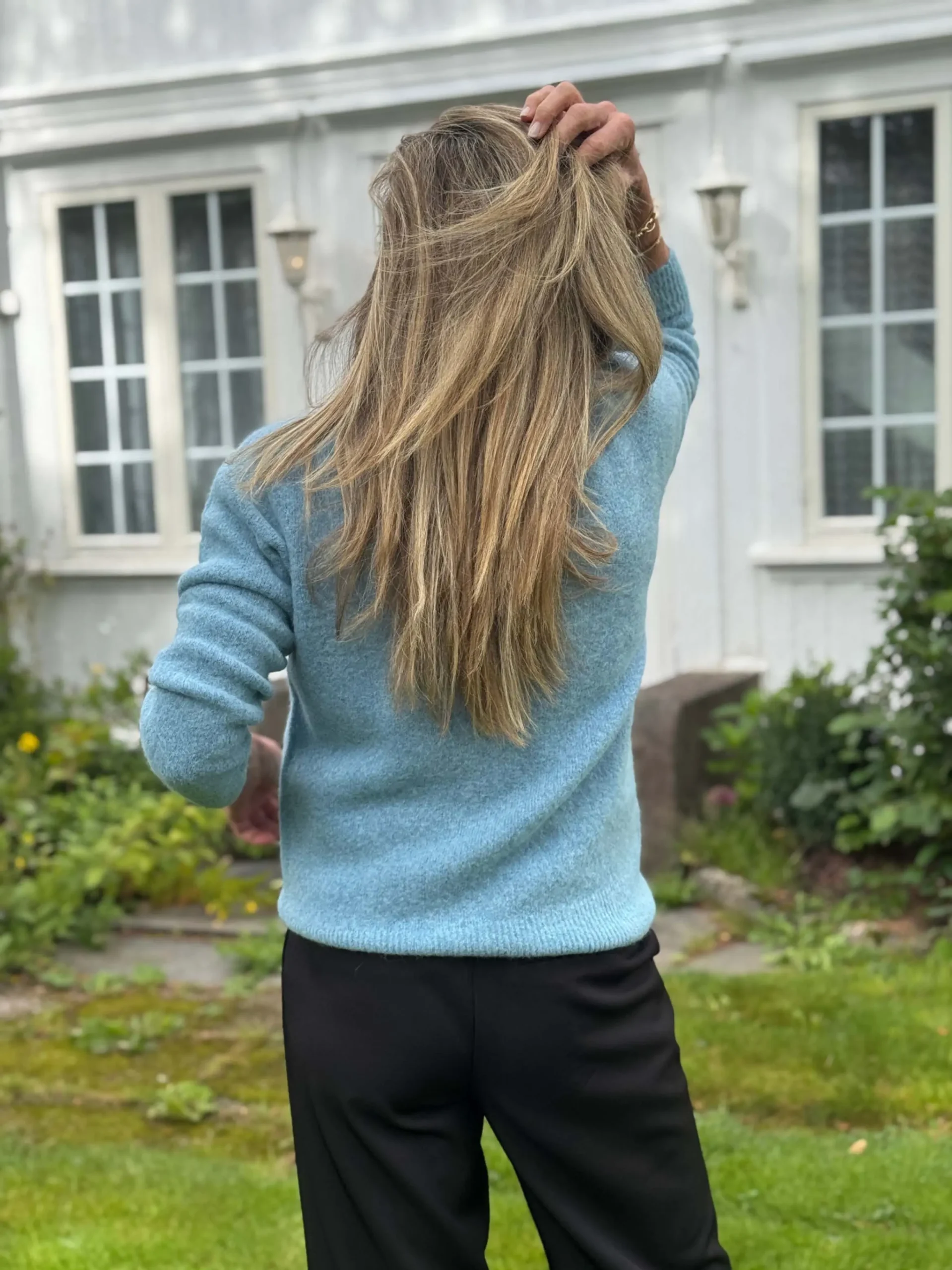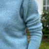 Klassisk strikkegenser i lys blå. Myk og tidløs med lange ermer og rund hals. Allsidig plagg du kan bruke til det meste – en favoritt i garderoben i mange år fremover.