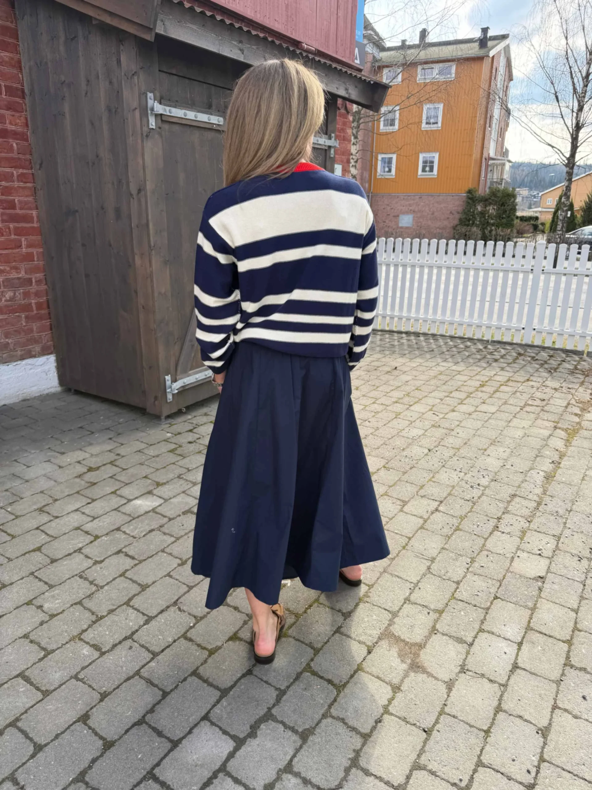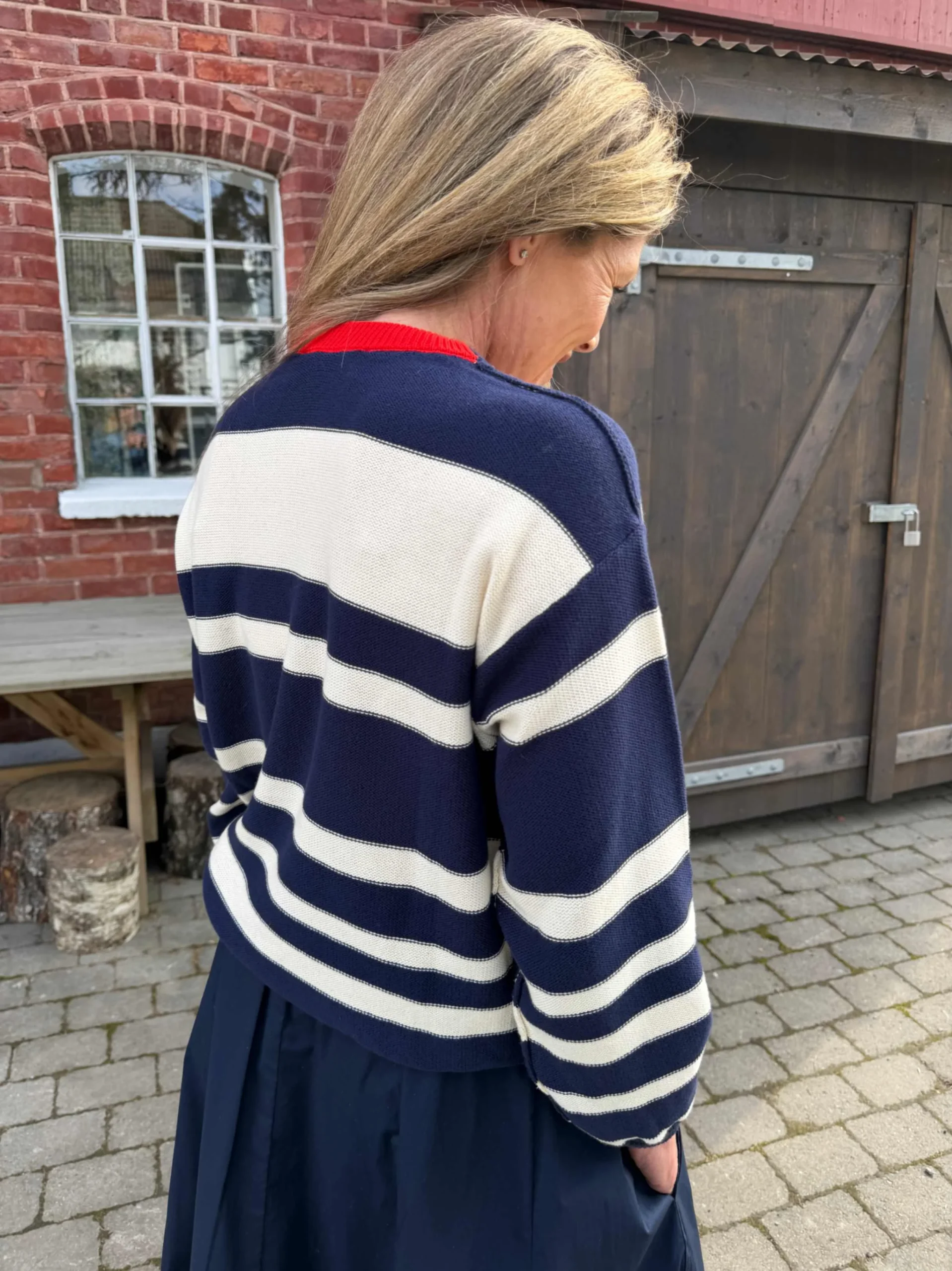 Lekker genser med brede striper i navy/cocco og en rød detalj i nakken. Et allsidig plagg som er lett å kombinere med andre plagg som jeans og skjørt.