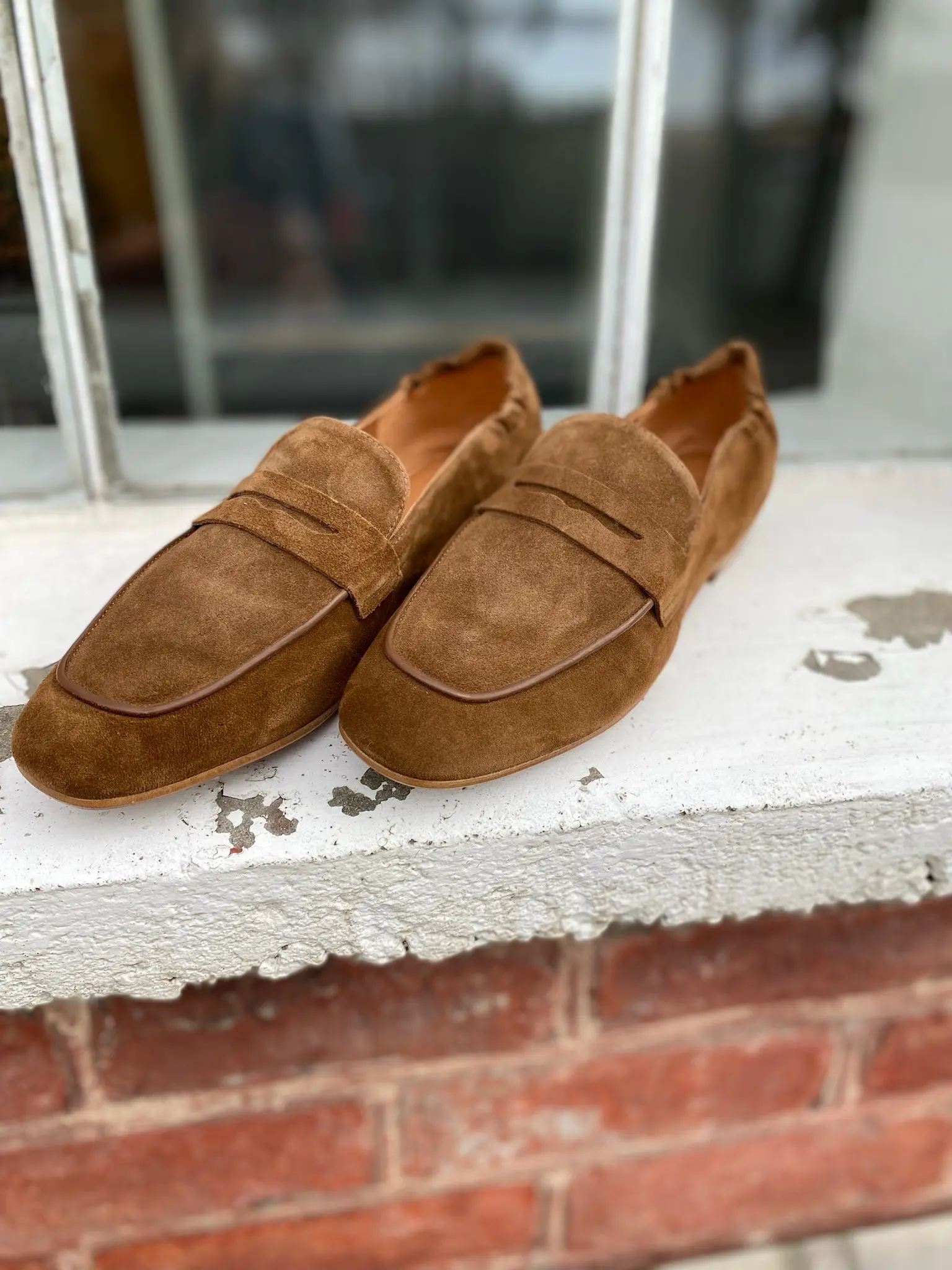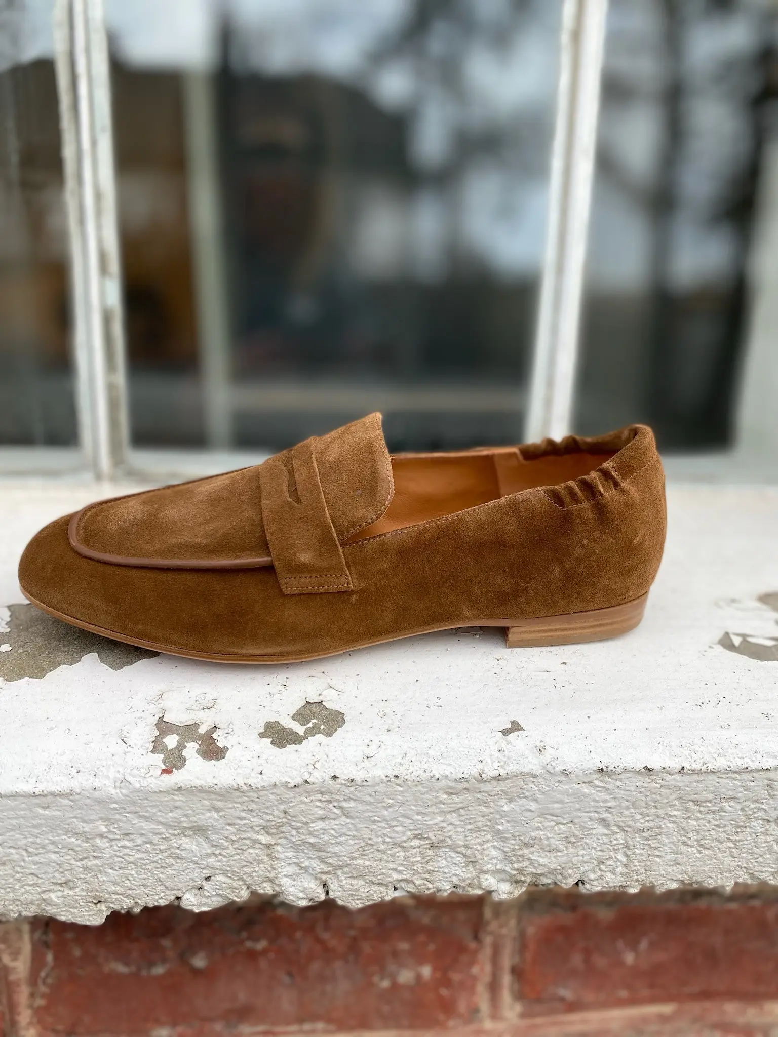 Loafers i nydelig lysebrunt, semsket skinn med avrundet tå. Skoen har strikk i hælkappen for god komfort.
