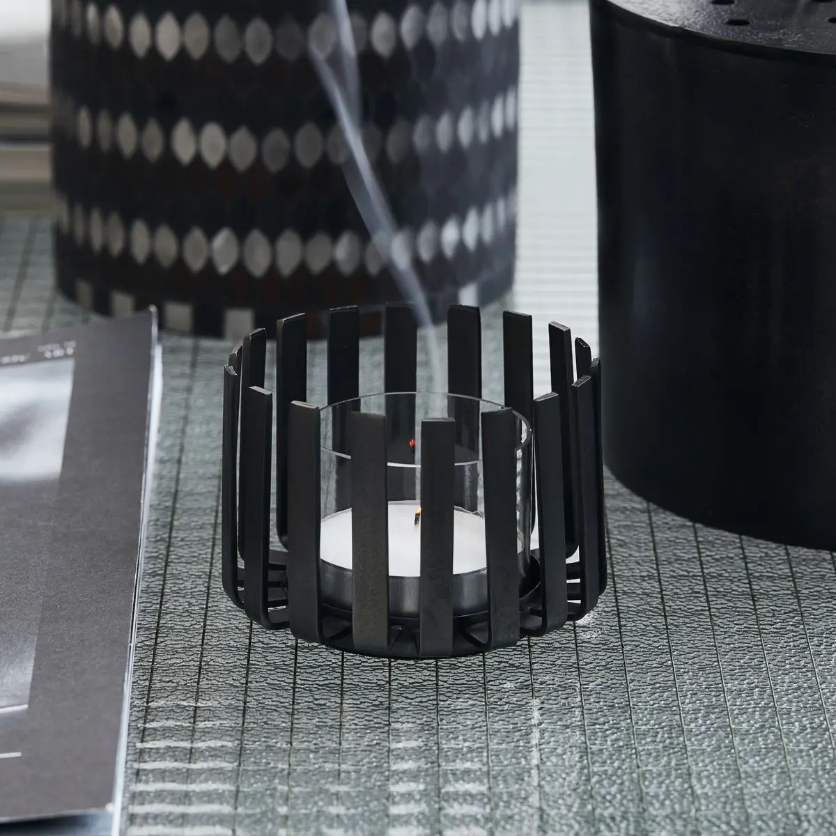 Minimalistisk, men likevel stilig med vinklene og kantene på jernmaterialet. Plasser et telys i innsatsen og la lyset skinne gjennom hullene.