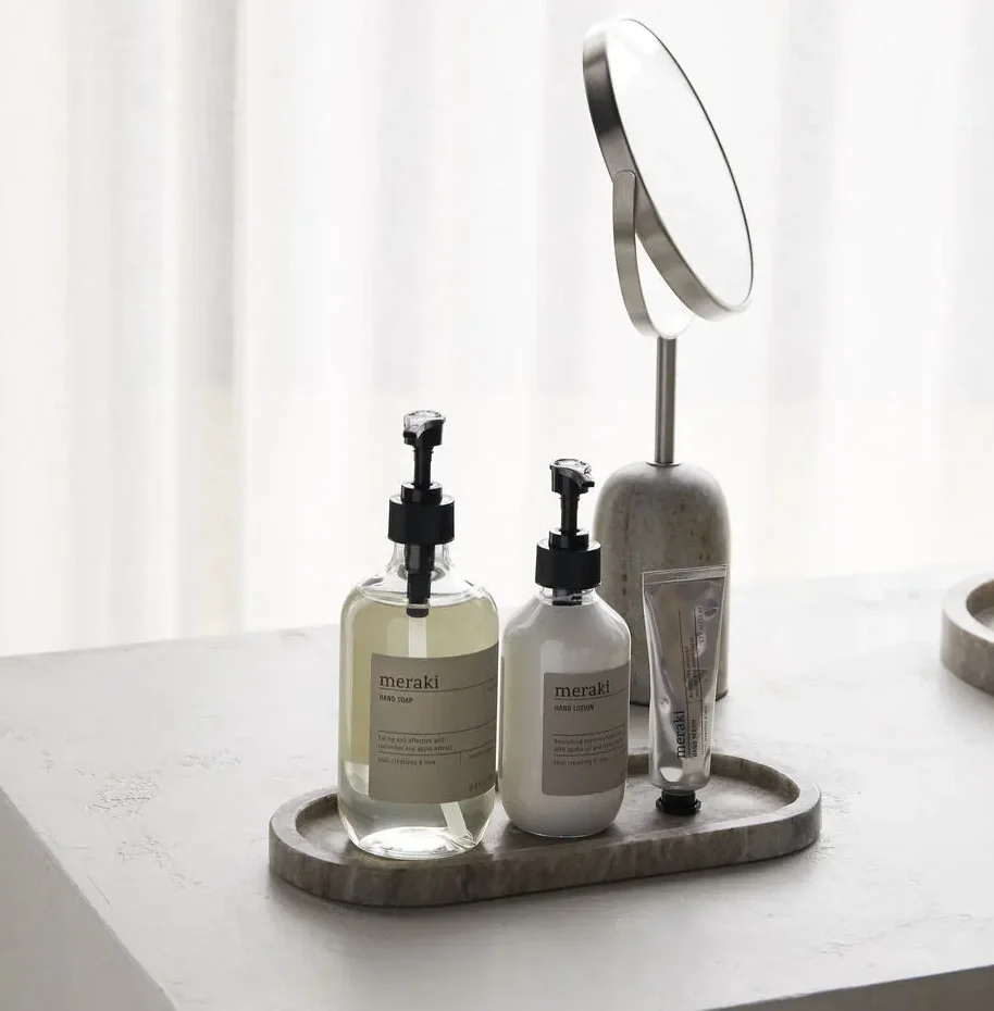 Sett dine såper, kremer og mer på dette tidløse og minimalistiske marmorbrettet fra Meraki. Et naturlig og allsidig materiale som gir en luksuriøs spa-stemning på badet ditt. Størrelsen passer perfekt til 3 Meraki-flasker, men er laget til akkurat det du vil oppbevare og fremheve. Finish og farge kan variere.