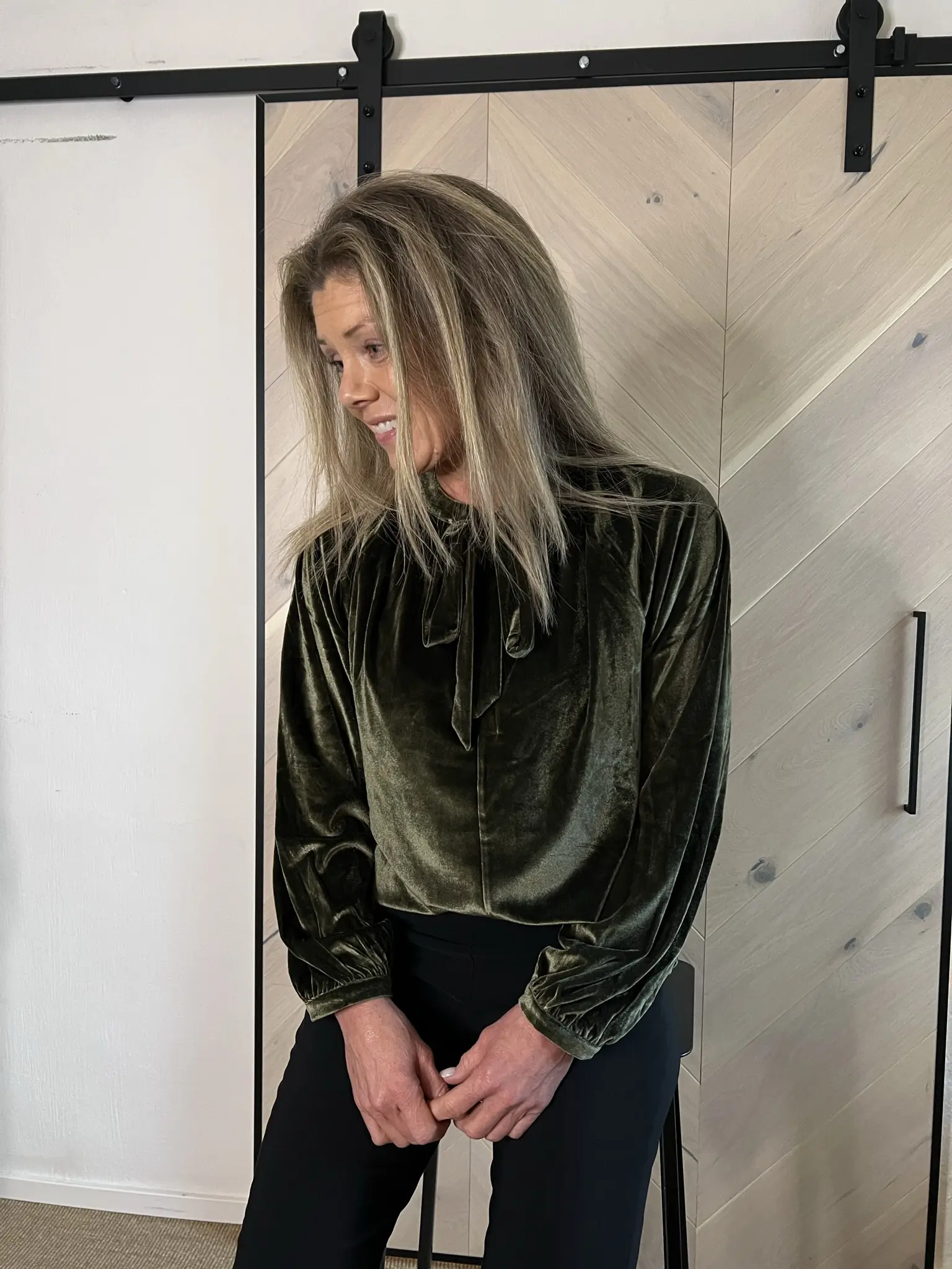 Velourbluse med knyting i halsen. Blusen har en rett fasong med v-hals, knyting og lange armer.
