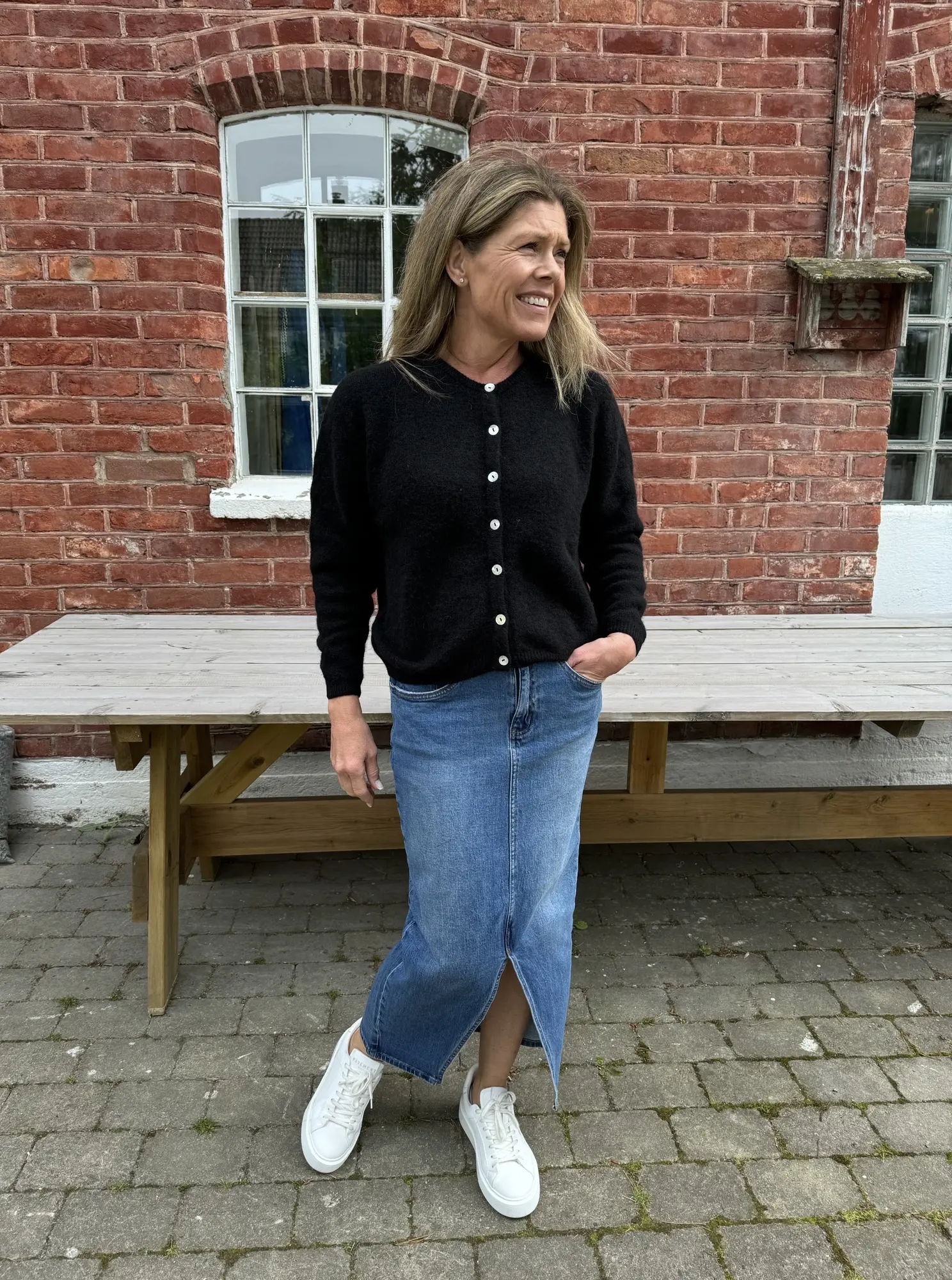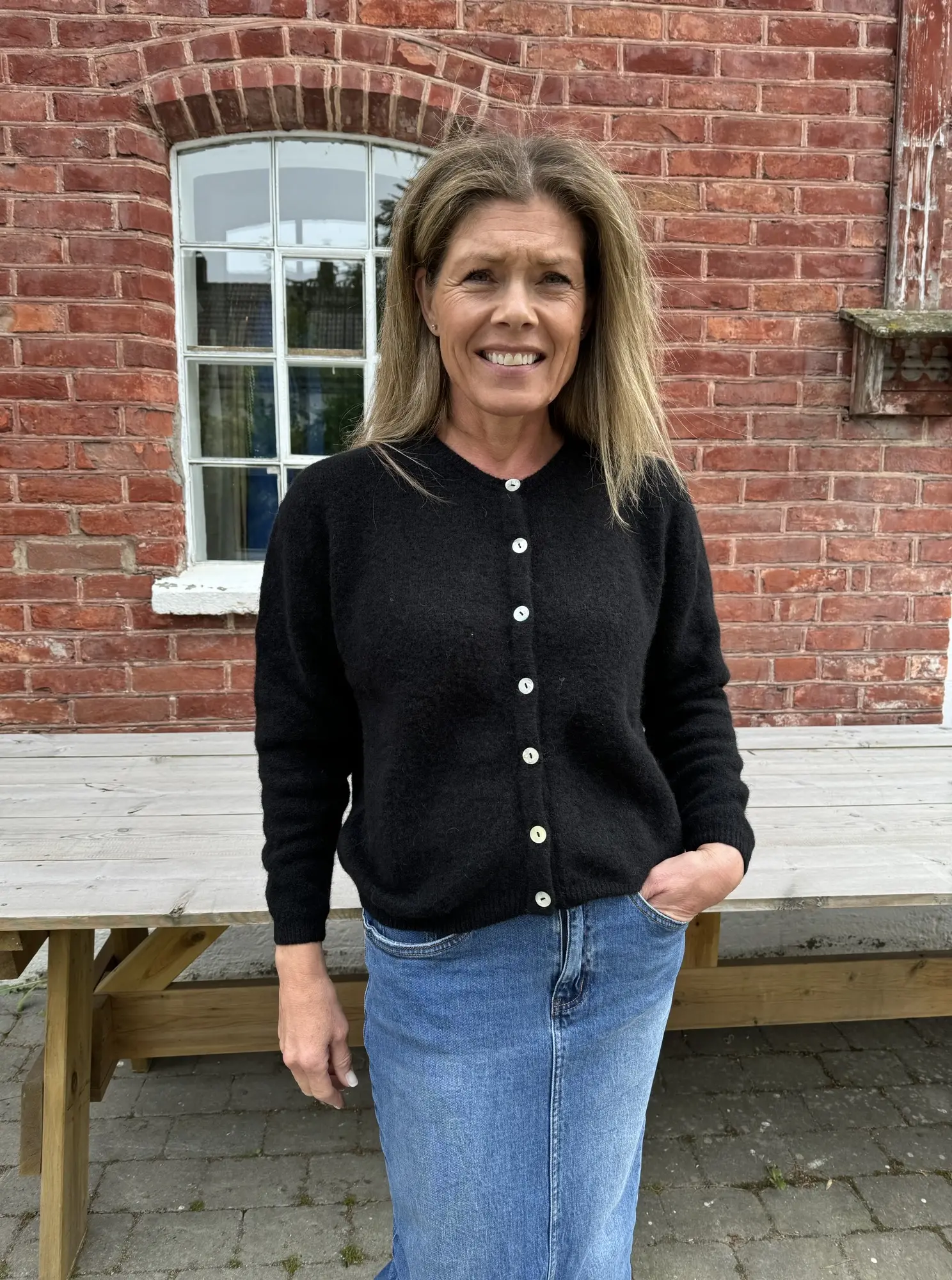 Deilig langermet cardigan med rund hals. Bruk den alene med knappene lukket, eller hiv den over en T-skjorte eller bluse. Enkel å kle opp og ned.
