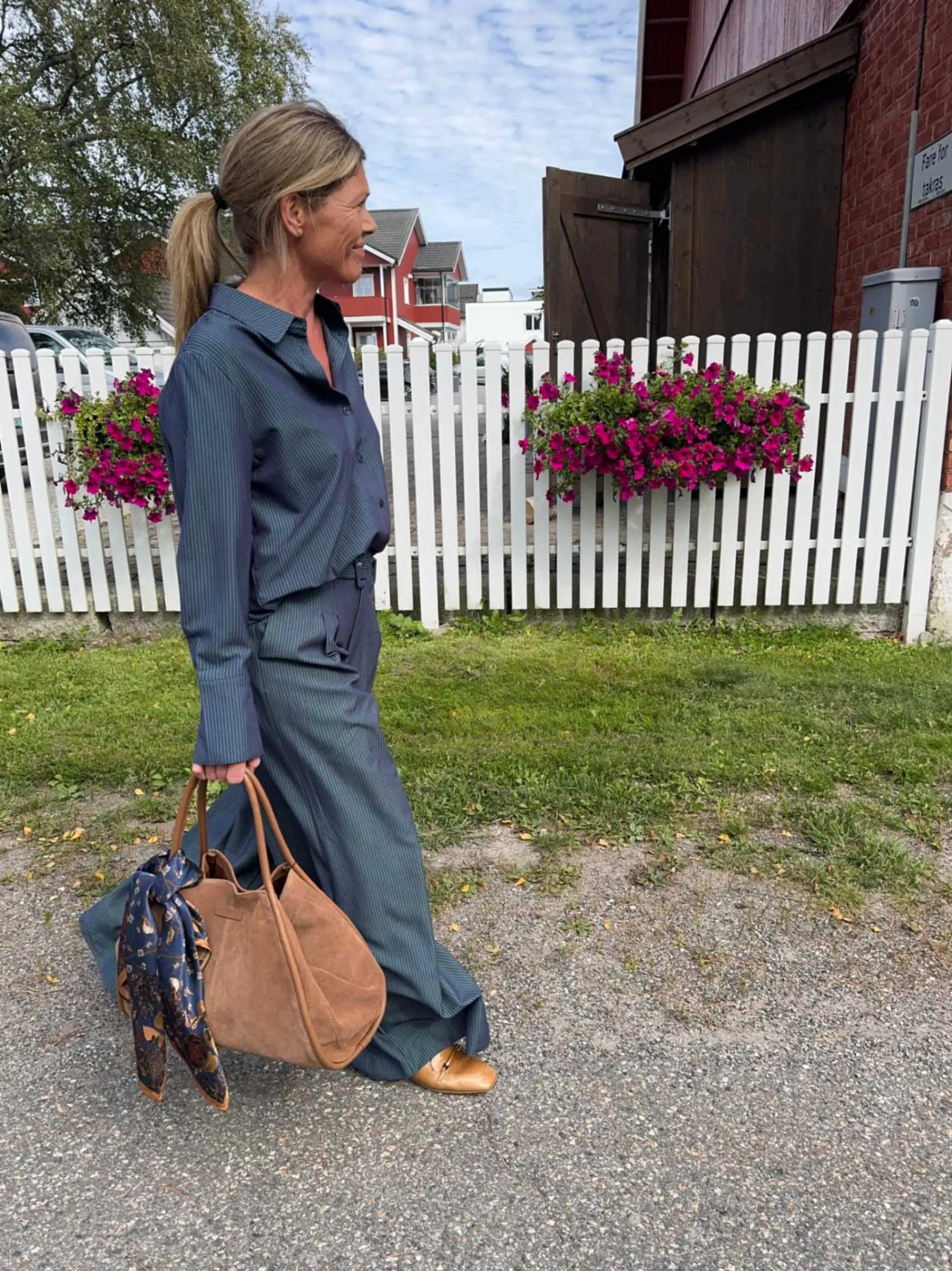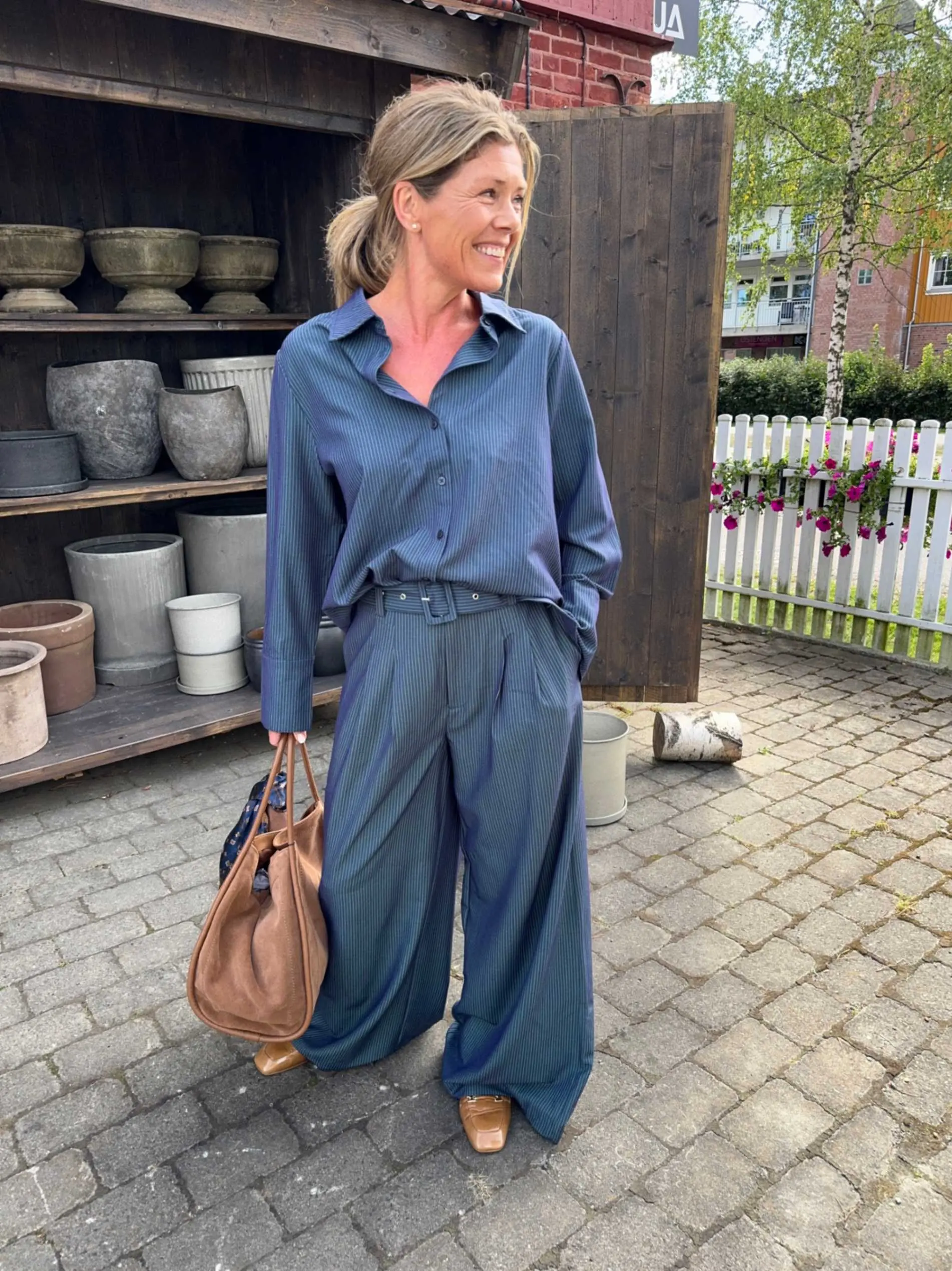 Stilig og behagelig bukse i blått med hvite striper. Høy midje som sitter fint, og vide ben som gir et lett og luftig fall. Perfekt både til hverdags og når du vil pynte deg litt.