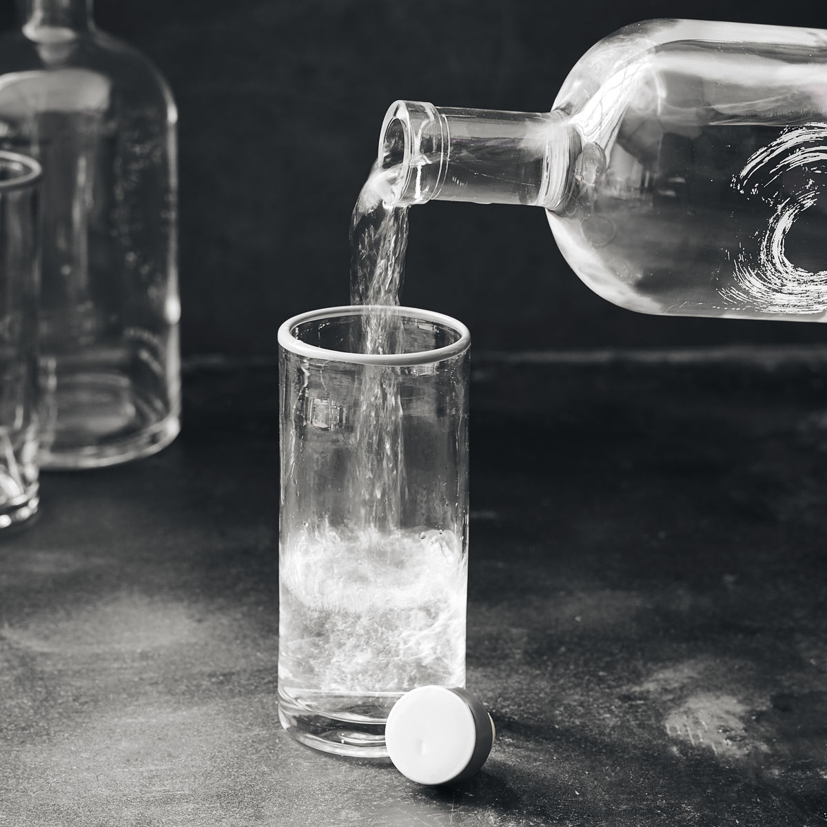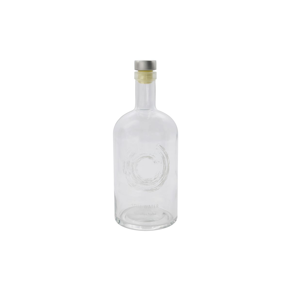 Server vann i glassflaske med et dekorativt trykk fra Nicolas Vahé. Flasken er laget for vann fra kranen og kommer med et praktisk lokk.