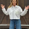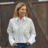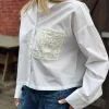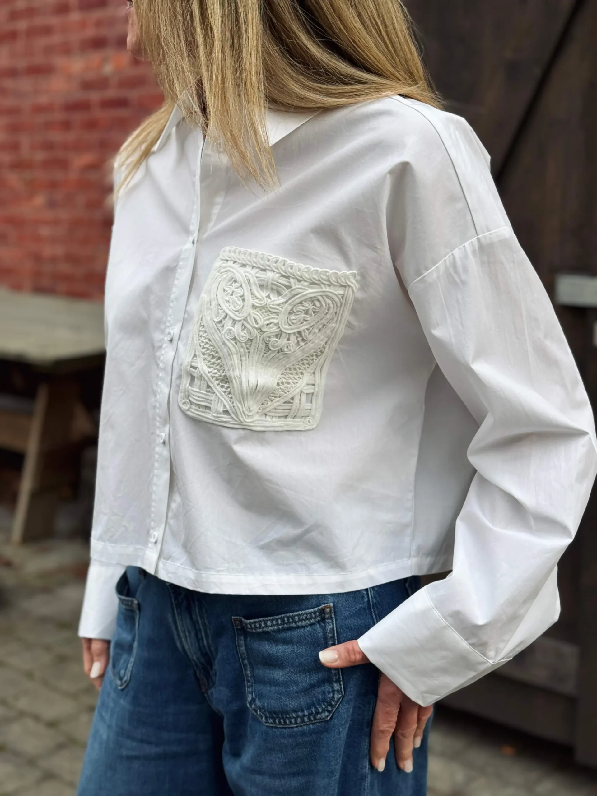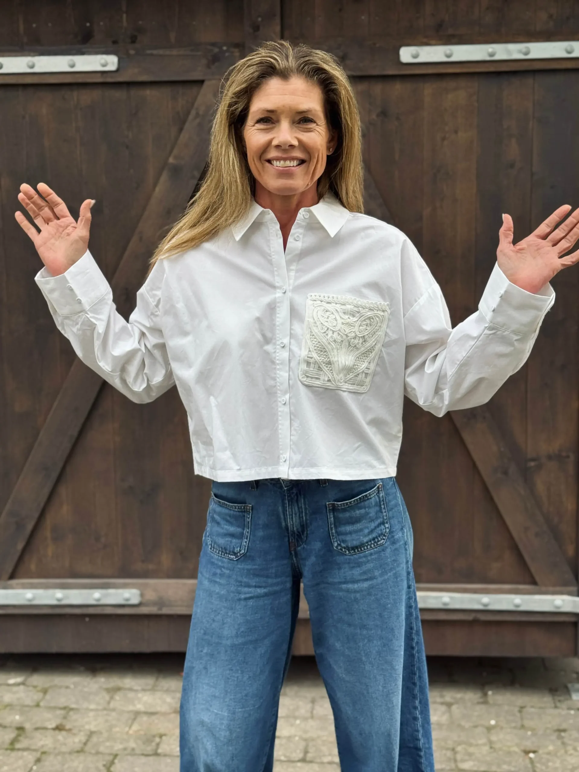 Zelia Shirt fra Gossia – en klassisk cropped skjorte med unik brodert lomme. Krage, lange armer med mansjett og boxy passform gjør den enkel å style med alt fra jeans til dressbukser og skjørt.