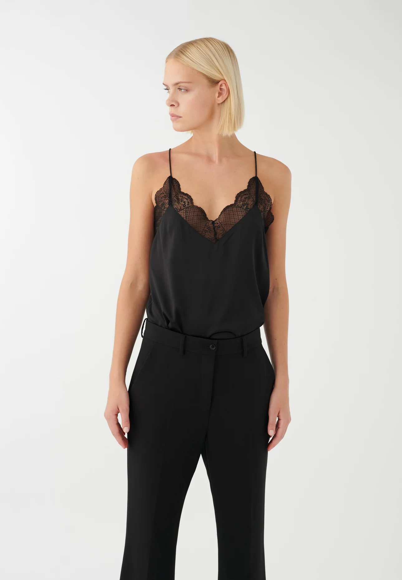 Lekker singlet i silke satin, perfekt under en blazer. Fine blonde detaljer i halsen, lett v-utringet med spagettistropper.