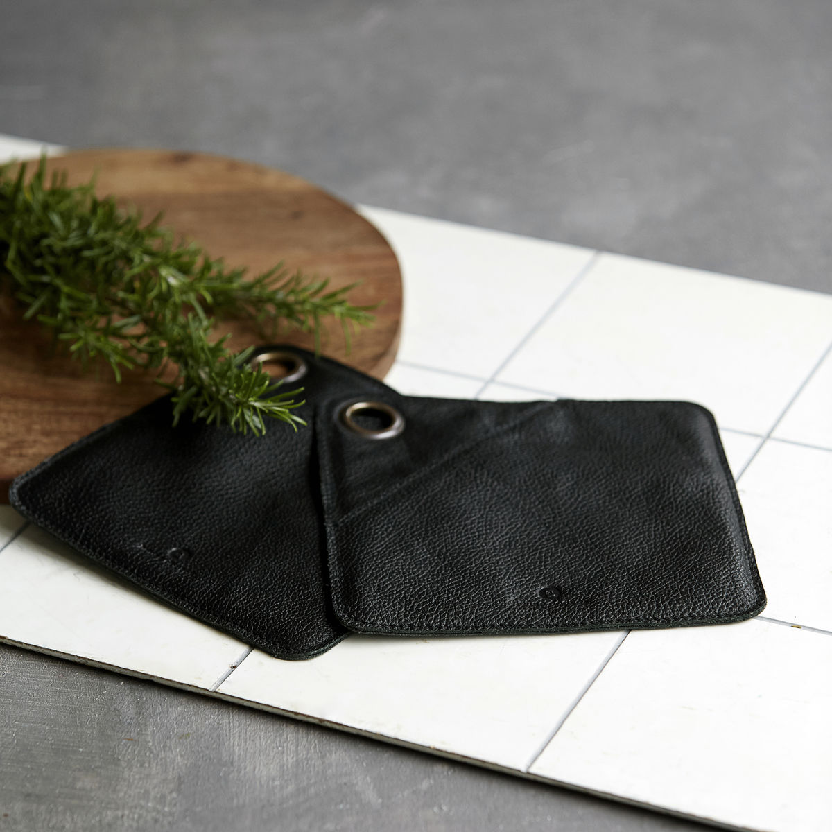 Square grytekluter fra House Doctor er laget av bøffelskinn og kommer i en fin, svart farge. Naturmaterialet gir dem et eksklusivt og maskulint utseende. Hvert sett inneholder 2 stykk. Rengjør gryteklutene ved å tørke av dem med en fuktig klut. Kan behandles med skinnbalsam.