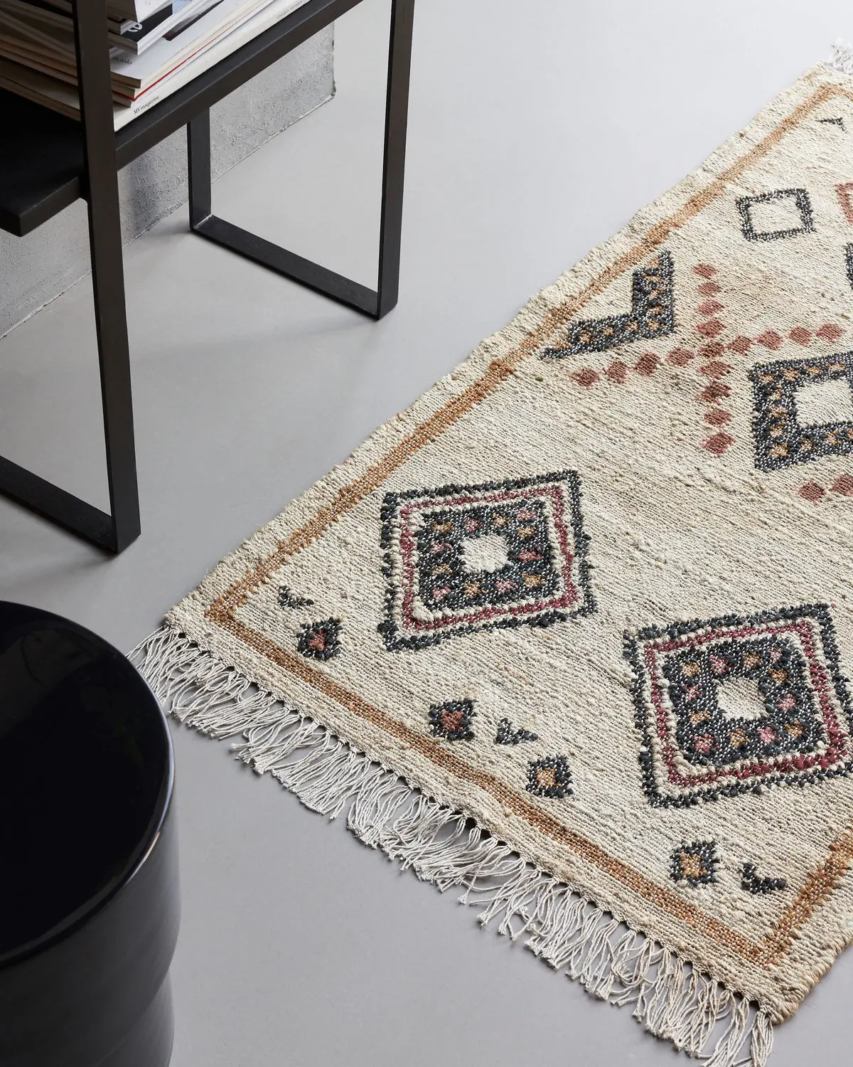 Dette teppet har et diamantmønster med, duse farger. Laget av en jute- og bomullsblanding, er den ideell for områder med mye aktivitet, for eksempel ved sitteplasser eller i gangen. På denne måten beskytter du ikke bare gulvet, men du skaper mykhet og et fokuspunkt som binder rommet sammen.