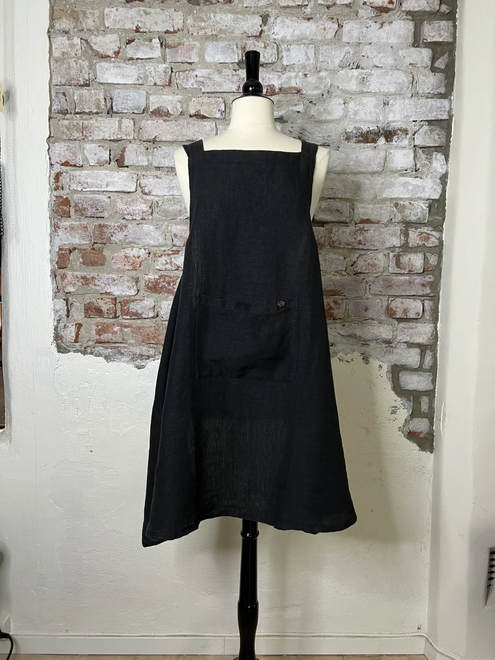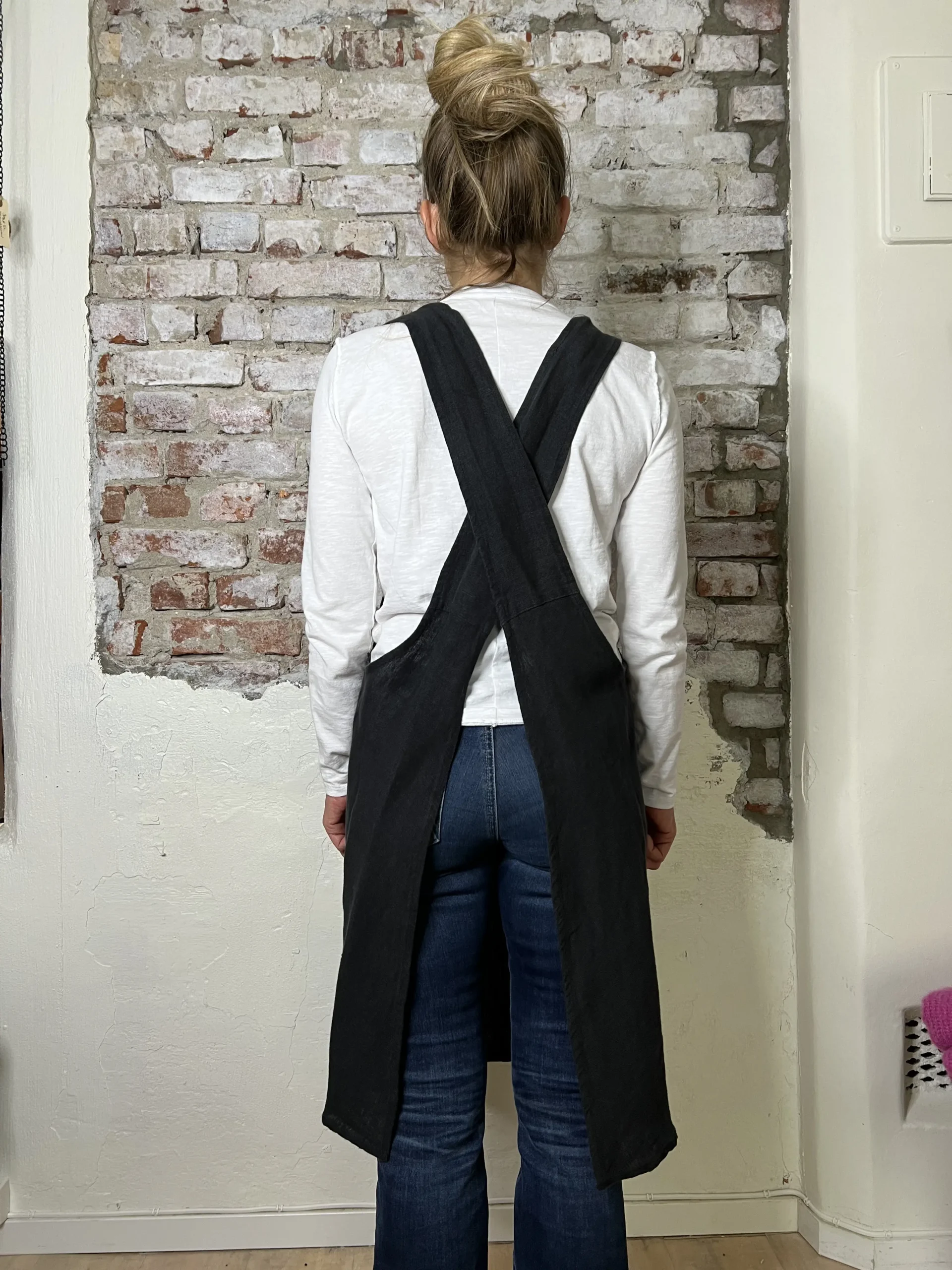 Lekkert forkle i myk stenvasket lin. Praktisk lomme foran og kryss i ryggen som ikke strammer og krøller antrekket under.