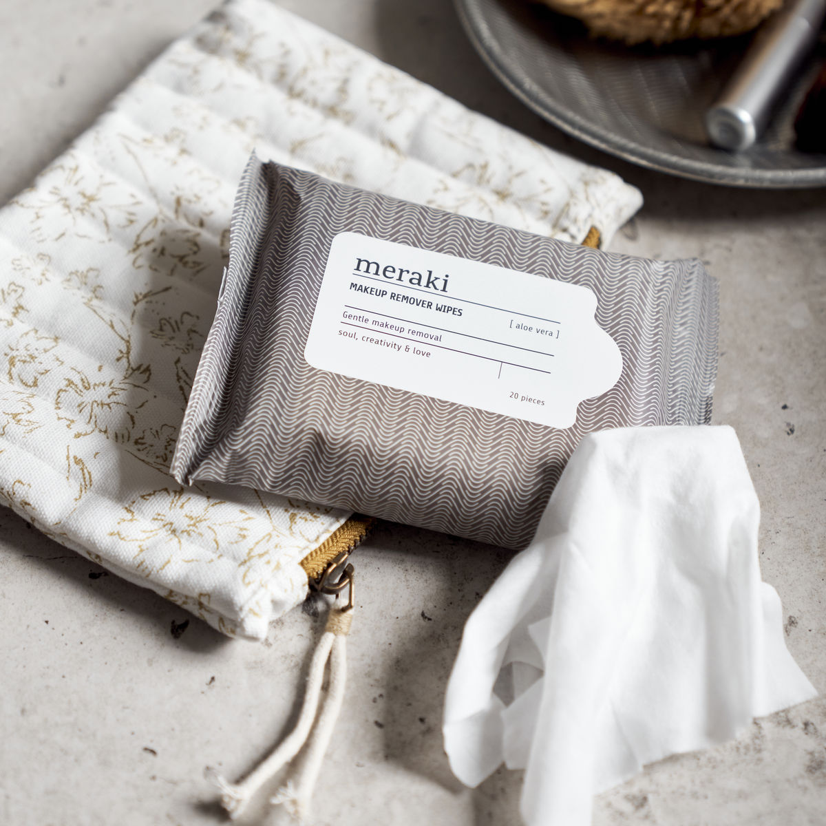 En pakke med 20 makeup renseservietter fra Meraki med aloe vera, vitamin E og kamille. Bruk en renseserviett for å fjerne mascara og make-up på en rask og skånsom måte.