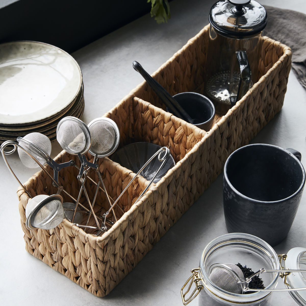 House Doctor har designet oppbevaringsløsningen i håndvevd vannhyacint for et naturlig og dekorativt utseende. Bruk den på badet for å holde orden på småting og hudpleieprodukter du trenger hver dag. På kjøkkenet er det en kjærkommen løsning på den rotete skuffen da du kan dele de små, hverdagslige gjenstandene opp i rom.
