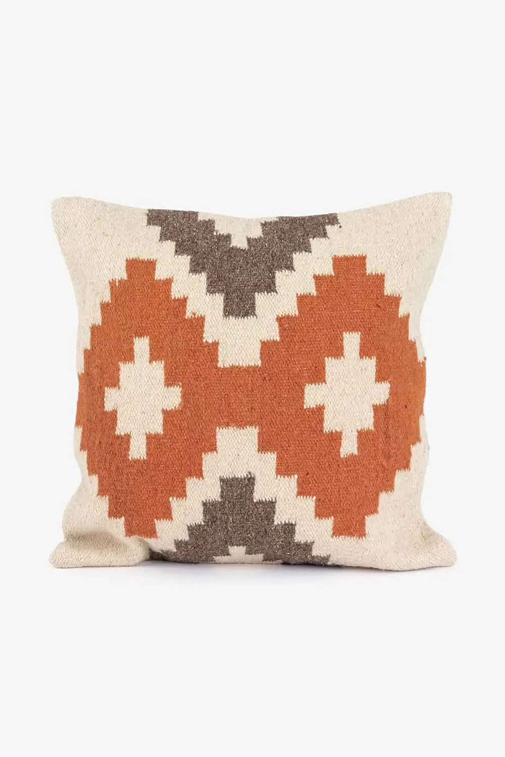 Naturbeige putetrekk med kelim-mønster i rustrødt og brunt. Mønstret er vevet i ull.