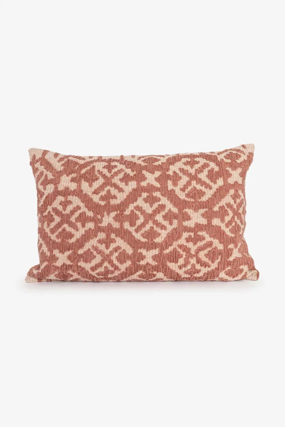 Unik og dekorativ pyntepute i bomull med broderte tekstilbånd i en rustikk finish. Putetrekket har et avrundet geometrisk mønster i en dyp varmrosa farge på naturbeige bunn.