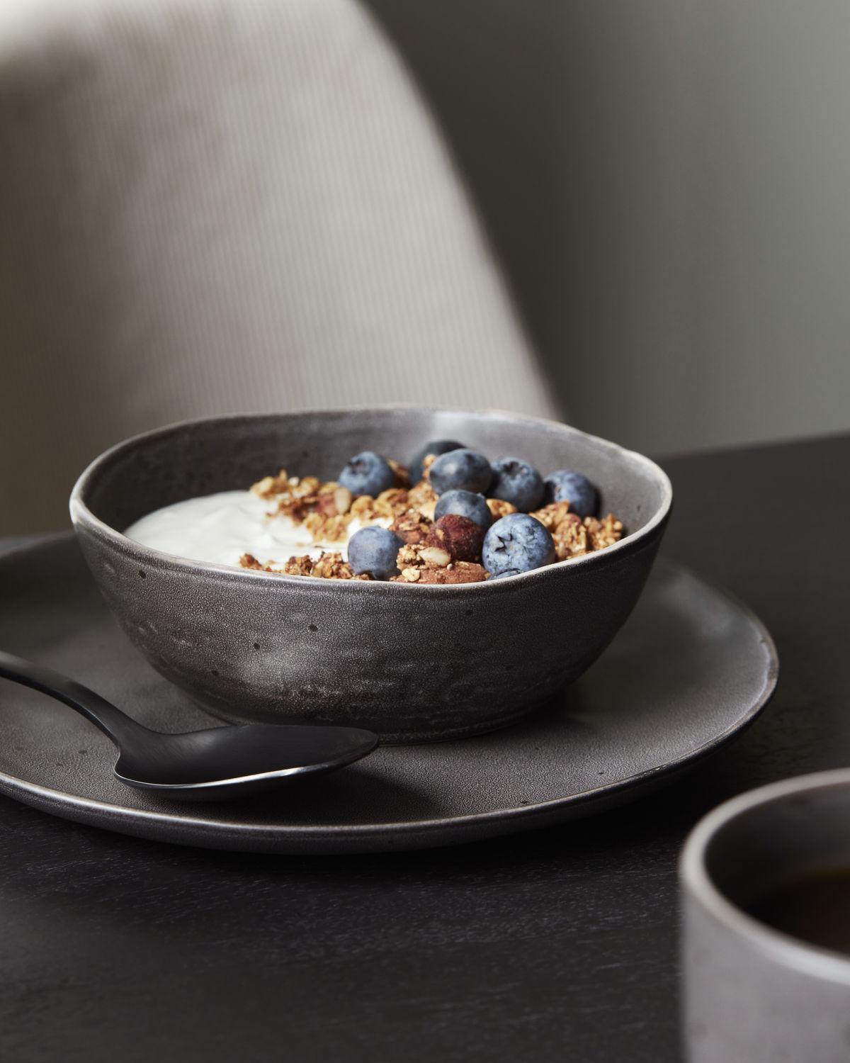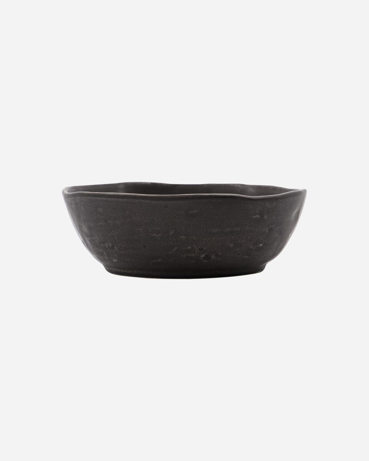Vakker steintøyskål fra House Doctor. Den har en mørkegrå glans med harmoniske prikker som gir glans når lyset treffer det. Skålen har en enkel, detaljert design som skiller seg ut og løfter borddekkingen.