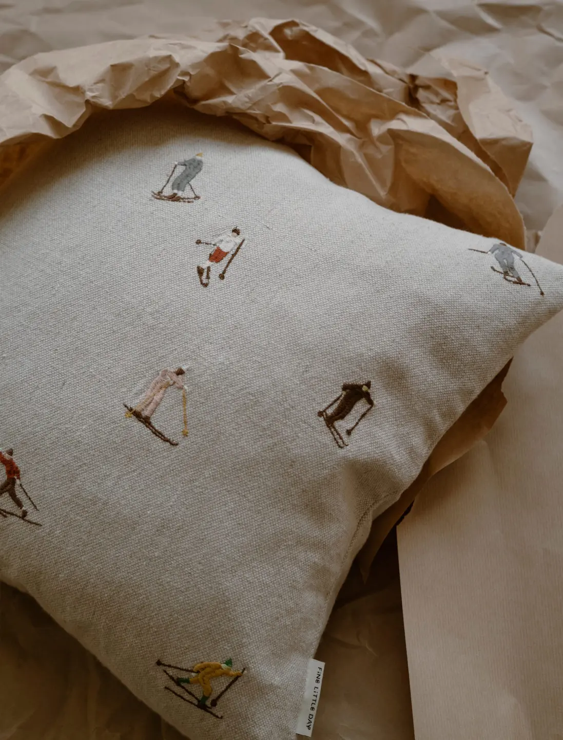 Brodert putetrekk med Fine Little Days kunstverk Skiers. Vintersport, frisk luft og fart på et tungt linlerret.